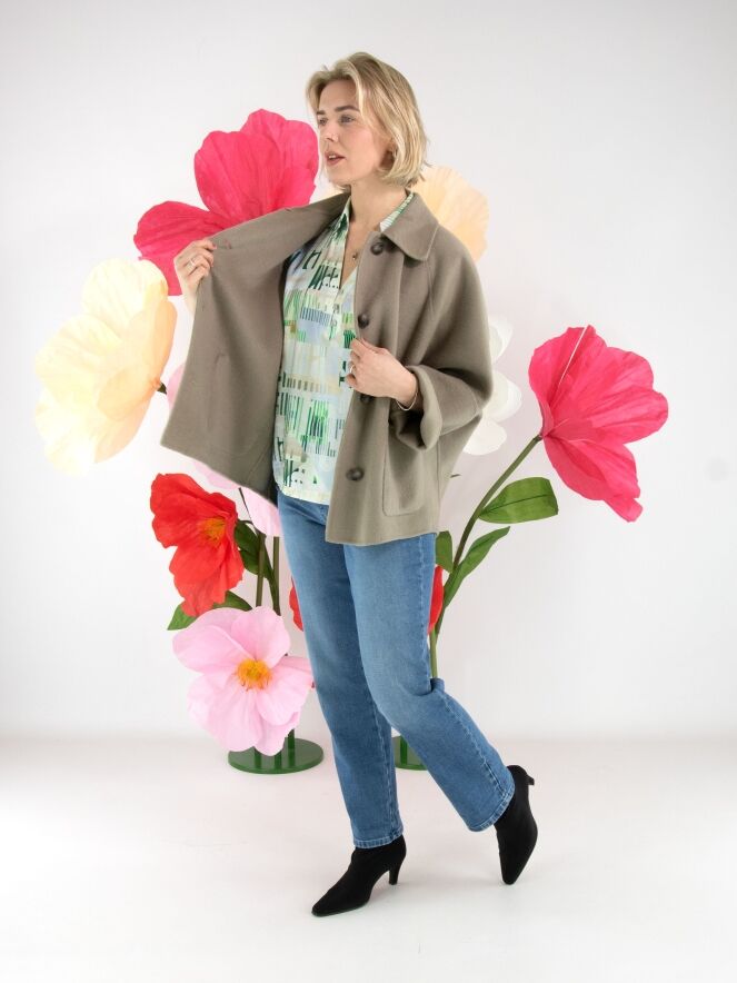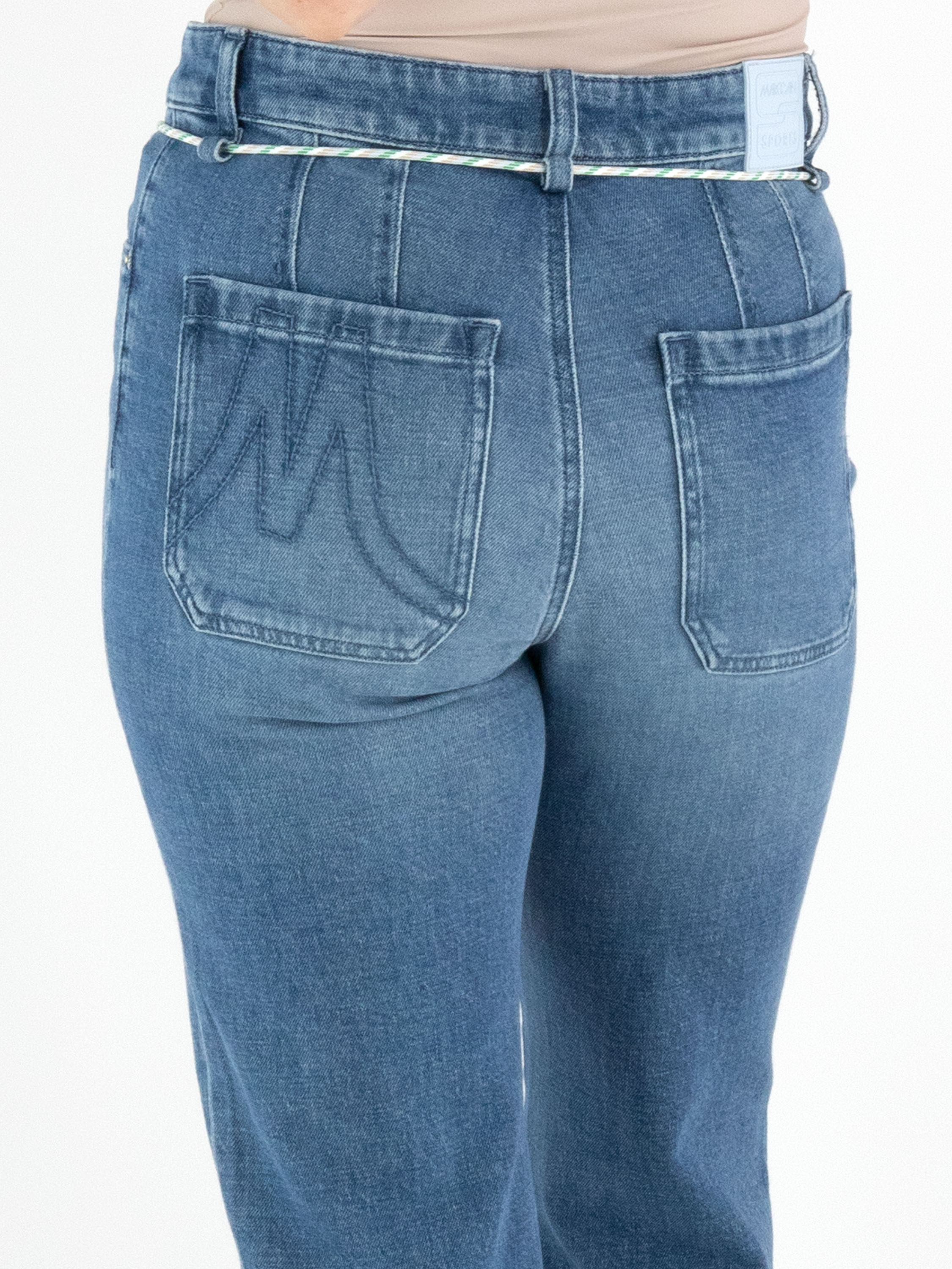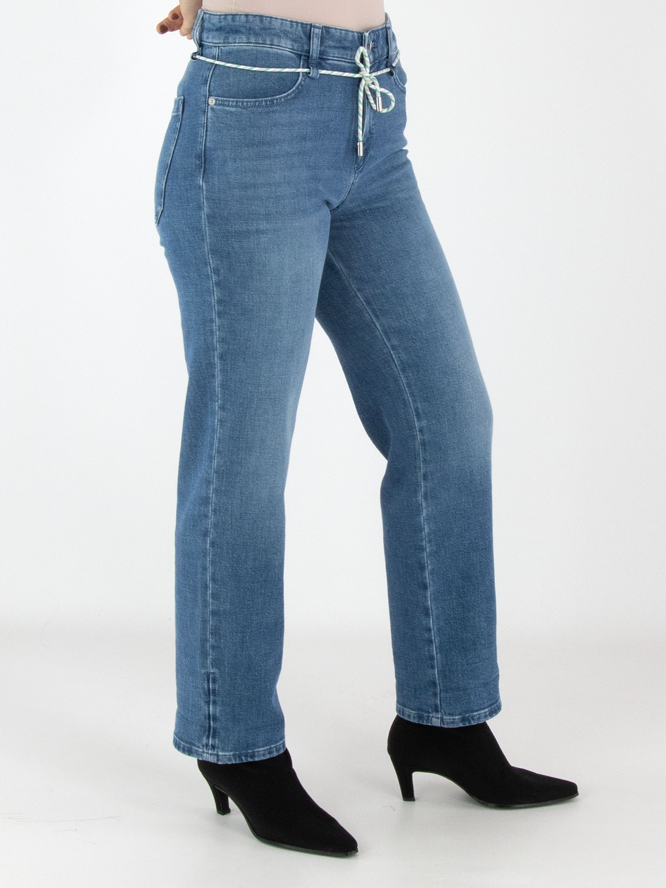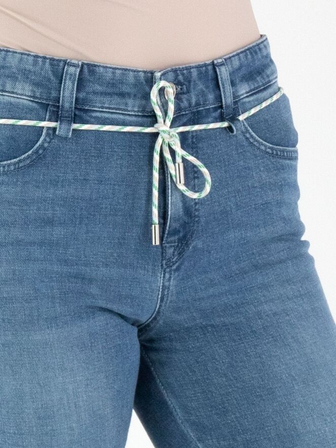 Un jean de Marc Cain dans une teinte denim classique. Sous la ceinture, un cordon décoratif est appliqué dans les tons vert, sable et blanc. Le jean présente un revers et peut être lavé à 30 degrés.
