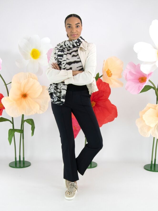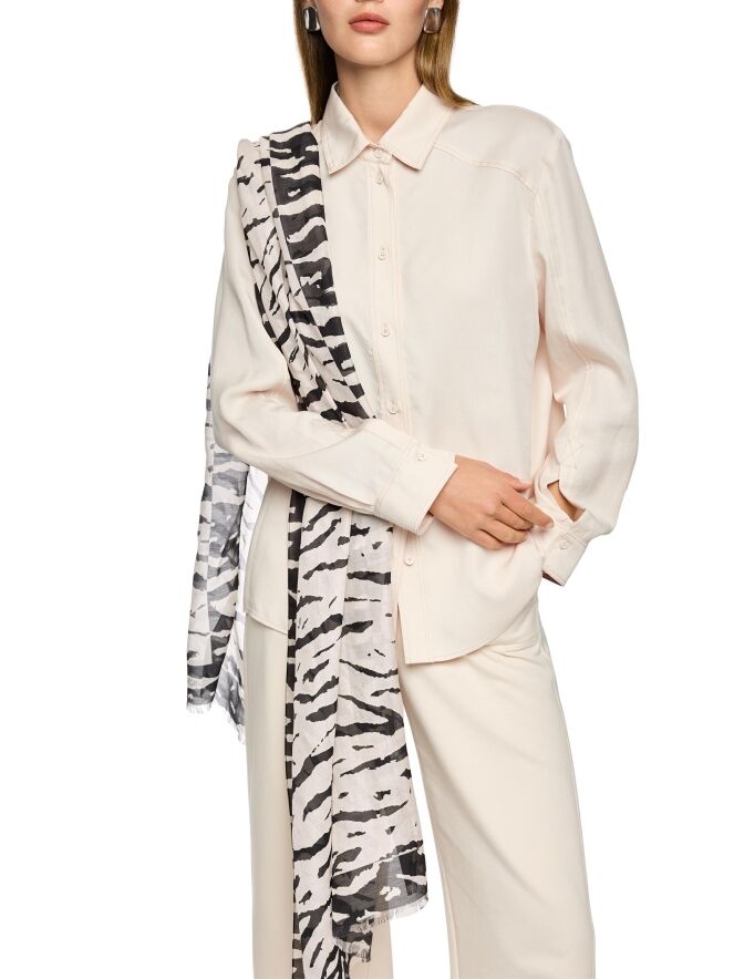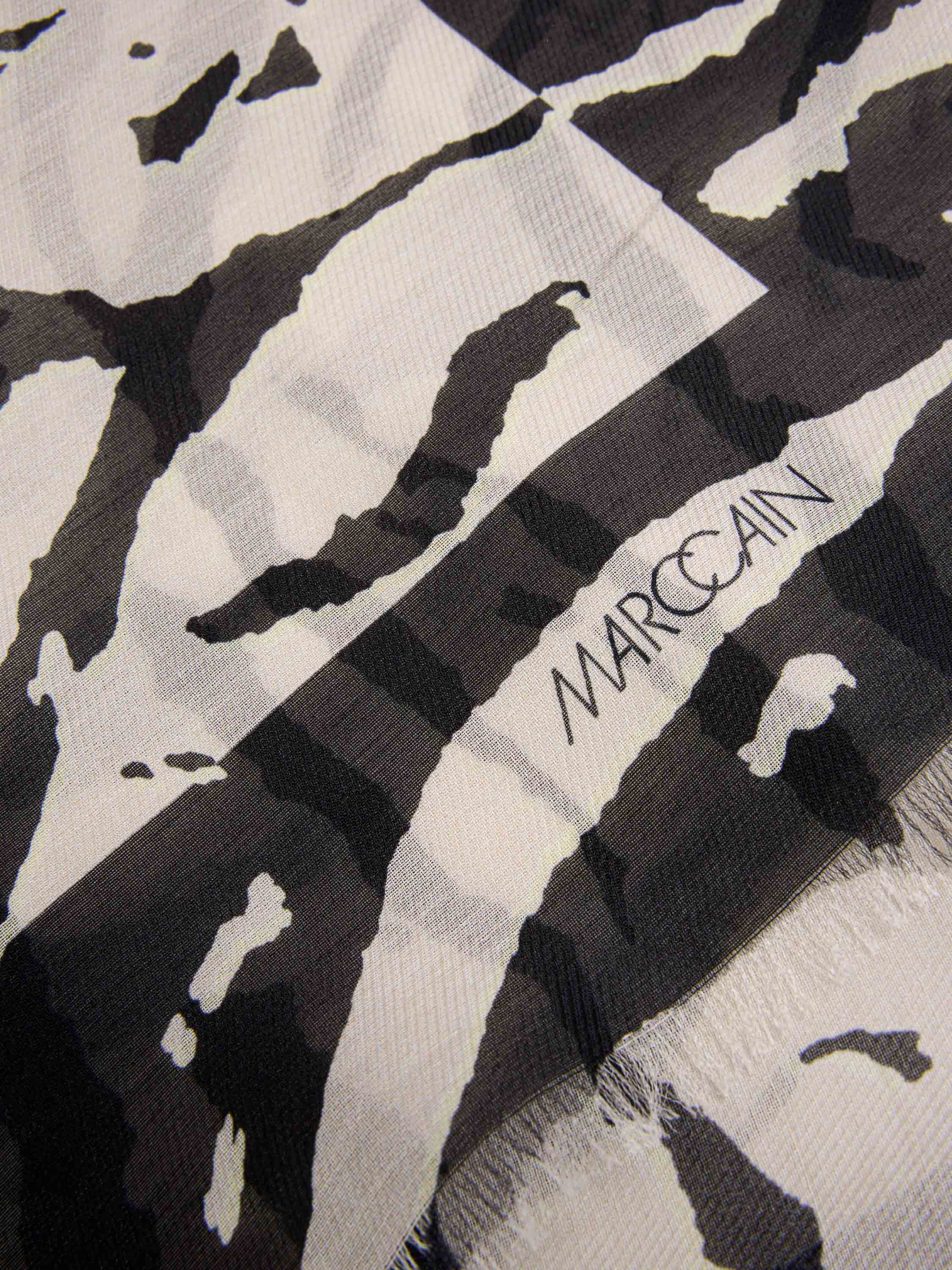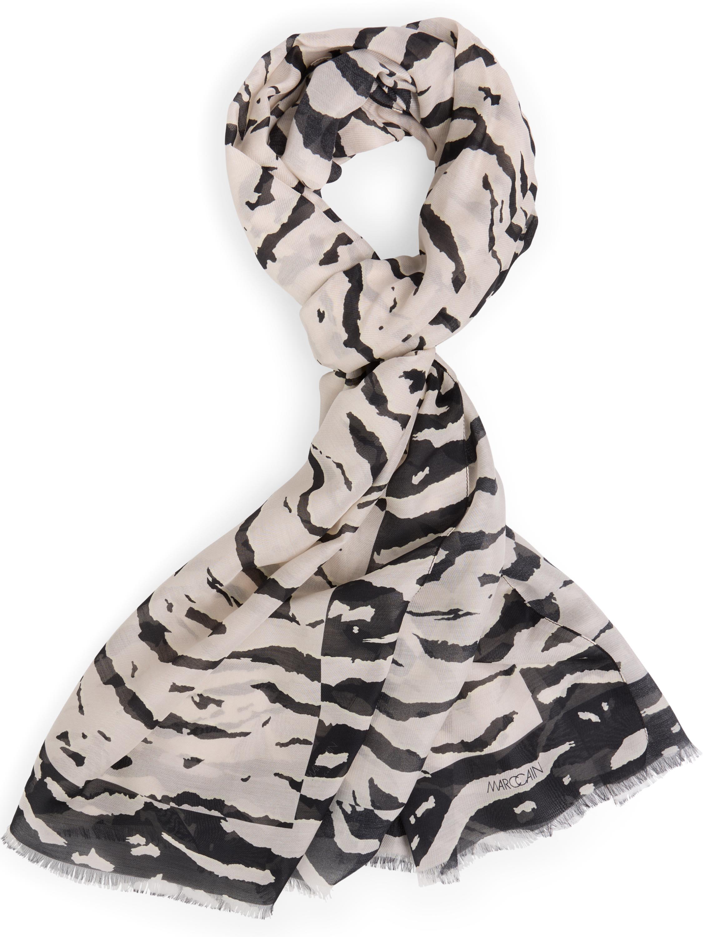 Un châle légèrement transparent de Marc Cain à imprimé zèbre en noir et beige. Le bord est souligné d’une large bande où l’imprimé est inversé recto verso. Les extrémités du châle sont délicatement effilochées. Ce châle peut être lavé à la main.