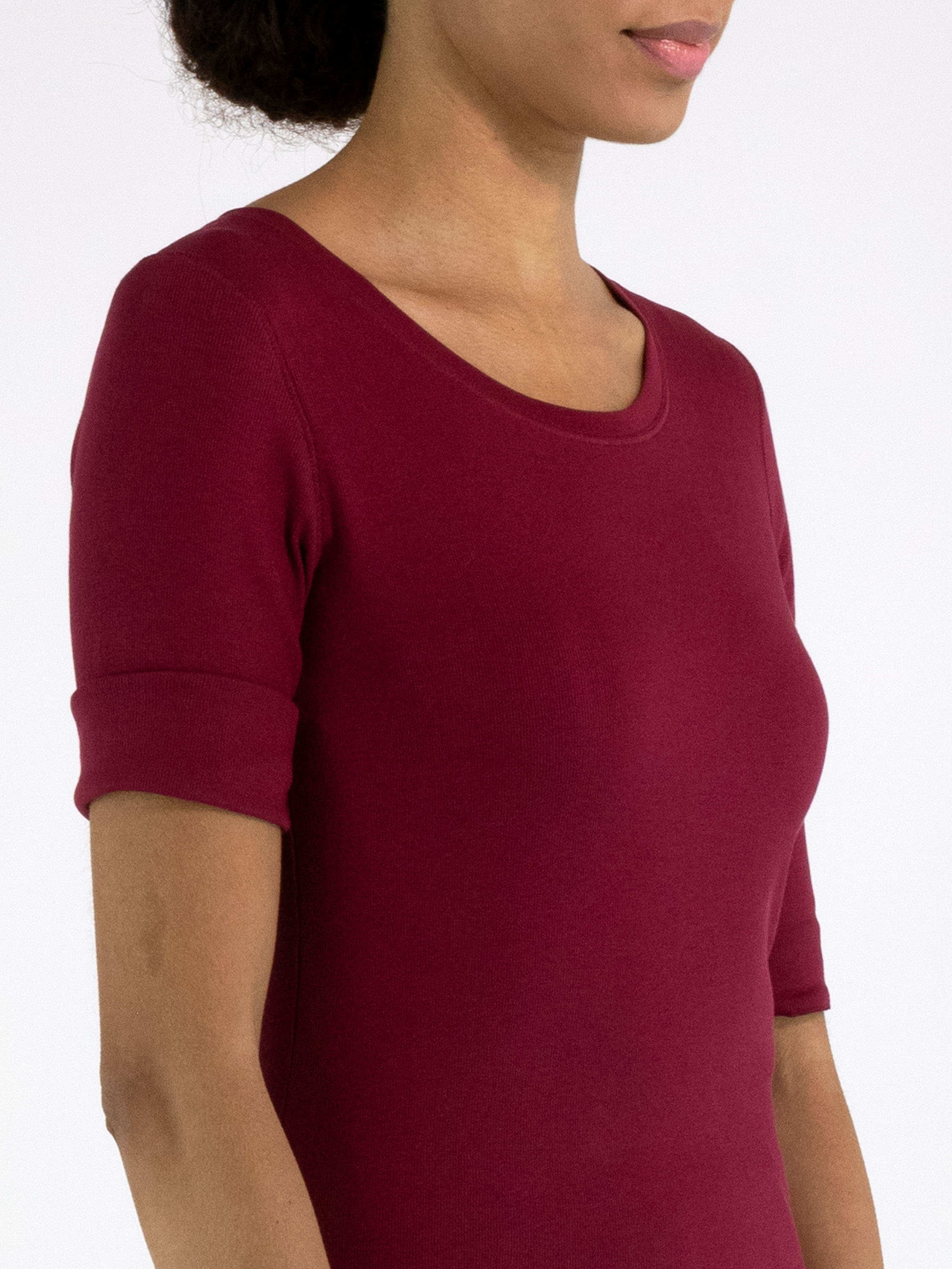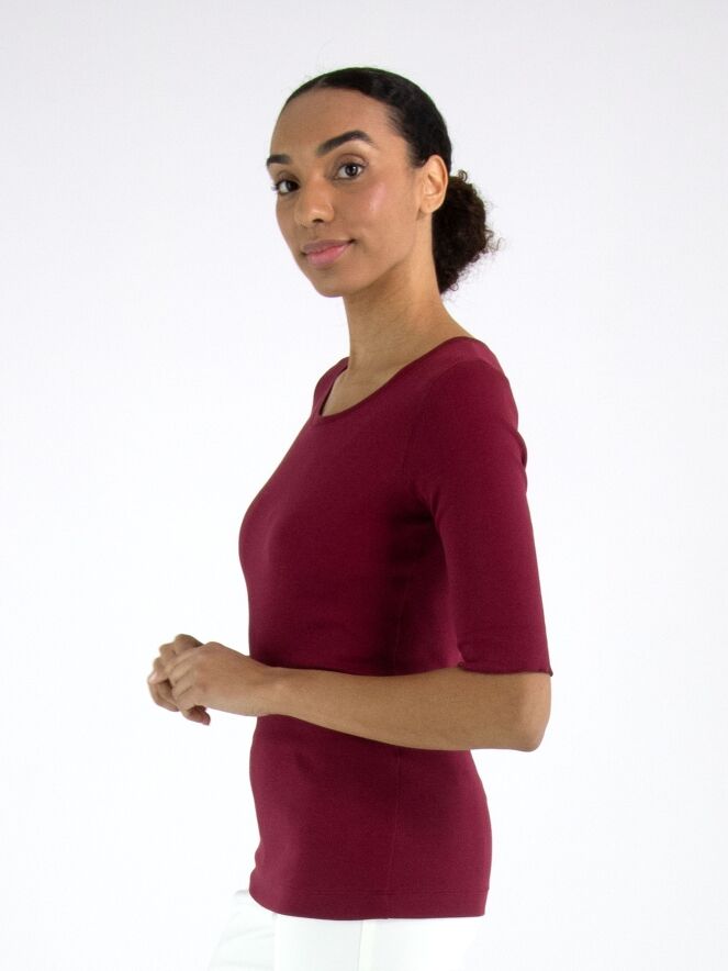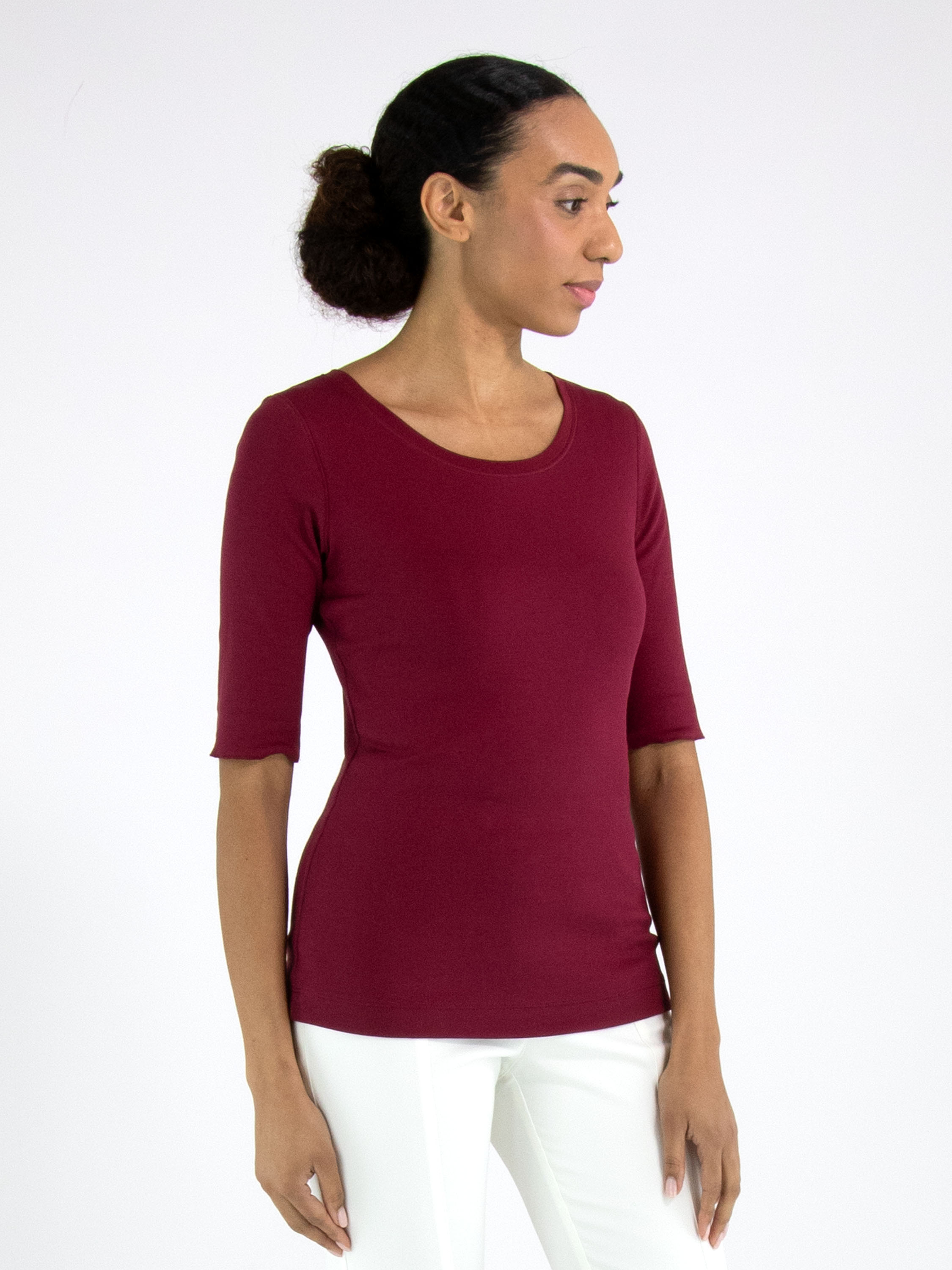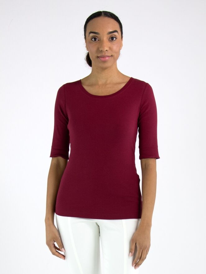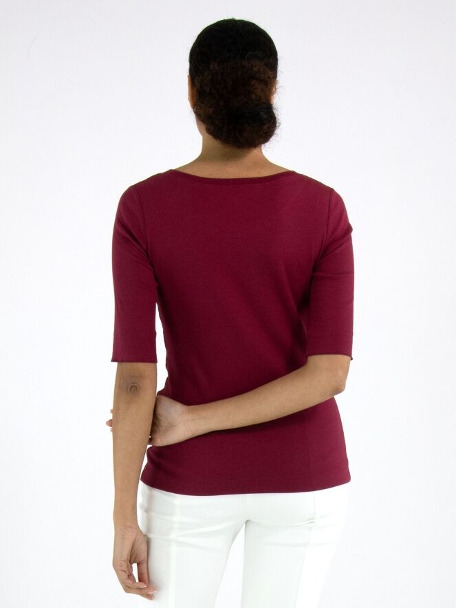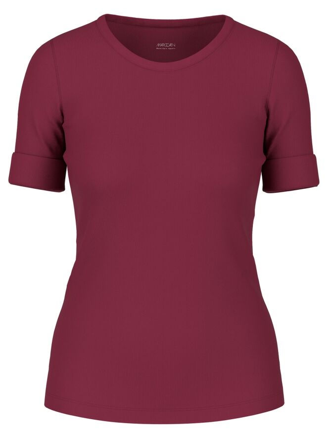 Un shirt de Marc Cain en tissu finement côtelé de couleur bordeaux. Le shirt possède un col rond et des manches courtes avec revers. Ce shirt peut être lavé à 30 degrés.