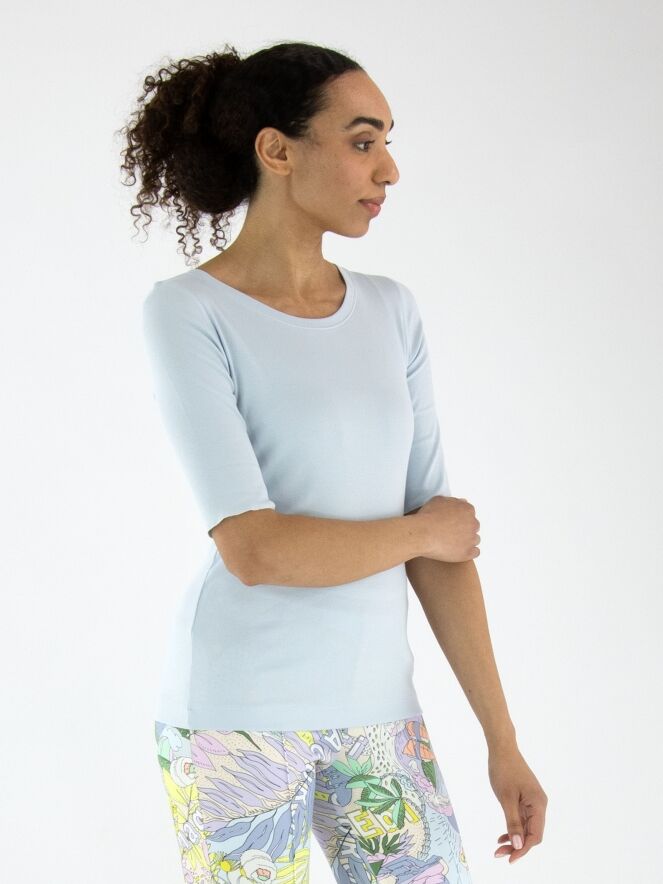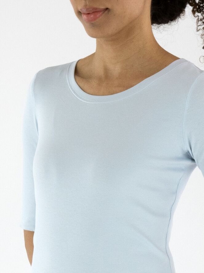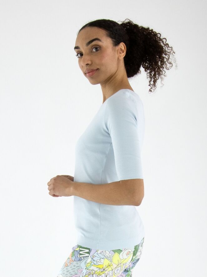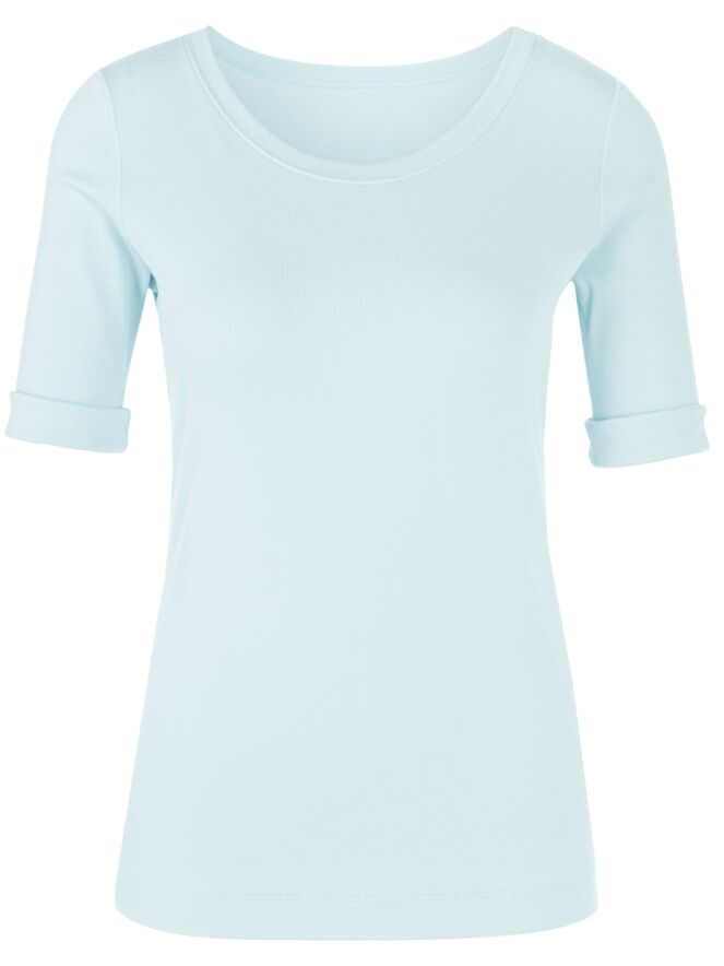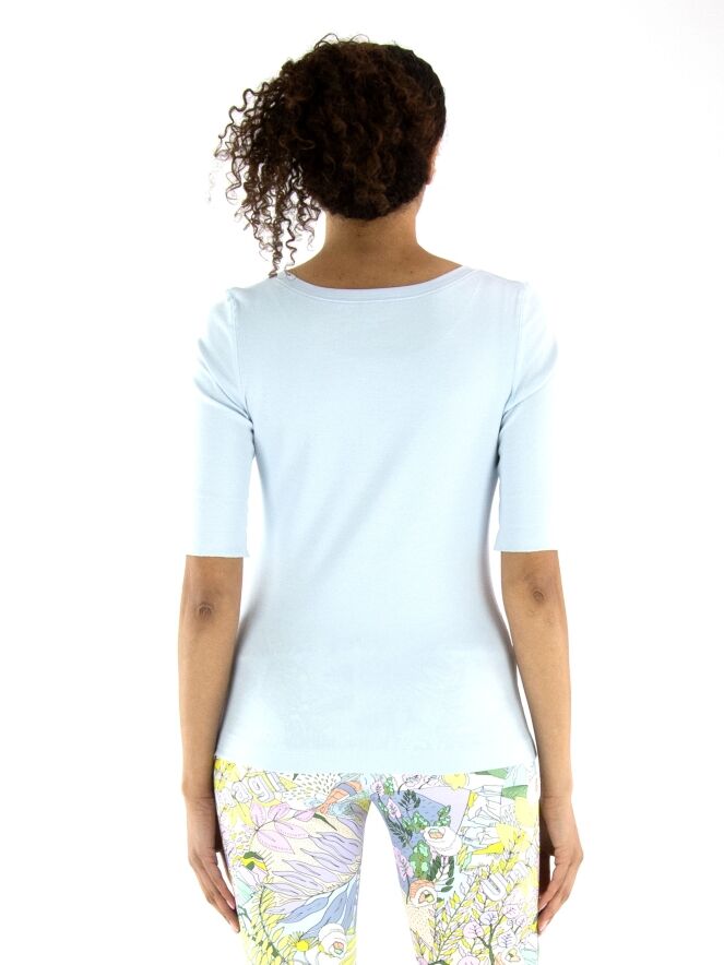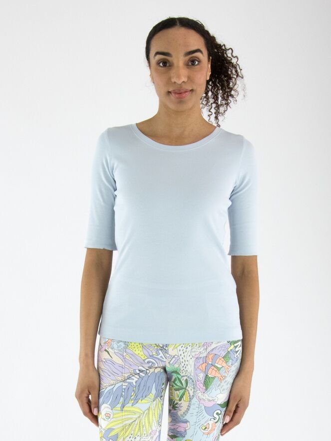 Un shirt de Marc Cain en bleu pastel. Les manches courtes ont un revers. Ce shirt possède un col rond et peut être lavé à 30 degrés.