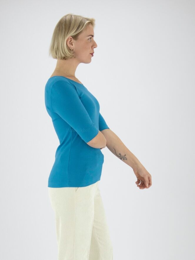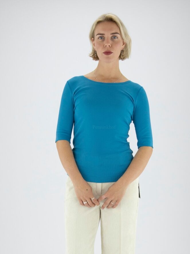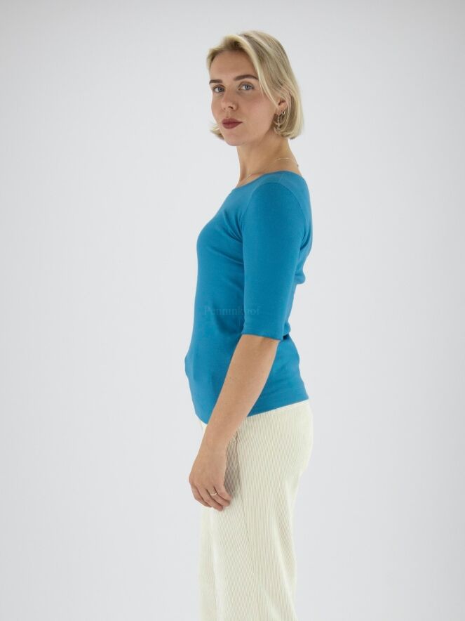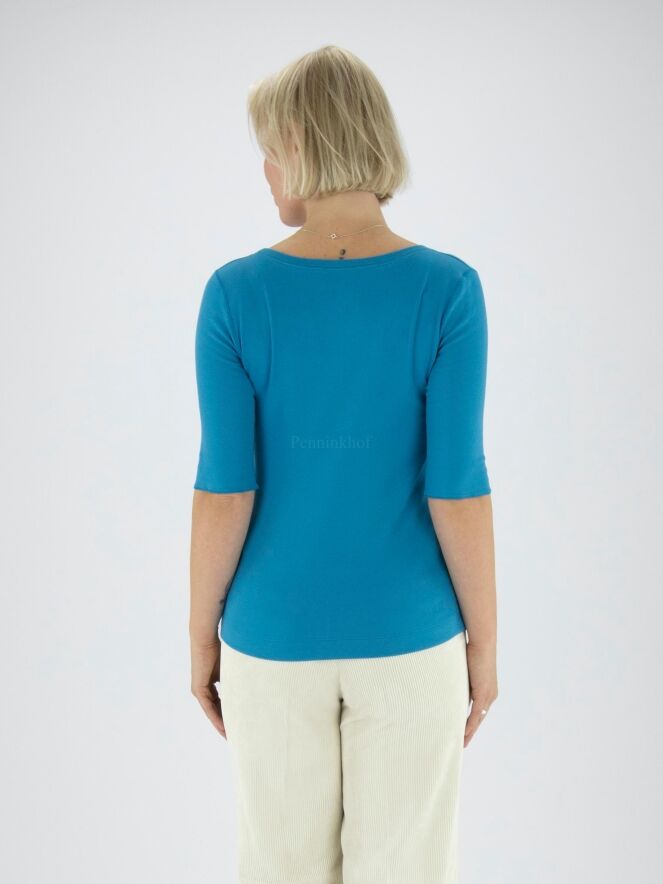 Une T - shirt de Marc Cain dans le coloris bleu. Les manches courtes sont retroussées. La T - shirt a un col rond et peut être lavée à 30 degrés.