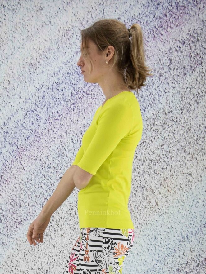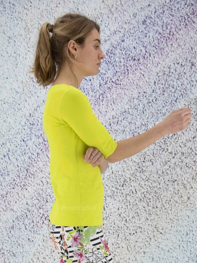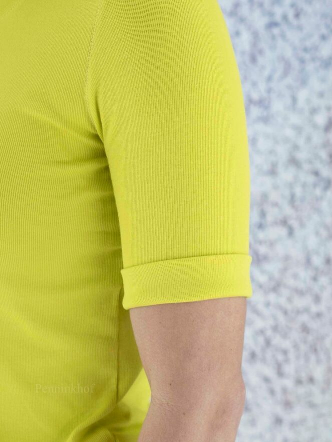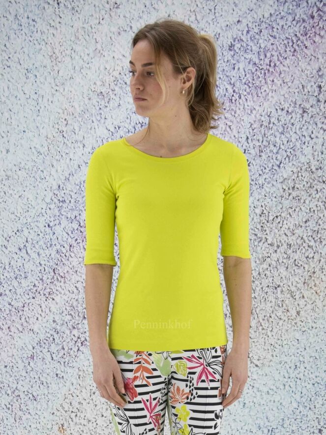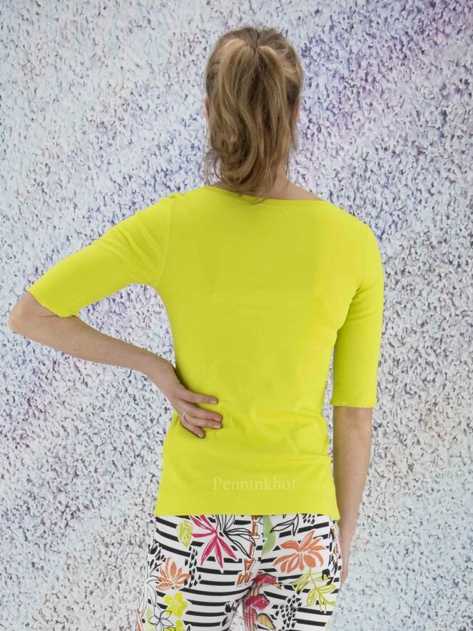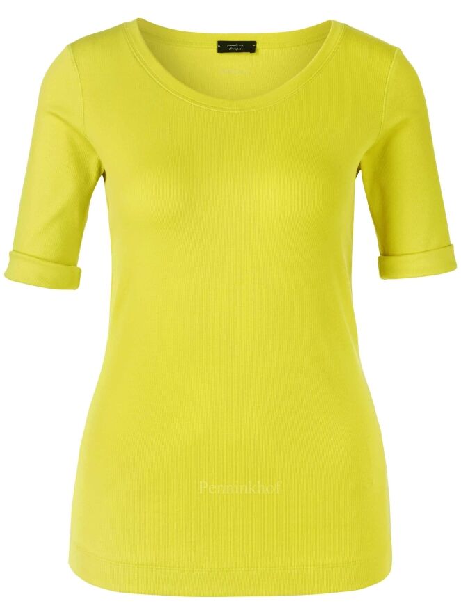 Tee-shirt de la marque Marc Cain, de couleur verte. La chemise présente un col rond et des manches courtes à revers. Lavage à 30 degrés.