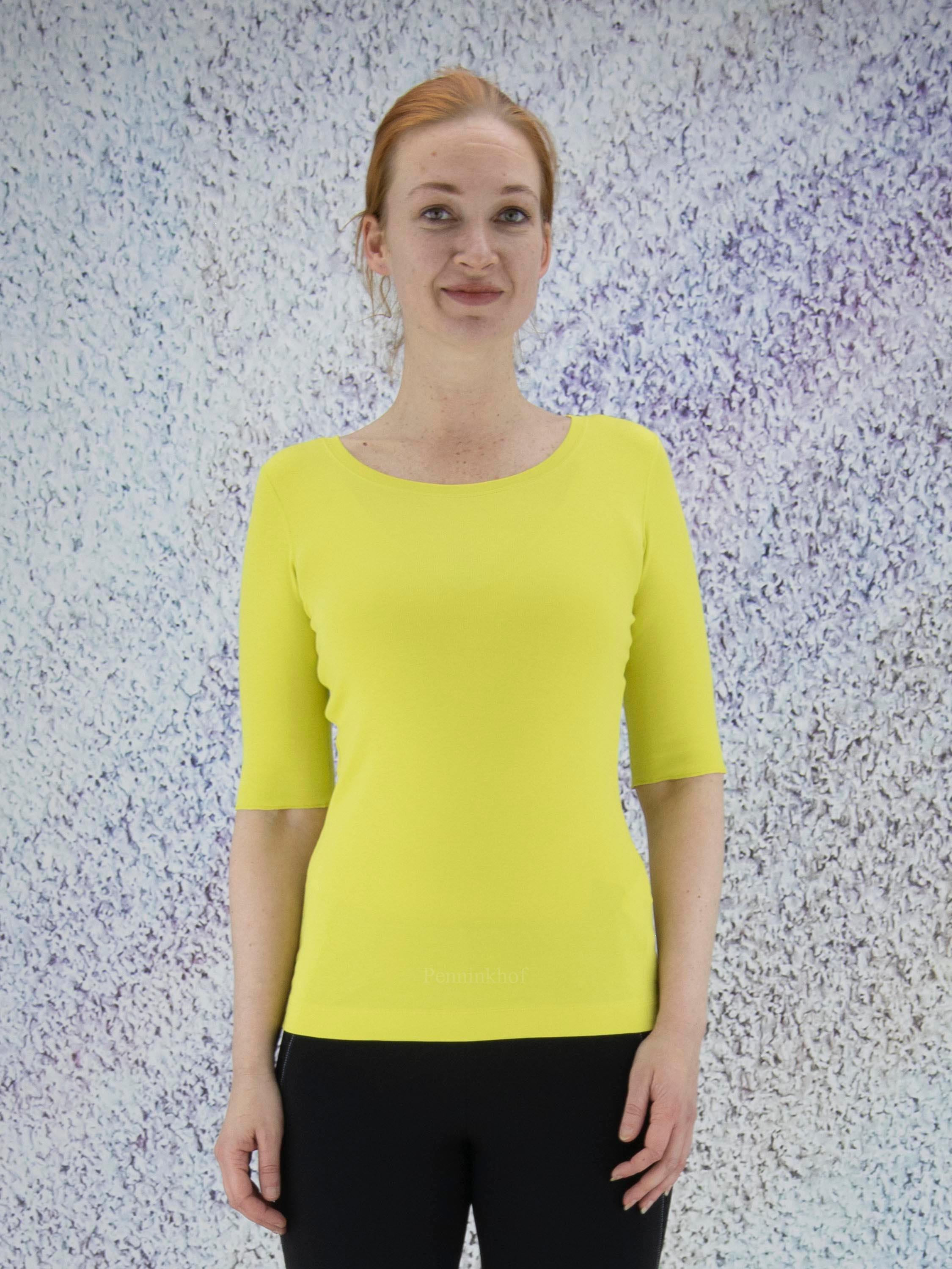 Tee-shirt de la marque Marc Cain, en coton très finement côtelé de couleur jaune citron. Encolure ronde et manches courtes à bords très légèrement roulottés. Lavage à 30 degrés.