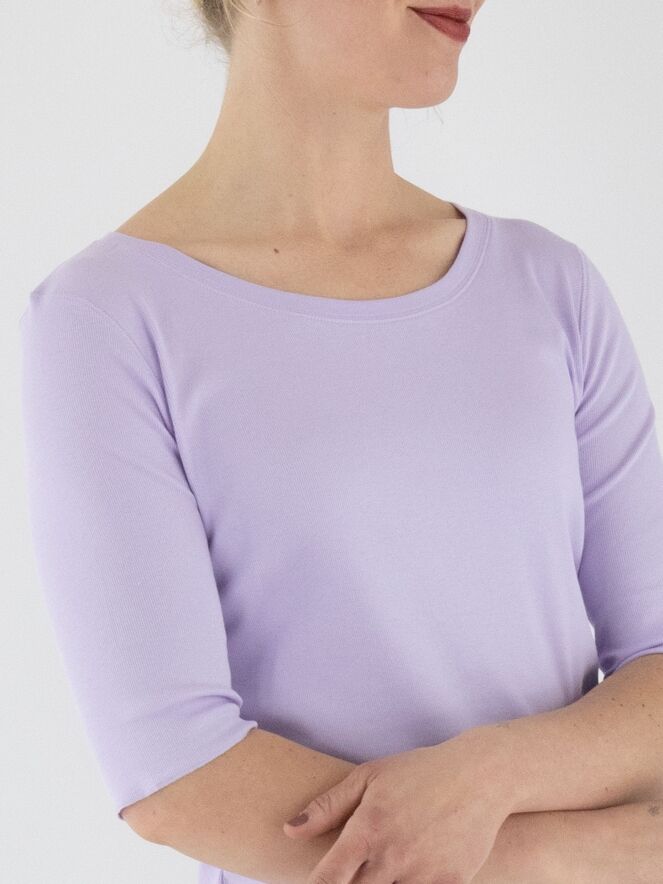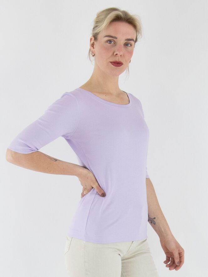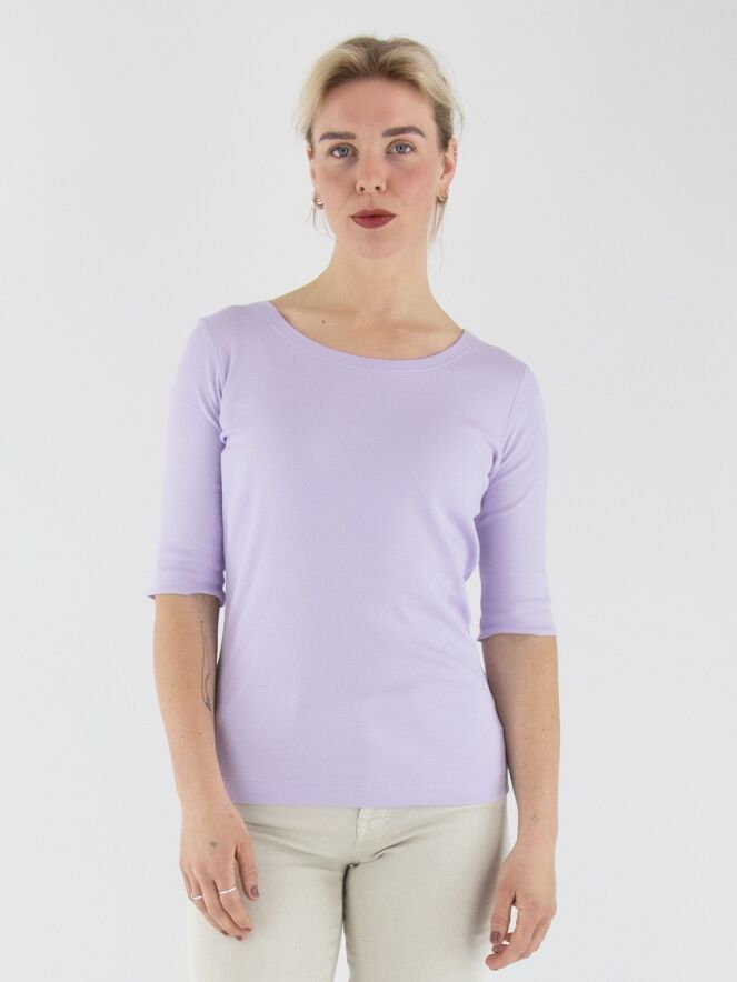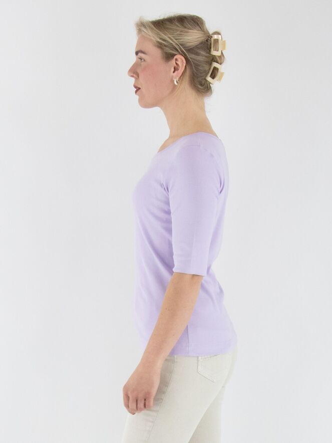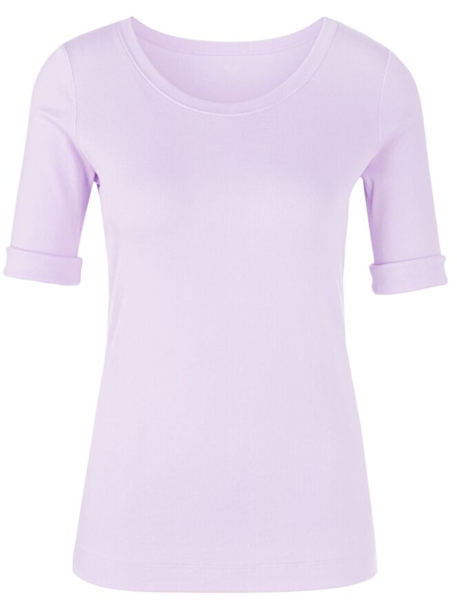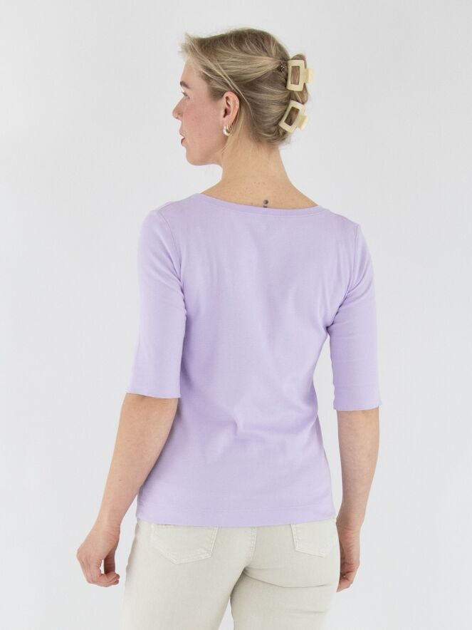 Un shirt de Marc Cain en lilas. Les manches courtes ont un revers. Le shirt présente une encolure ronde et peut être lavé à 30 degrés.