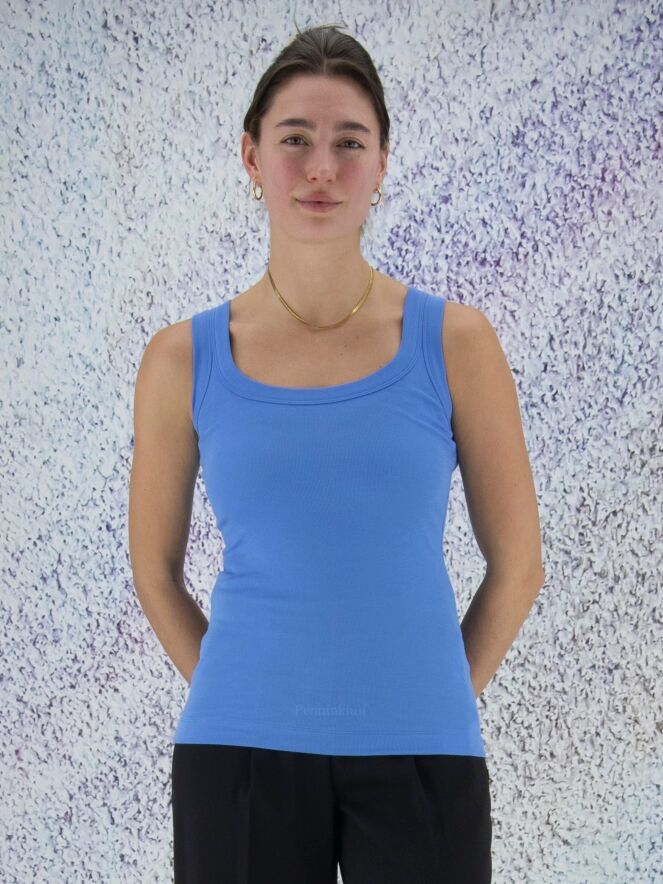 Débardeur finement côtelé de la marque Marc Cain, de couleur bleue. Il présente un col rond. Lavage à 30 degrés.