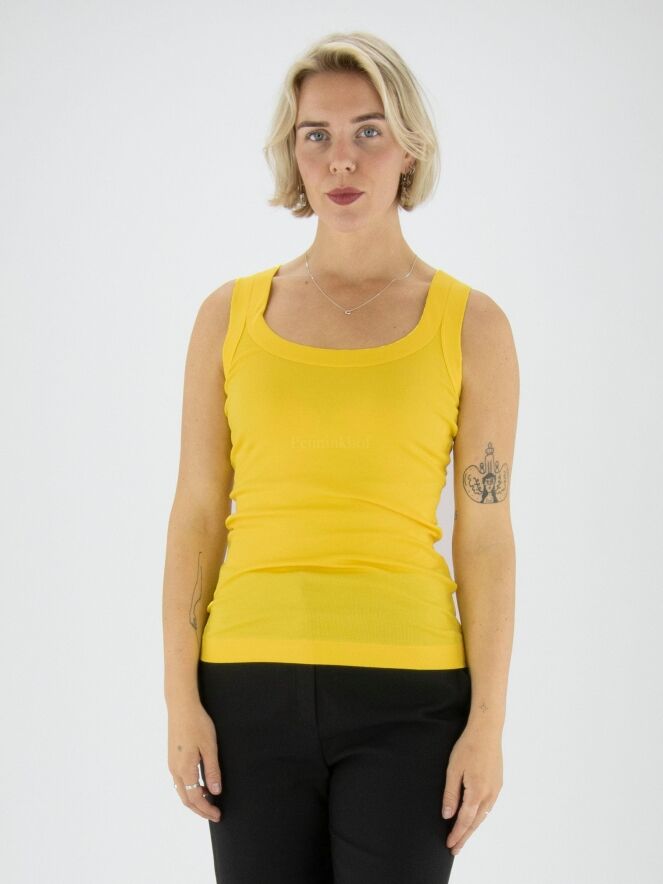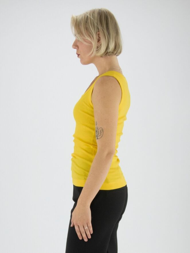 Un top de Marc Cain de couleur jaune. Le top a une encolure ronde et le tissu est finement côtelé. Ce top peut être lavé à 30 degrés.