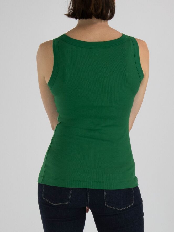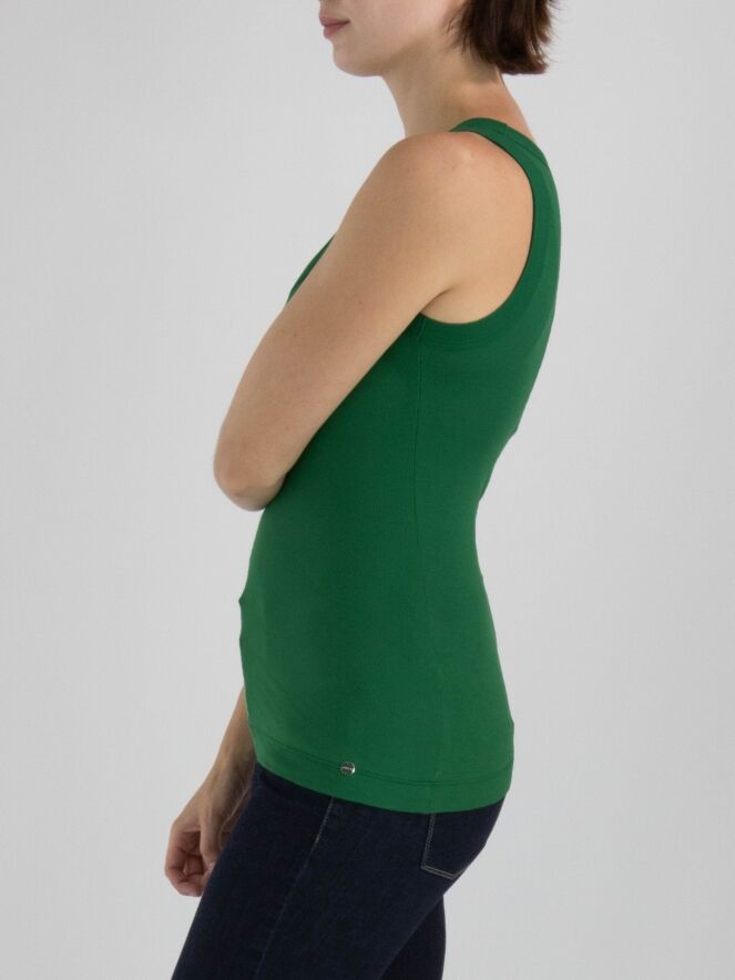 Un top de Marc Cain de couleur vert foncé. Le top a une encolure ronde et le tissu est finement côtelé. Ce top peut être lavé à 30 degrés.
