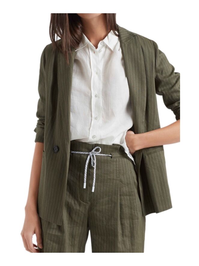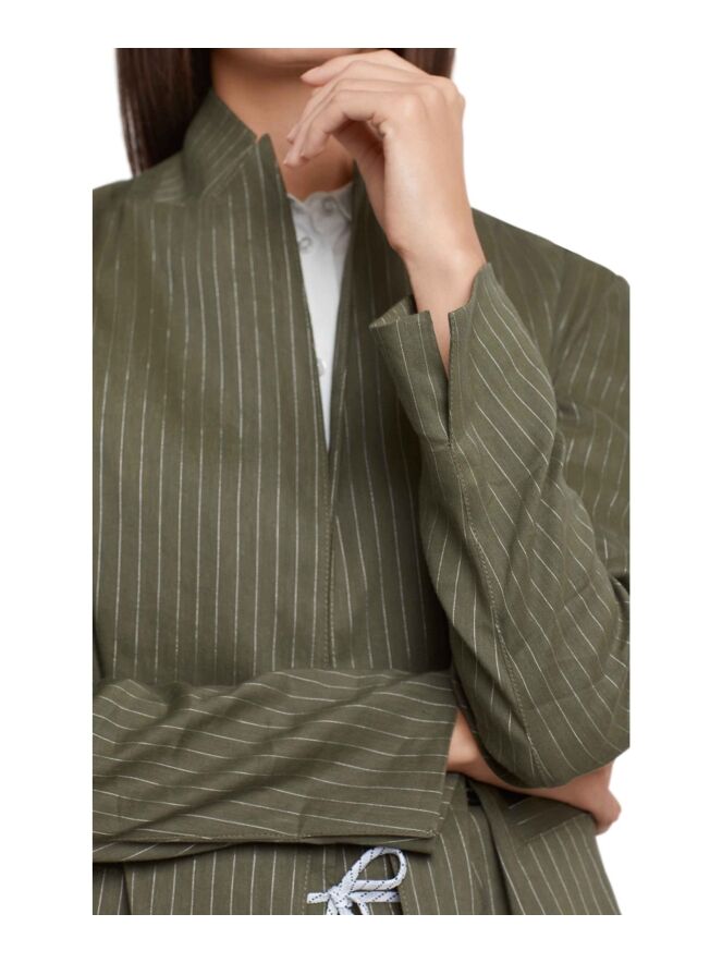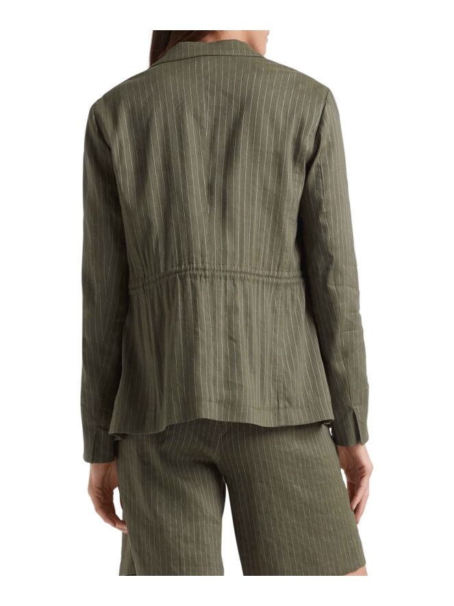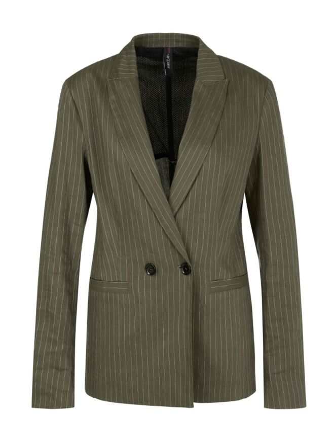 Veste à fermeture croisée de la marque Marc Cain, à fines rayures blanches sur un fond vert olive. Dans le dos, la veste présente une couture horizontale au niveau de la taille. Elle est dotée de poches fentes sur le devant. Modèle à moitié doublé. Lavage à 30 degrés.