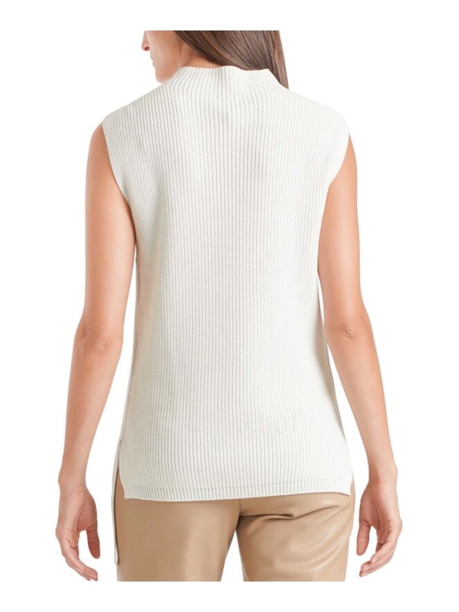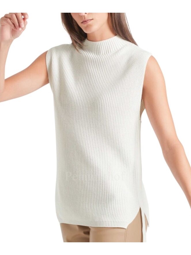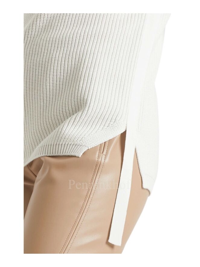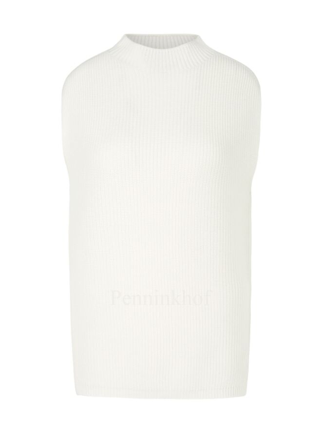 Pull sans manches de la marque Marc Cain, de couleur blanc crème. Ce pull en maille présente un col tricoté, des fentes latérales et un ruban décoratif asymétrique. Lavage à 30 degrés.