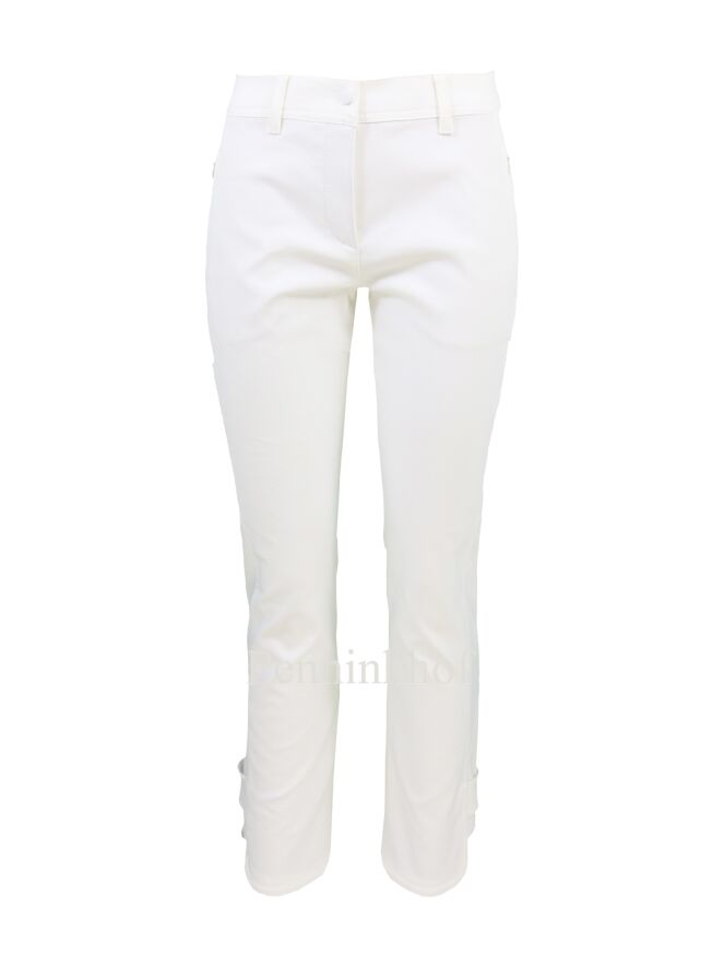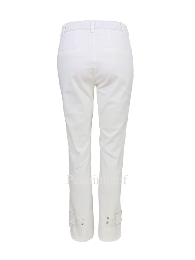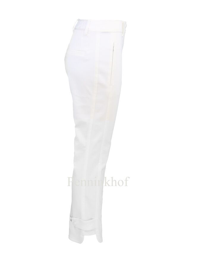 Pantalon au look sportif de la marque Marc Cain, de couleur blanc cassé. Les poches latérales sont équipées d'un zip fin pris dans la couture. Le bas des jambes est orné d'une patte à boutons-pression. Lavage à 30 degrés.