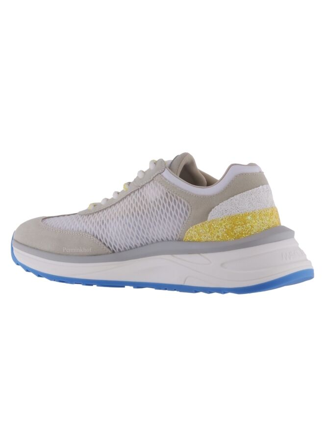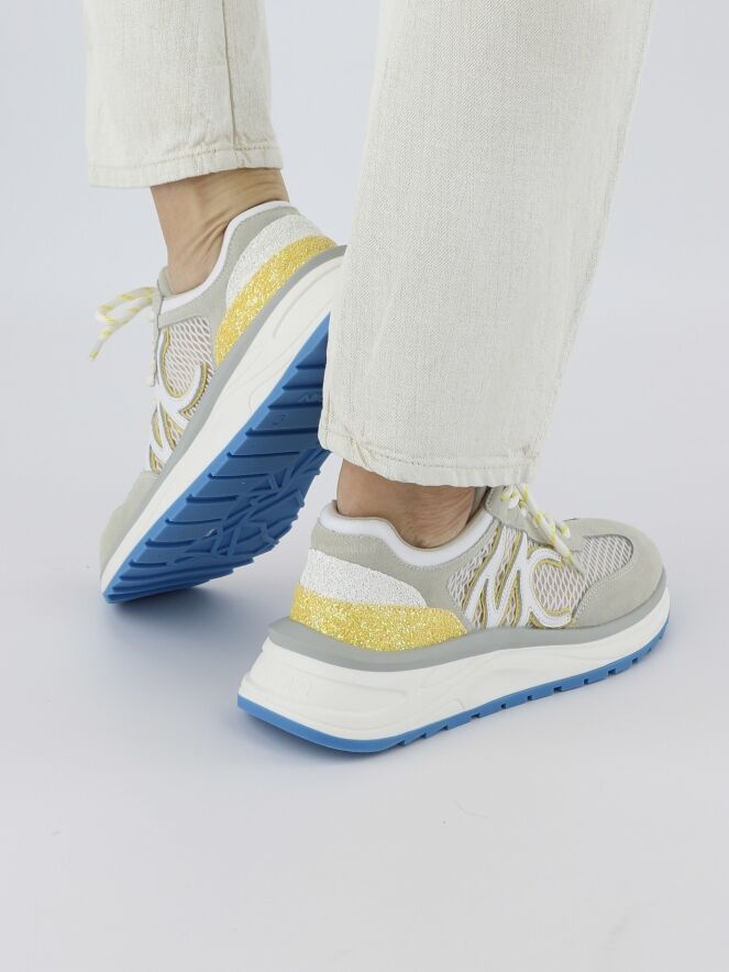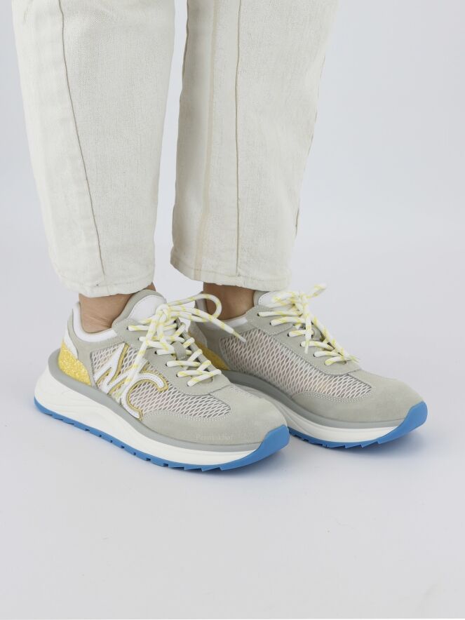 Sneaker de la marque Marc Cain. La chaussure est composée d'une alternance de daim et de mesh aux nuances de gris et de blanc crème. Le talon est couvert par une bande en strass jaune et blanc et les côtés sont ornés par un gros lettrage blanc des initiales MC. La semelle est de couleur blanche avec une fine couche crantée de couleur bleue. La semelle intérieure est amovible.