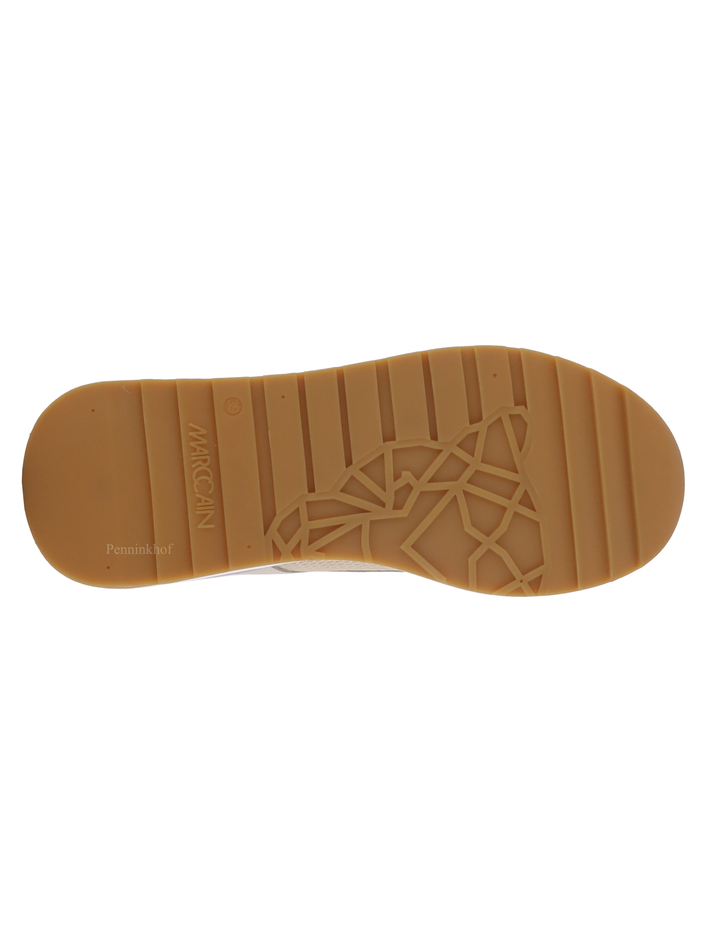 Sneaker de la marque Marc Cain, de couleur sable. Les côtés et l'avant-pied en mesh alternent avec le daim présent sur l'avant et l'arrière de la chaussure. Un élastique blanc crème sur les côtés intérieur et extérieur maintient le talon à la languette avant. Un lacet décoratif en cordon blanc permet un léger reserrage. La semelle intérieure est amovible.