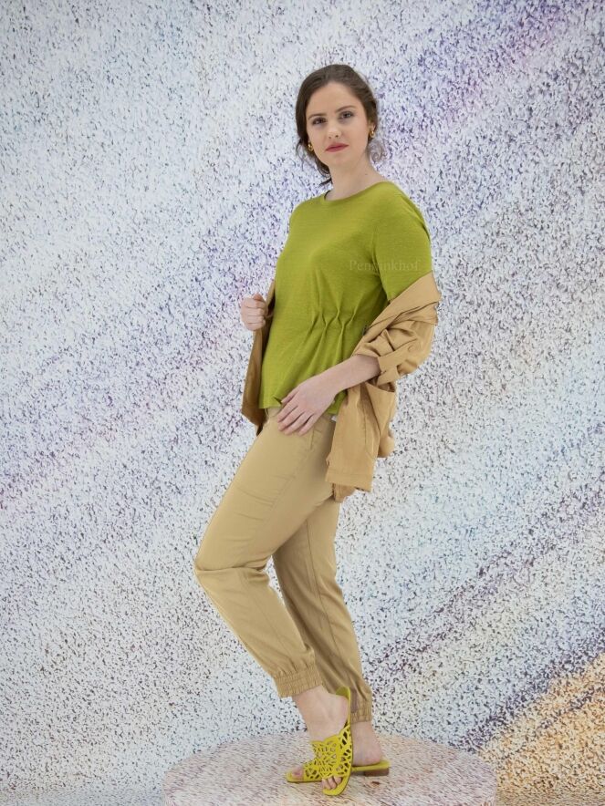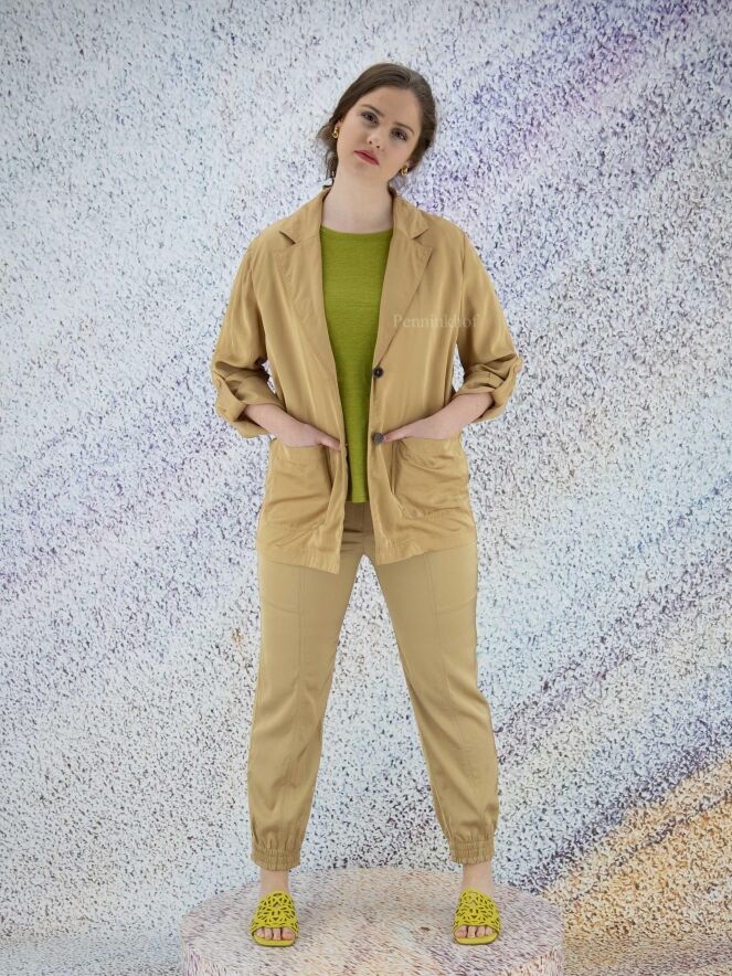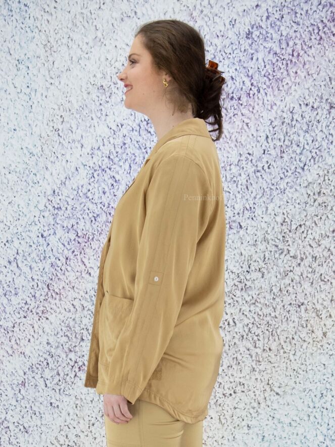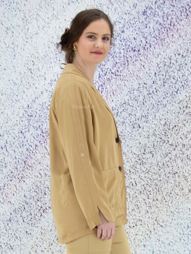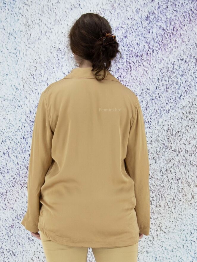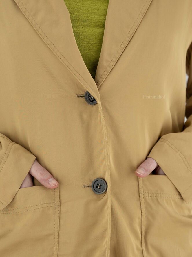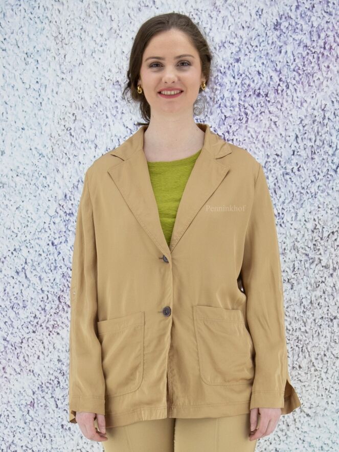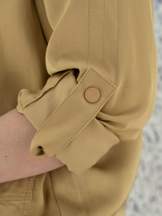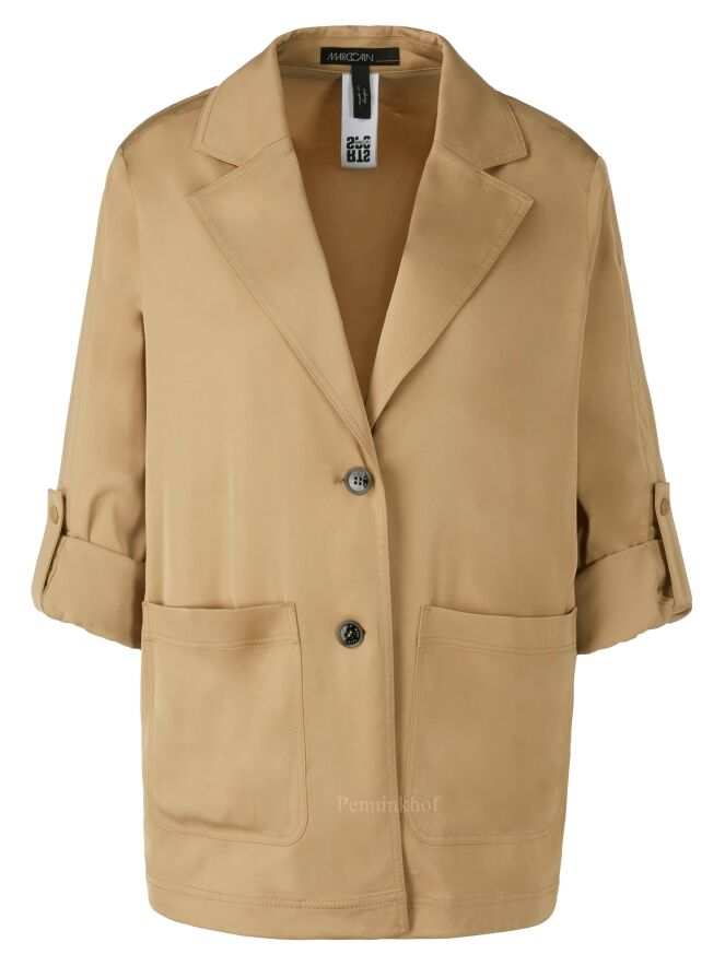 Veste ample à manches retroussables, de la marque Marc Cain, en tissu satiné de couleur taupe. L'encolure à revers de cette veste se prolonge sur une fermeture à deux boutons. Les manches sont munies d'un ruban à bouton pression permettant d'en remonter le bas. La veste présente deux grandes poches avant. Elle n'est pas doublée. Lavage à la main.
