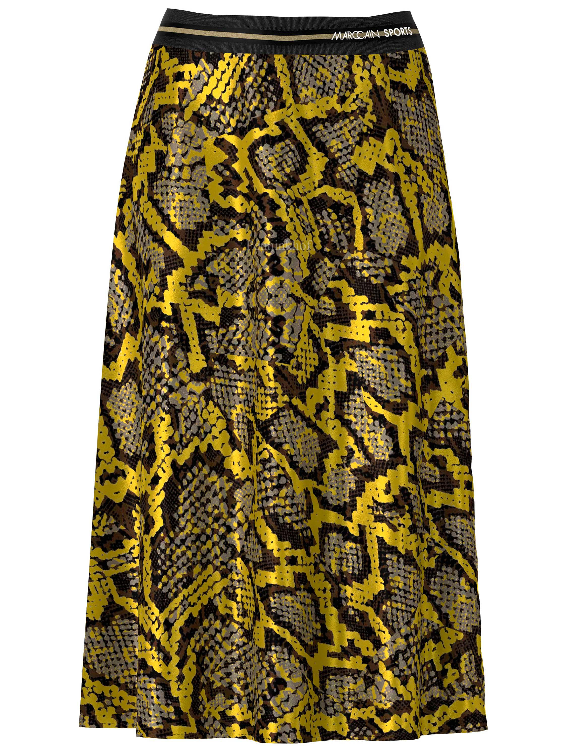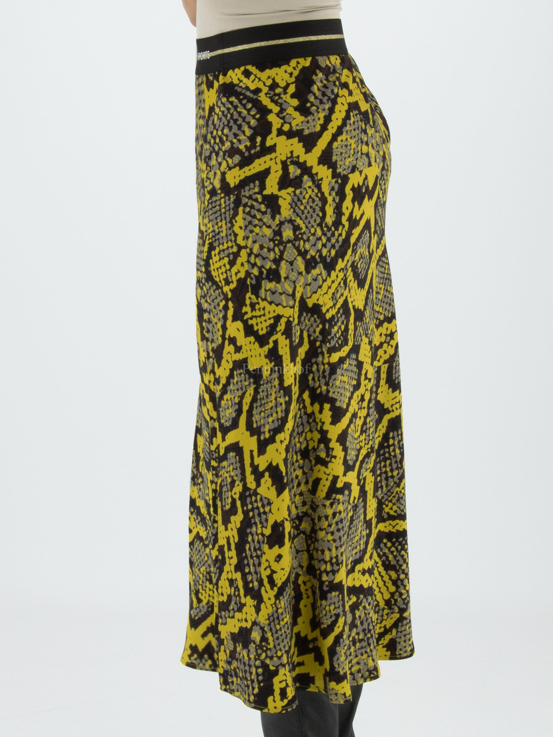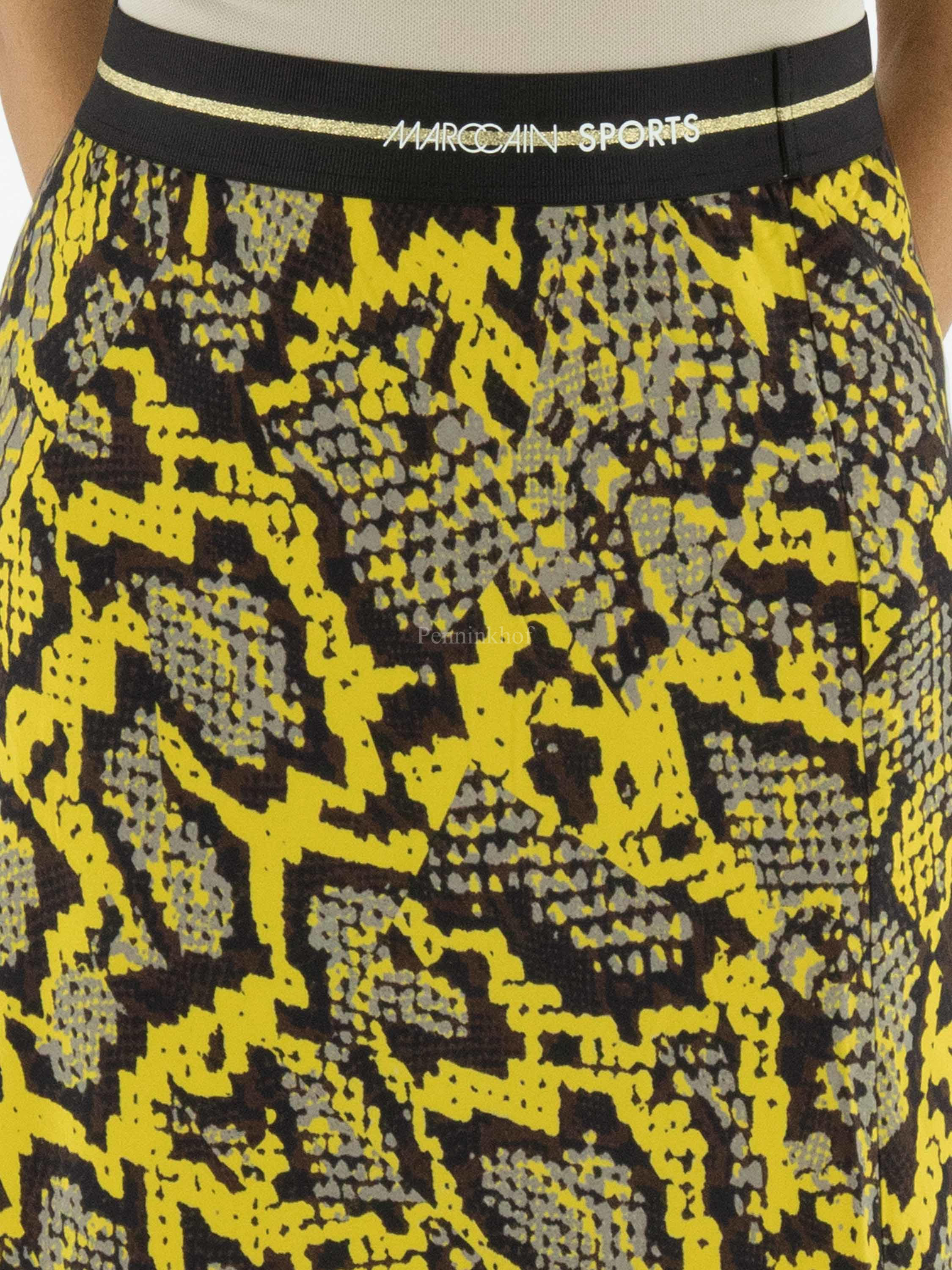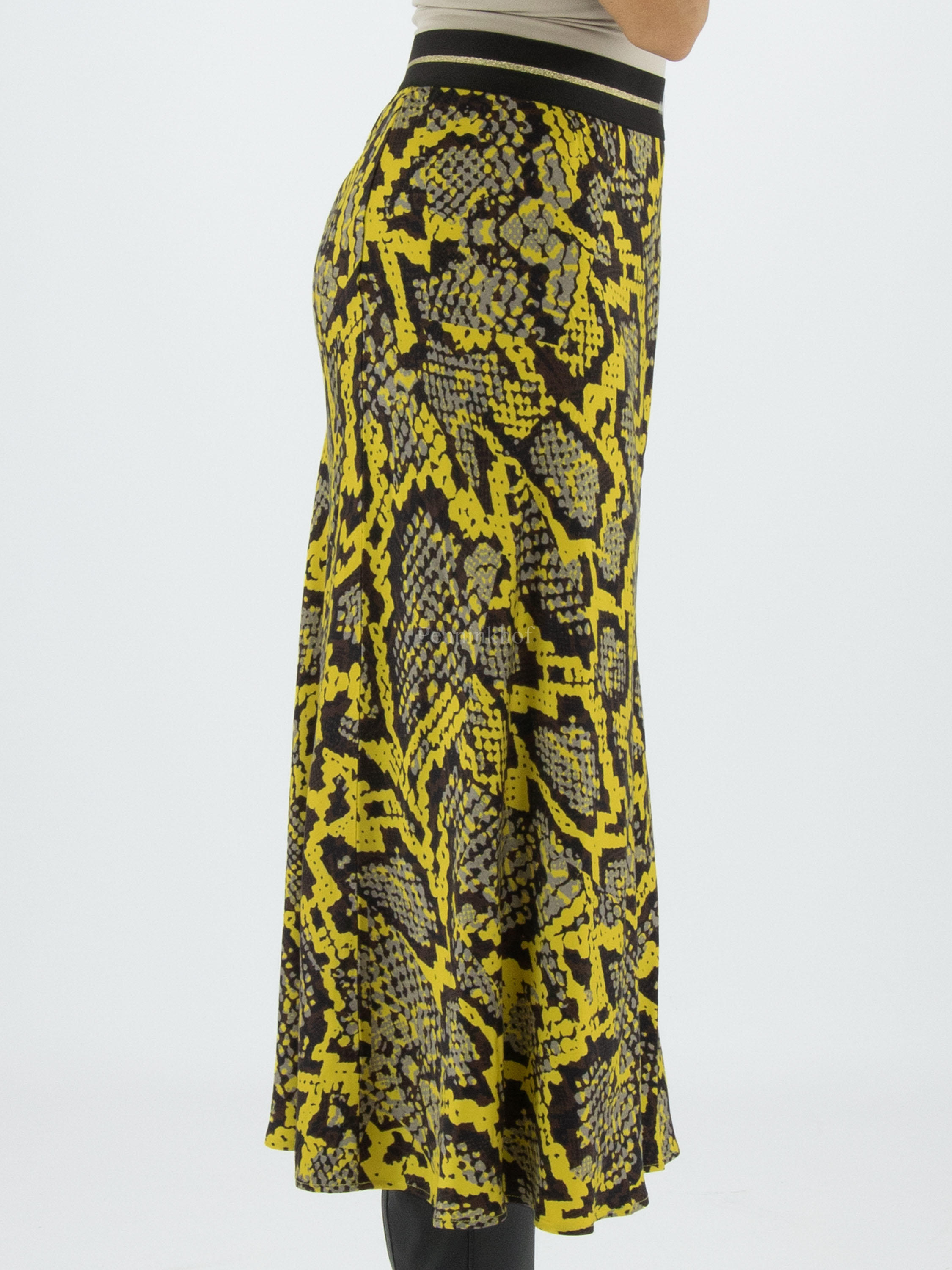 Jupe Marc Cain en imprimé reptile aux couleurs jaune, noir et gris. Une bande élastique noire se trouve à la taille. La jupe a une légère ligne A et n'est pas doublée. Cette jupe peut être lavée à 30 degrés.