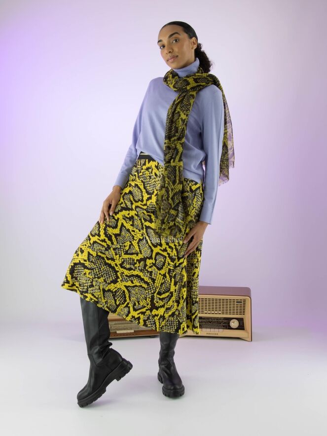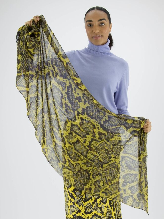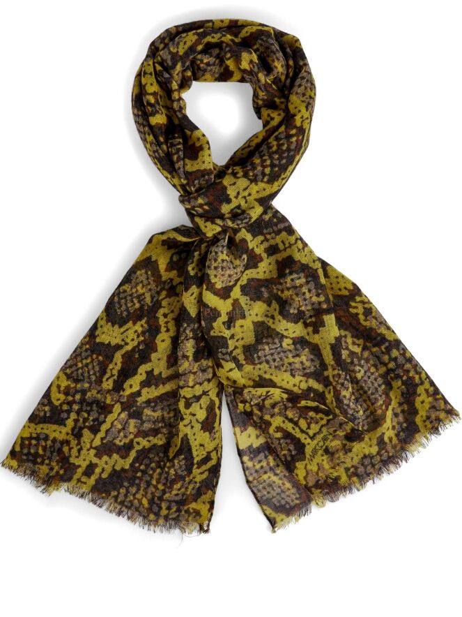 Echarpe Marc Cain légèrement transparente en imprimé reptile aux couleurs jaune, marron, gris et noir. Les extrémités de l'écharpe sont finement effilochées. Cette écharpe doit être lavée à la main.