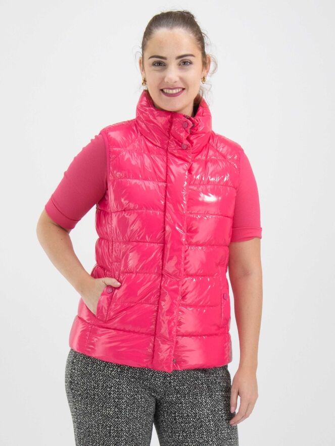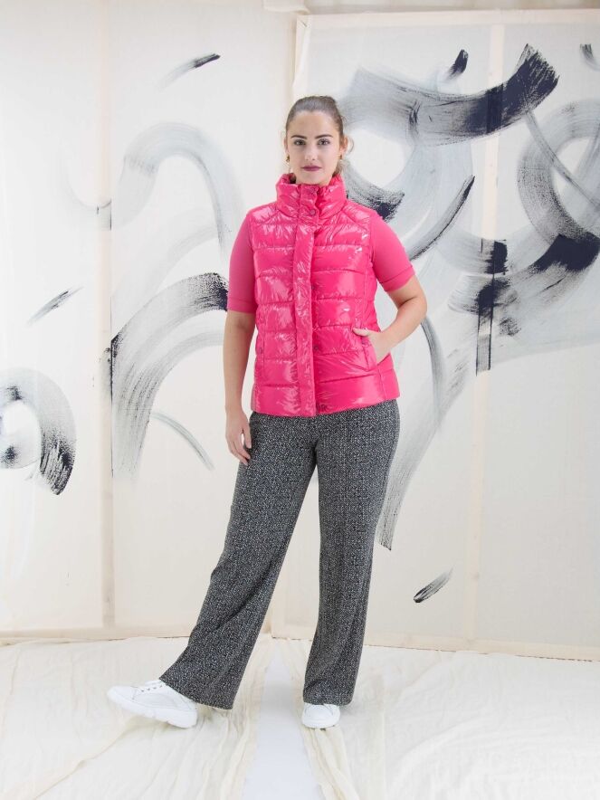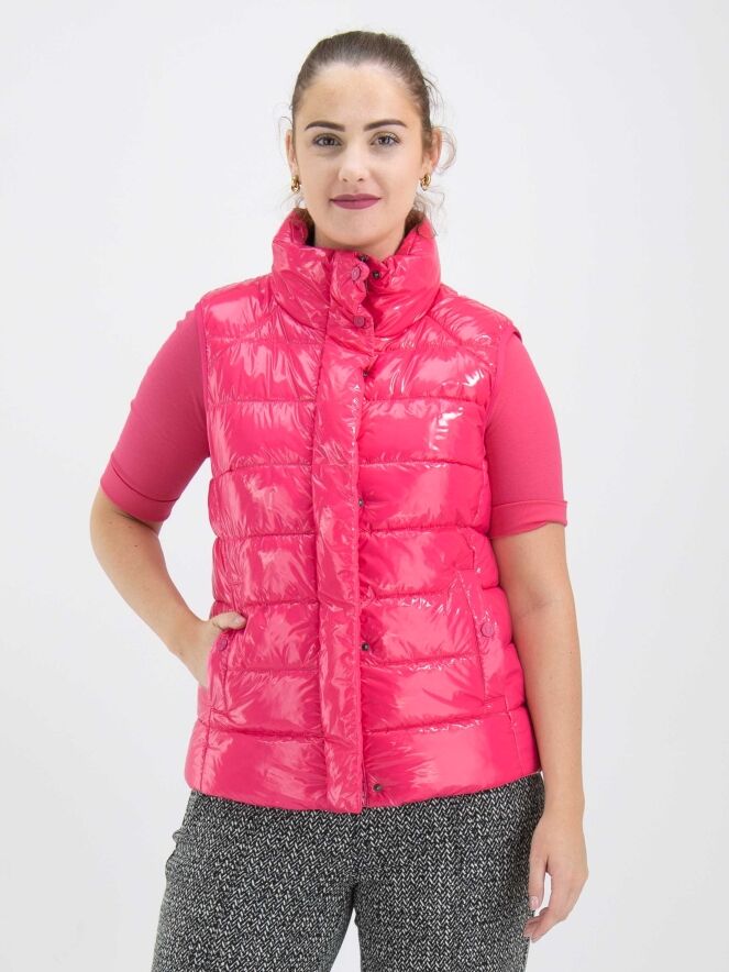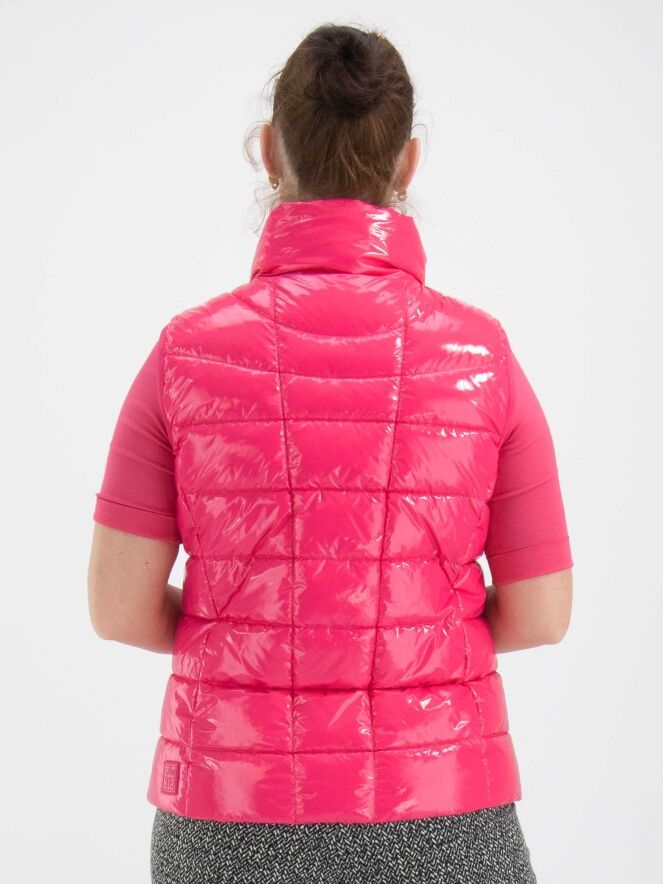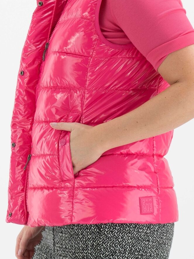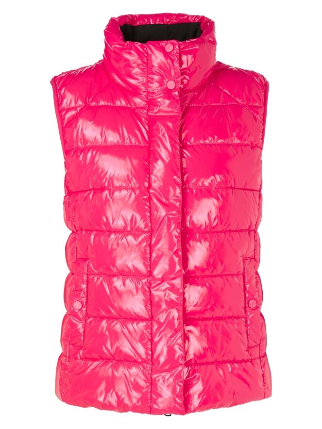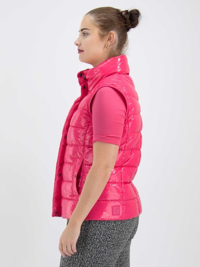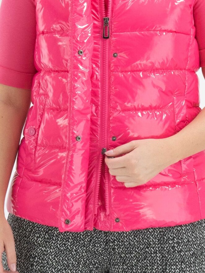 Un gilet court matelassé de Marc Cain dans une couleur rose vif verni. Le gilet possède une fermeture éclair avec des boutons-pression cachés comme seconde fermeture. Ce gilet peut être lavé à 30 degrés.