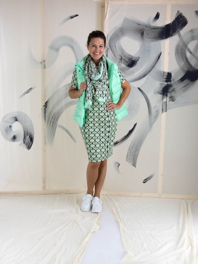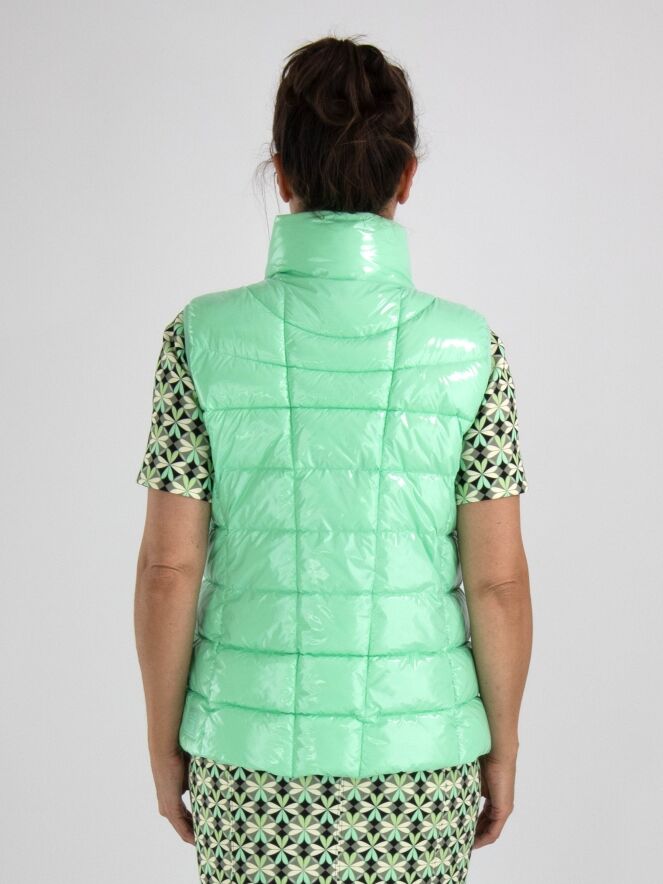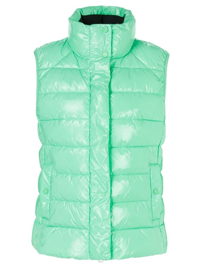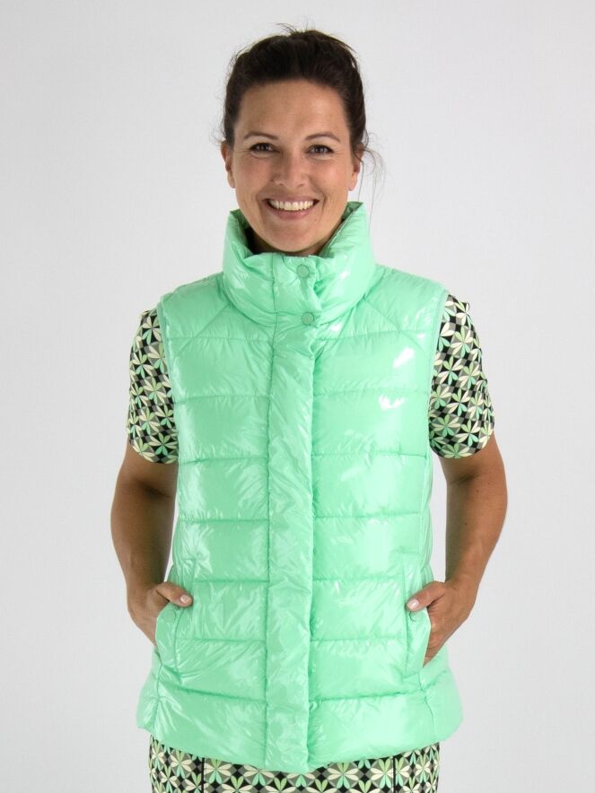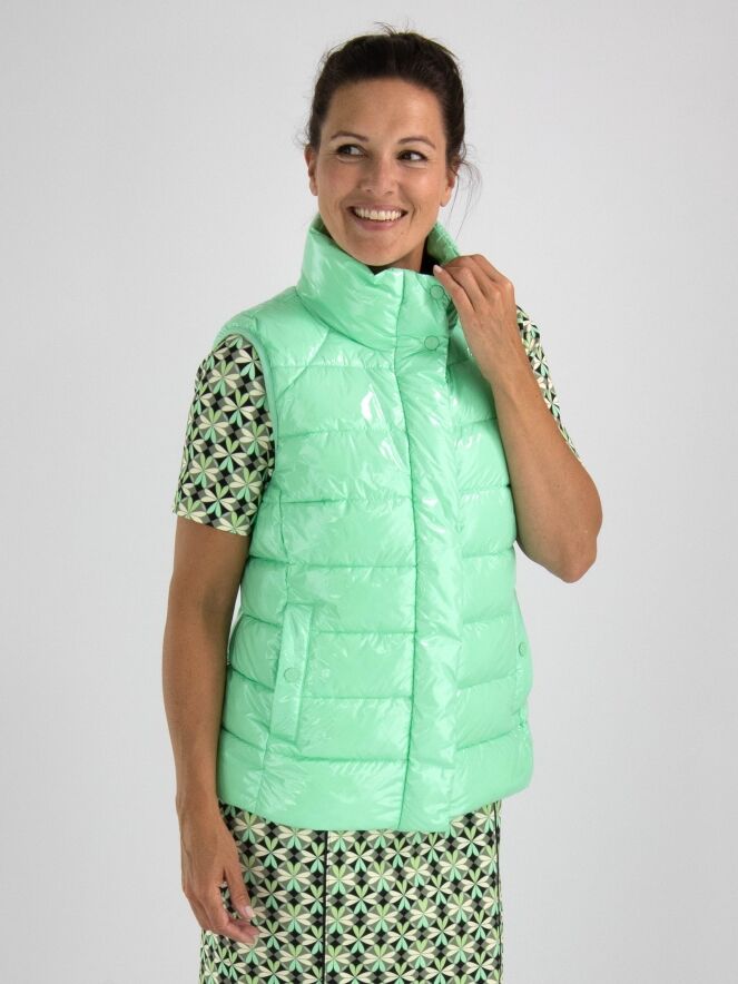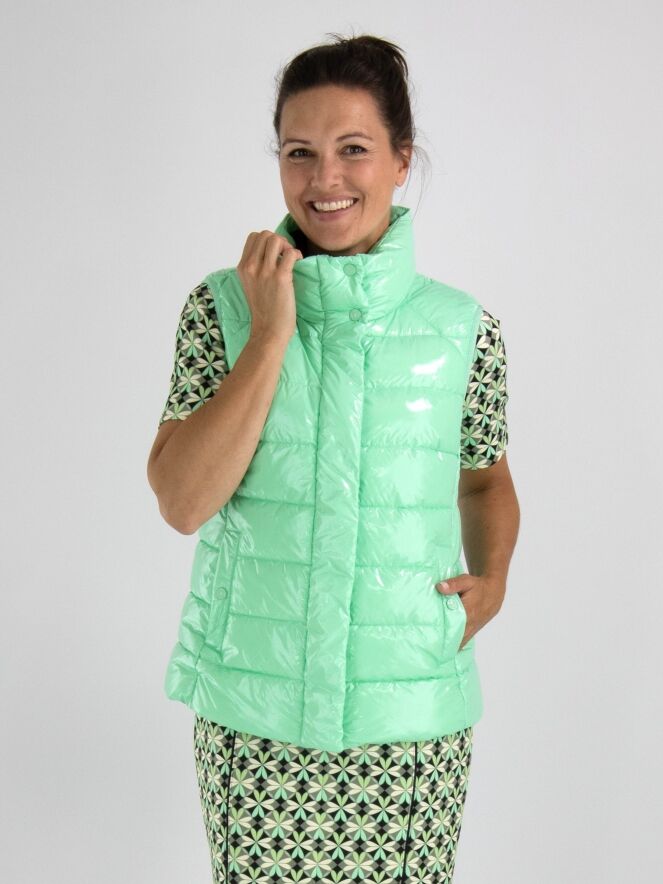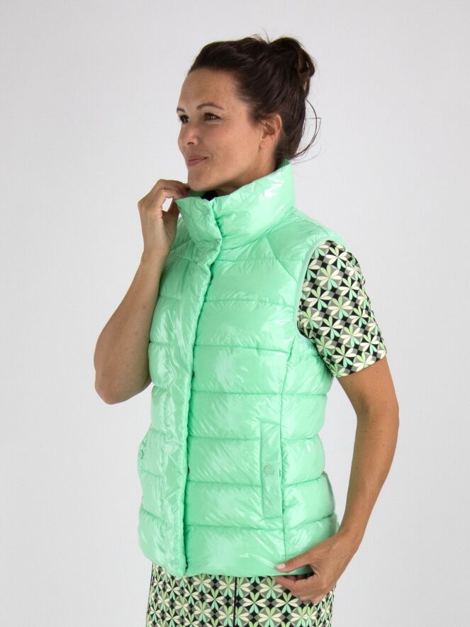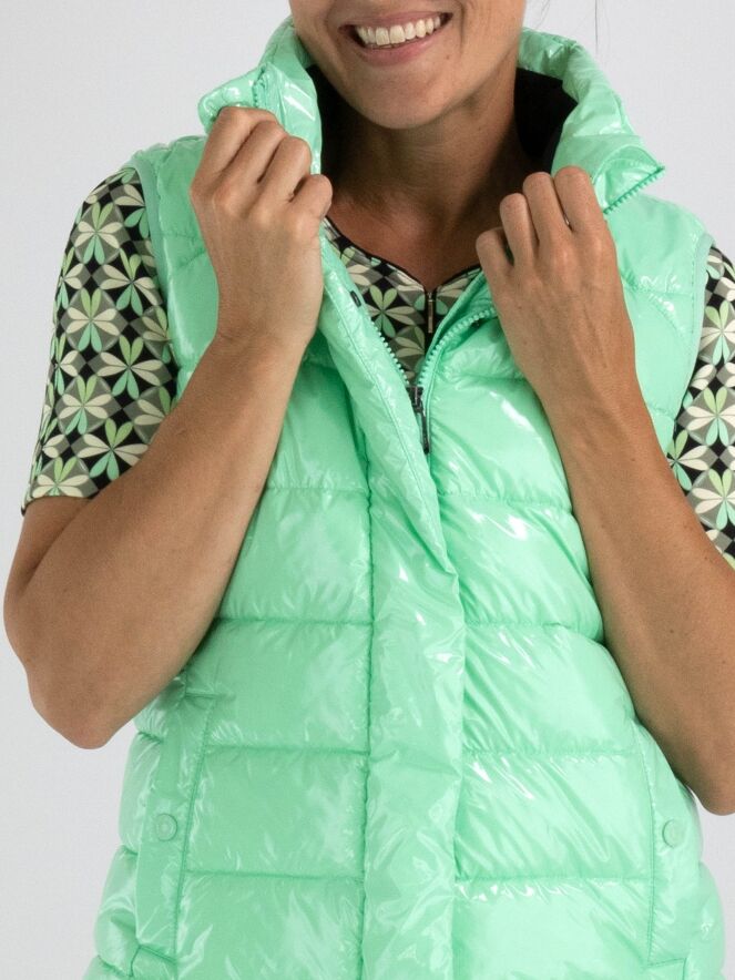 Un gilet court matelassé de Marc Cain dans une couleur verte pastel brillante laquée. Le gilet possède une fermeture éclair avec des boutons-pression cachés comme seconde fermeture. Ce gilet peut être lavé à 30 degrés.
