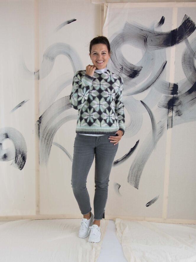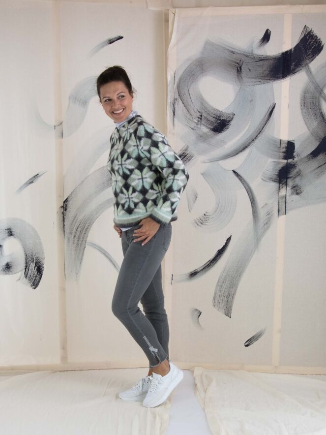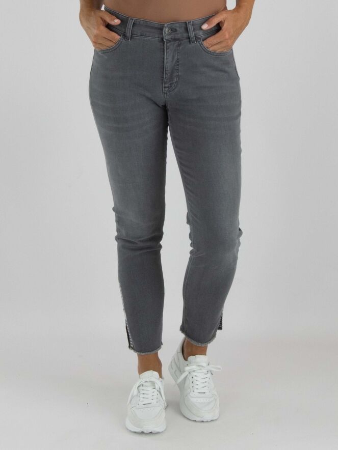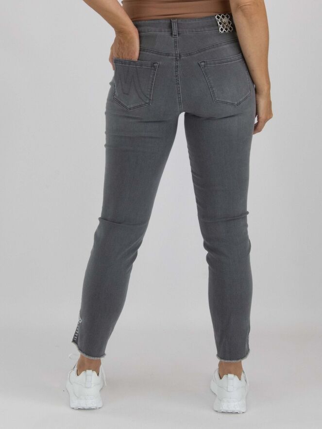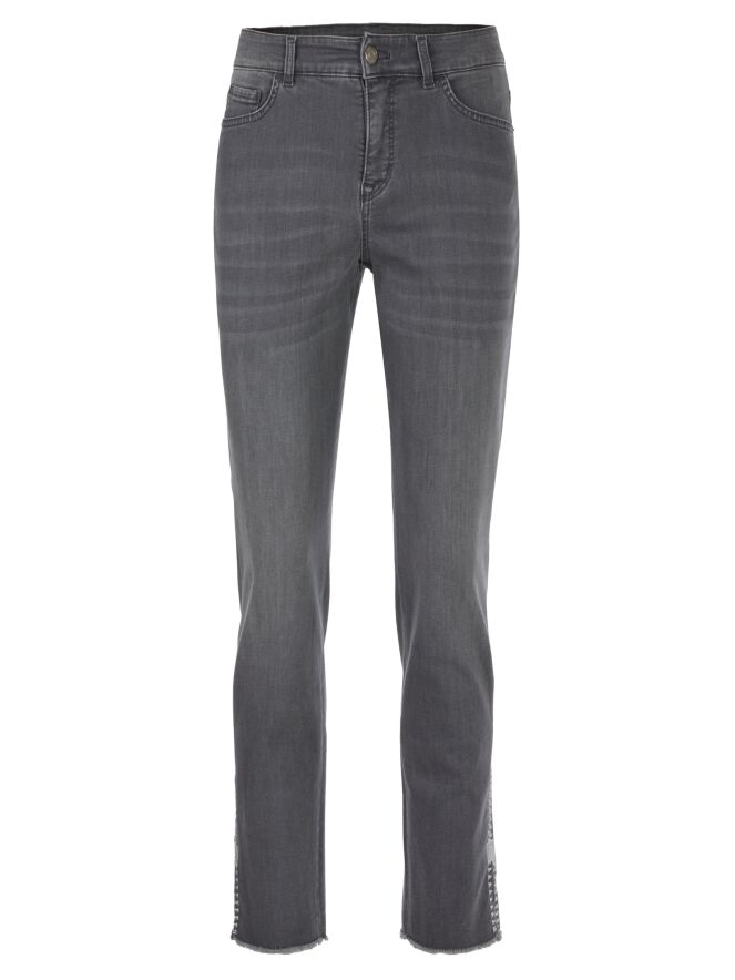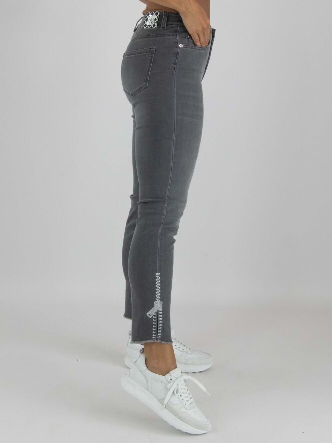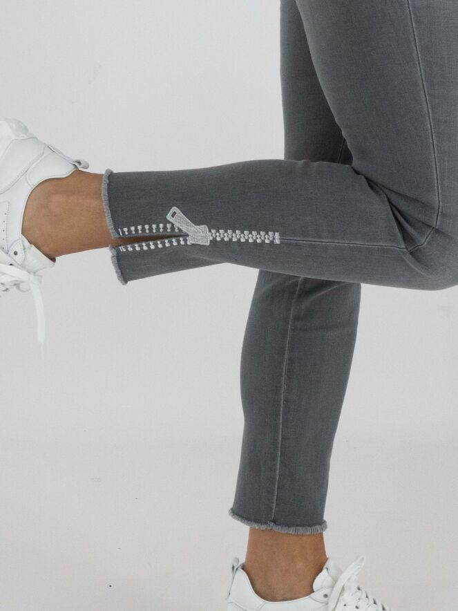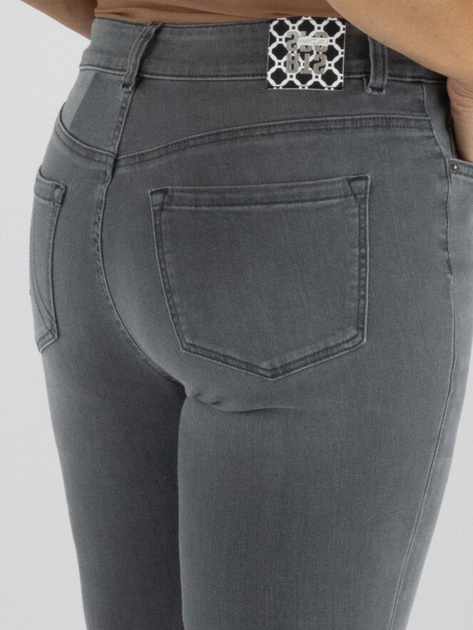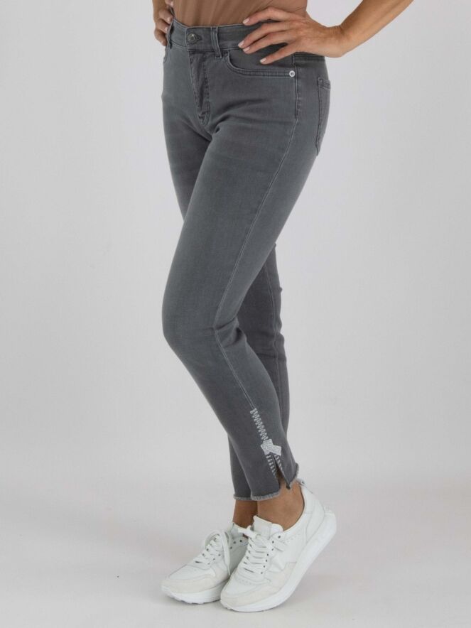 Un jean gris de Marc Cain dans un modèle à cinq poches. Au bas, sur les deux côtés, il y a de petites fentes avec des fermetures éclair cousues en fil gris clair le long de leurs bords. Ce jean peut être lavé à 30 degrés.