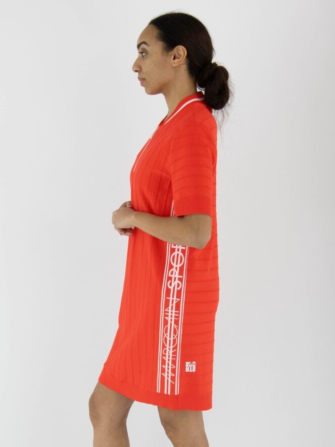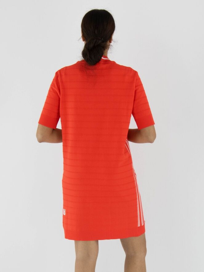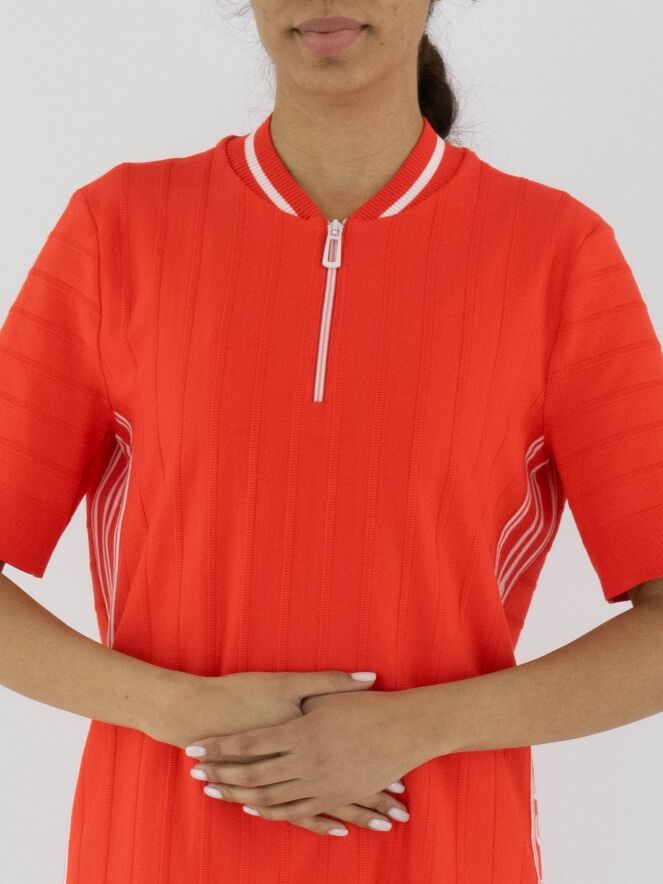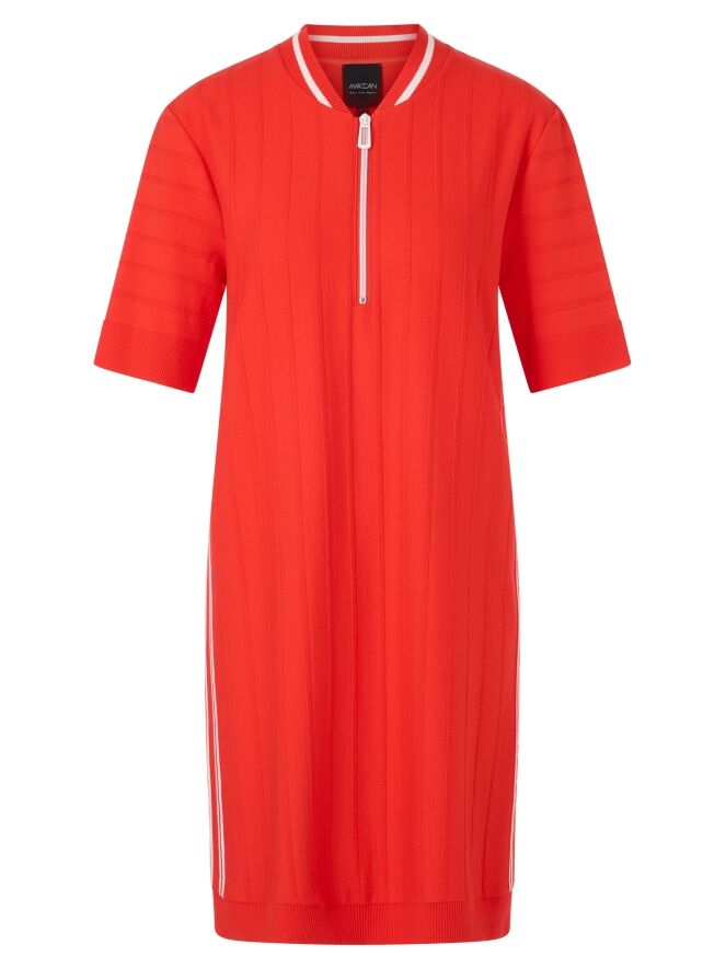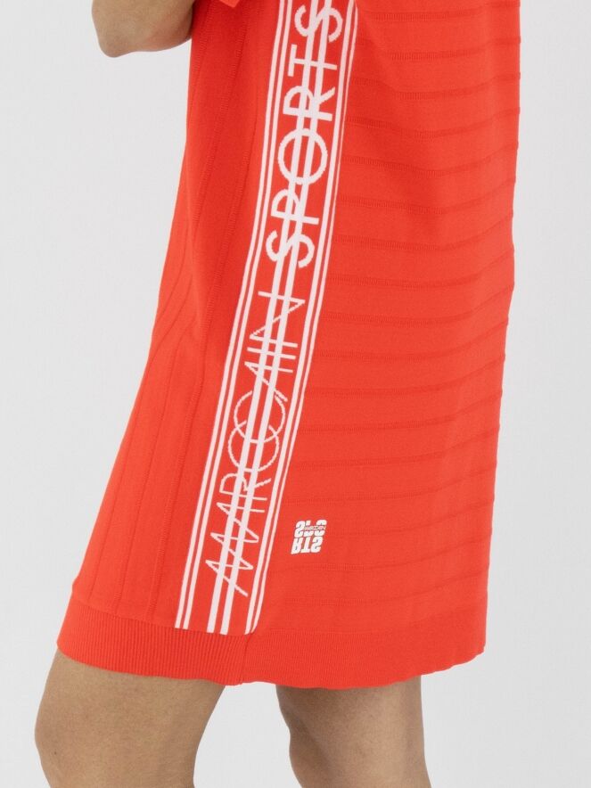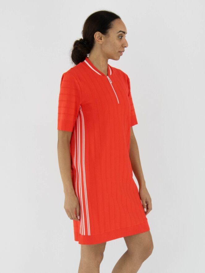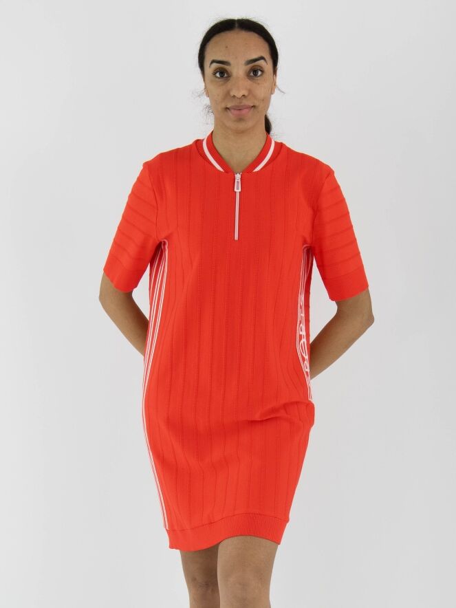 Une robe Marc Cain de couleur rouge corail avec un motif de rayures ton sur ton, dont les rayures sont finement côtelées. L'encolure ronde est ornée d'une bordure finement côtelée avec une rayure blanche. Sur les côtés, une large bordure avec des rayures blanches et le texte "Marc Cain". Une fermeture éclair blanche s'étend du centre de l'encolure jusqu'à la poitrine. Les manches courtes et le bas de la robe sont finis avec une large bordure unie et finement côtelée. Cette robe peut être lavée à 30 degrés.
