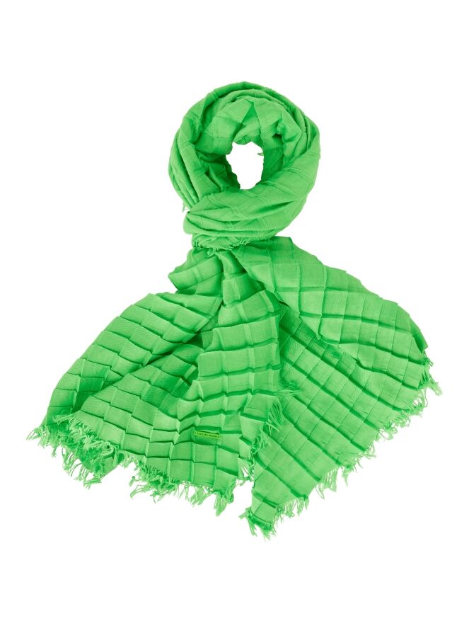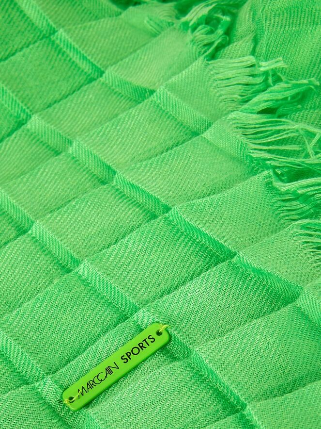 Une écharpe Marc Cain de couleur vert frais. L'écharpe est tissée avec une texture en nid d'abeilles et présente des bords délicatement effilochés. Cette écharpe doit être lavée à la main.