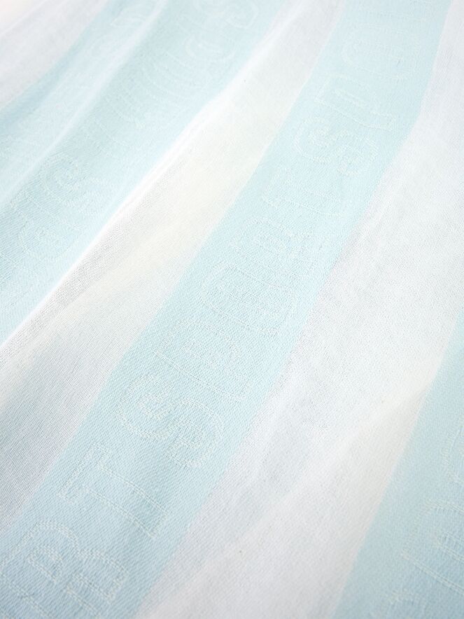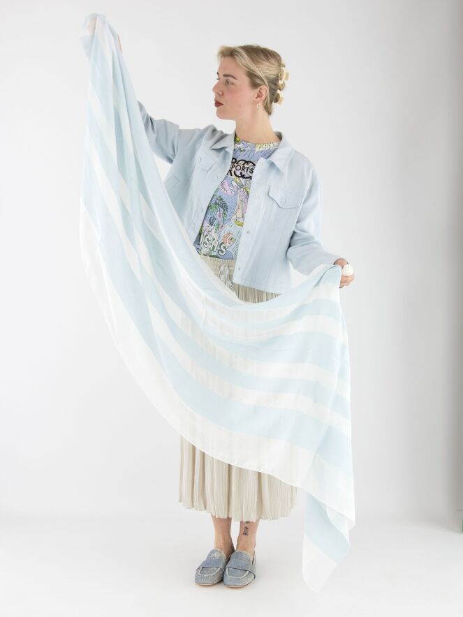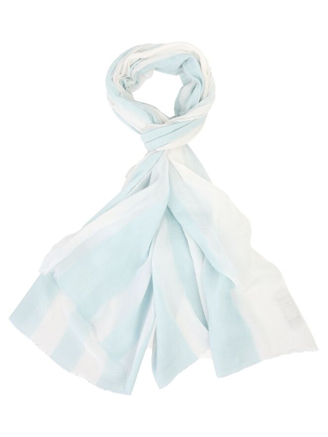 Une écharpe légèrement transparente de Marc Cain avec un motif rayé en bleu pastel et blanc. Les extrémités de l'écharpe sont subtilement effilochées. Cette écharpe doit être lavée à la main.