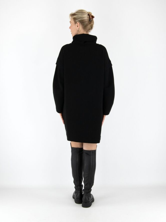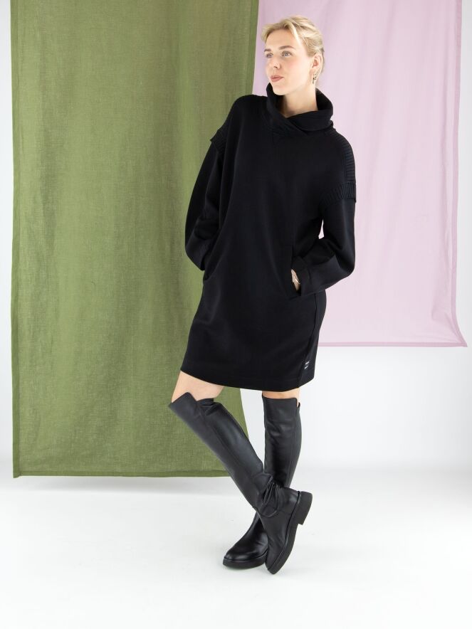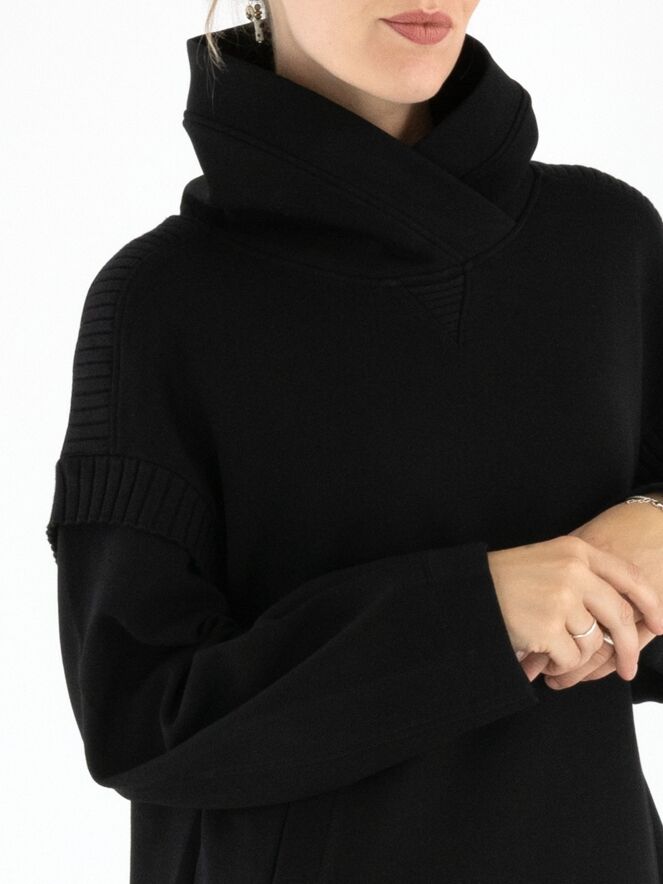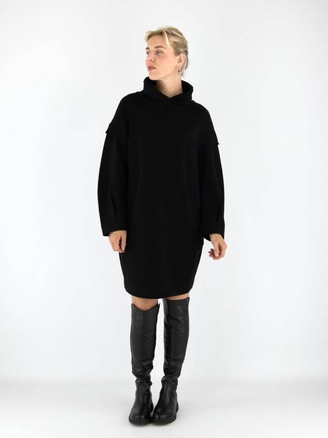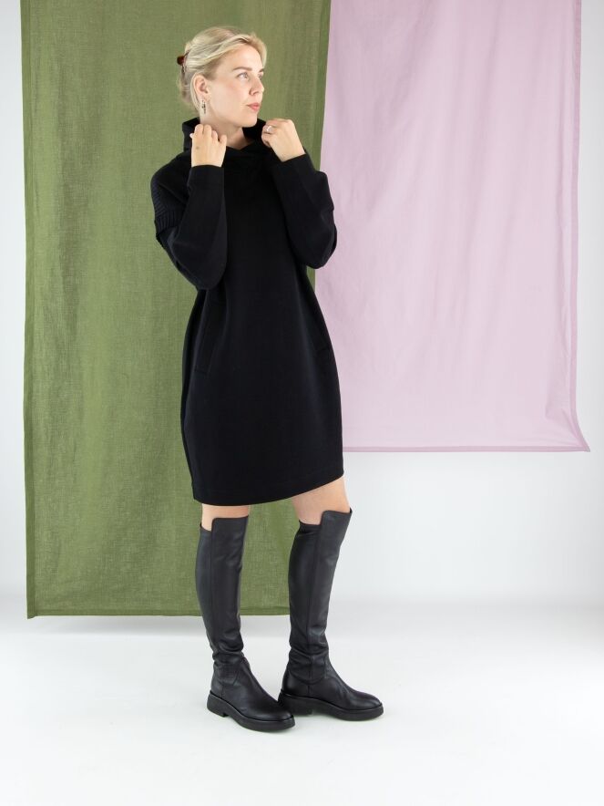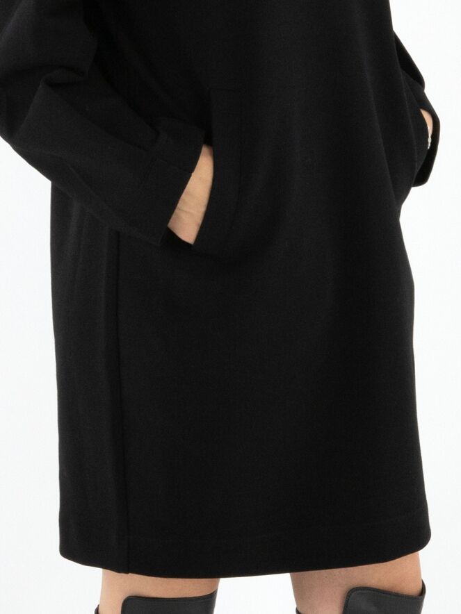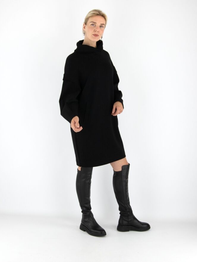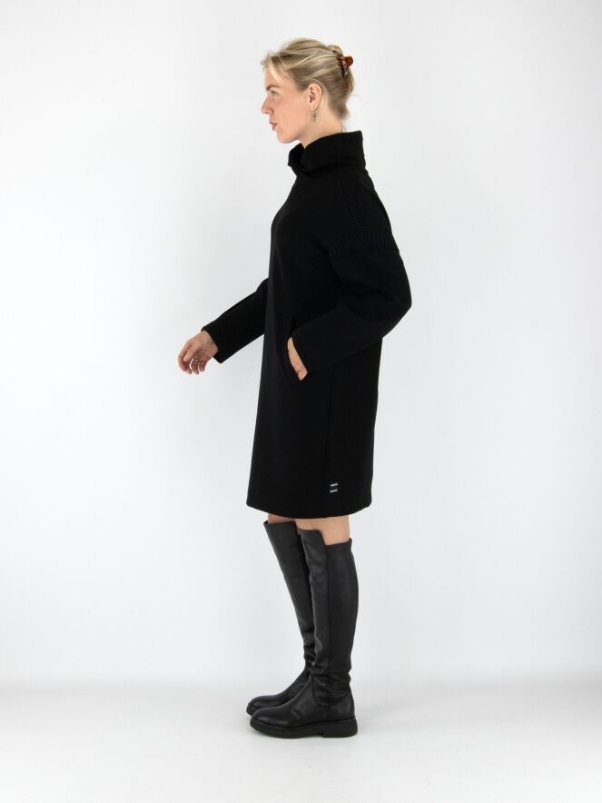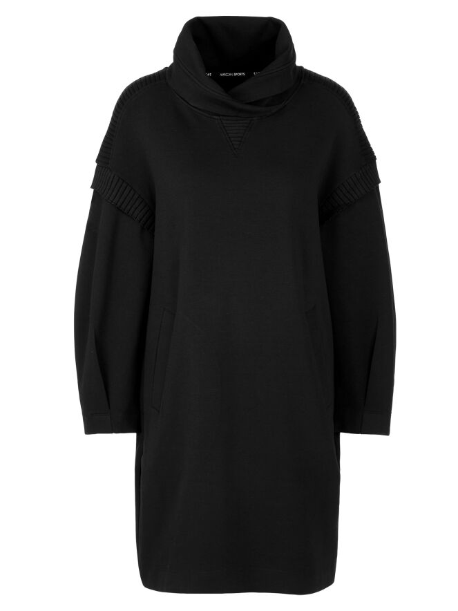 Une robe ou tunique de Marc Cain en noir. Elle présente un col en V montant avec un effet portefeuille. Une large bande en maille côtelée est placée sur les épaules et aux emmanchures. Des poches fendues sont positionnées à la taille. Cette robe peut être lavée à 30 degrés.