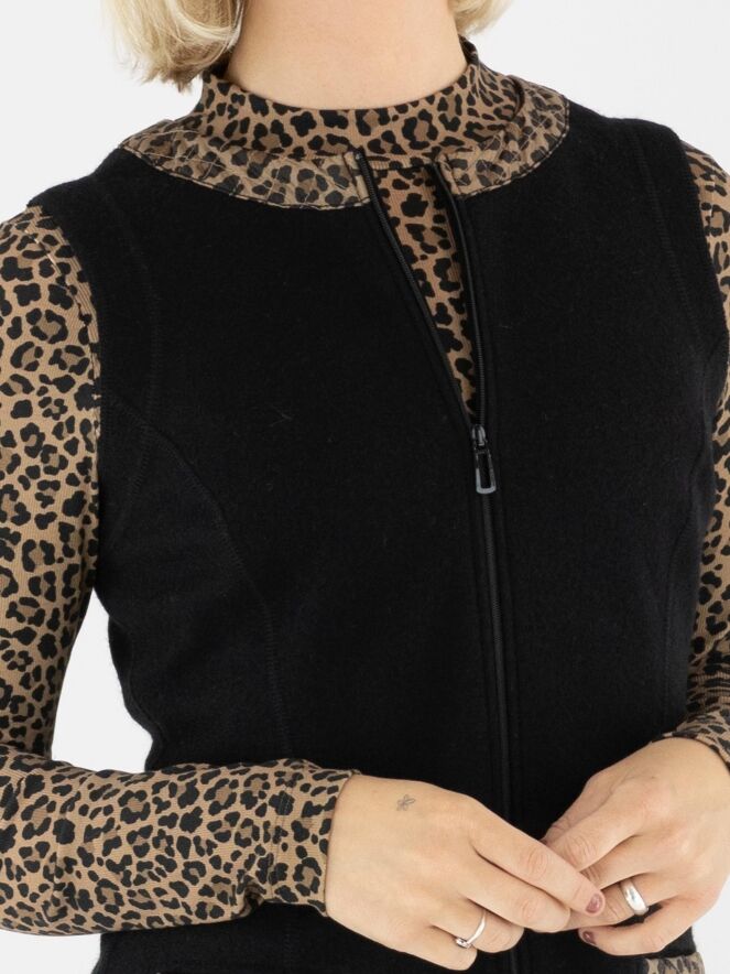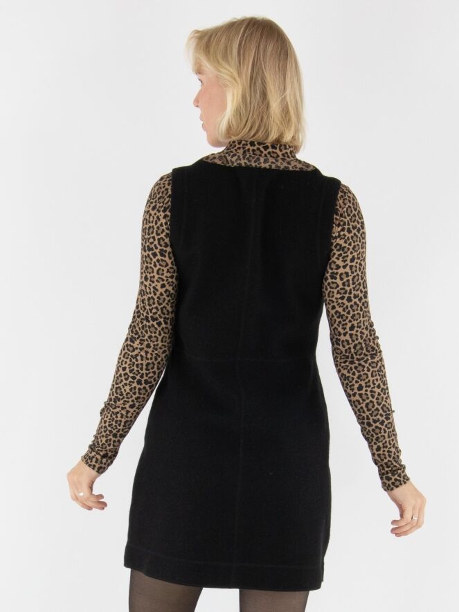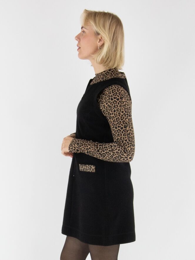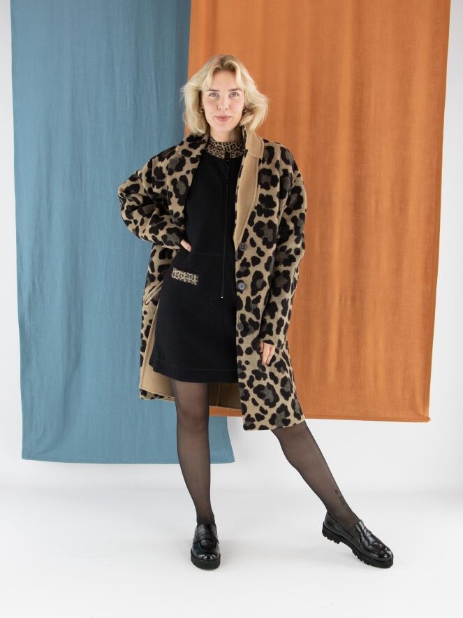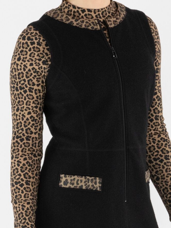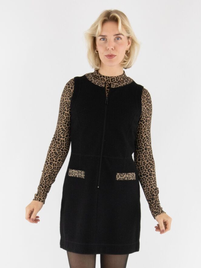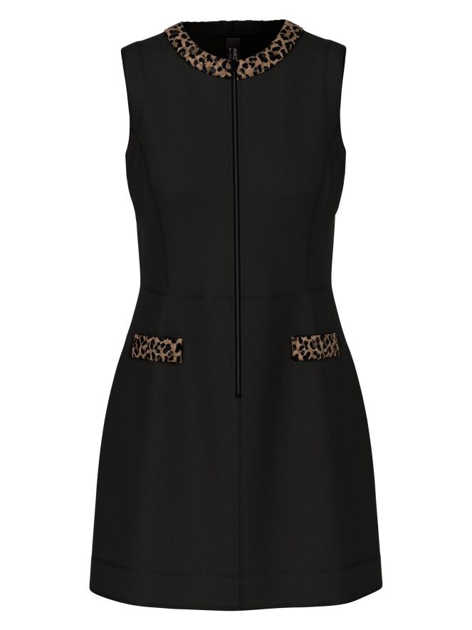 Une robe élégante de Marc Cain en laine bouillie de couleur noire. Le bord de l’encolure ronde est souligné par un passepoil matelassé à imprimé léopard dans des tons bruns et noirs. Ce détail se retrouve également sur les bords des poches à l’avant, créant une finition raffinée. Une fermeture éclair part du col jusqu’au-dessous de la taille. Cette robe ne doit pas être lavée.