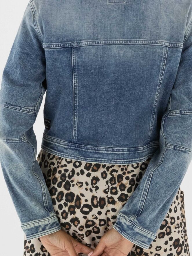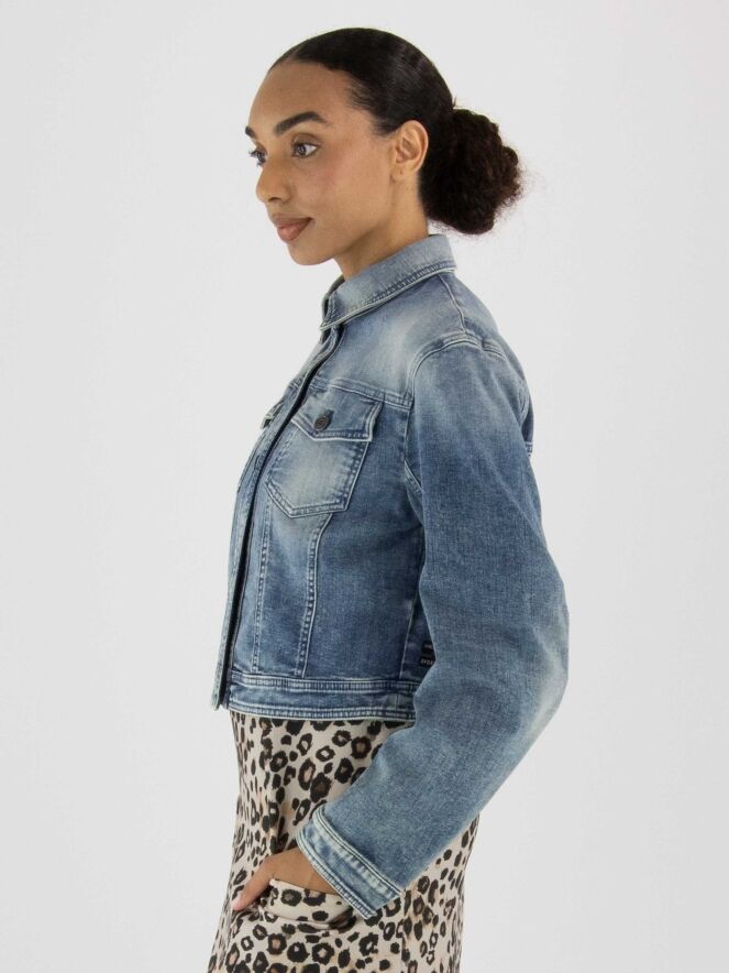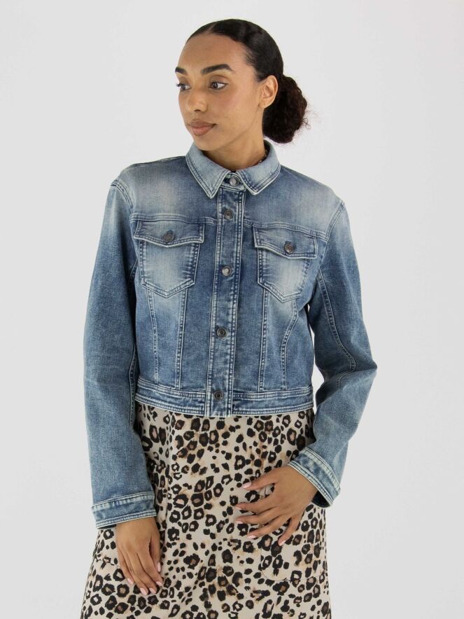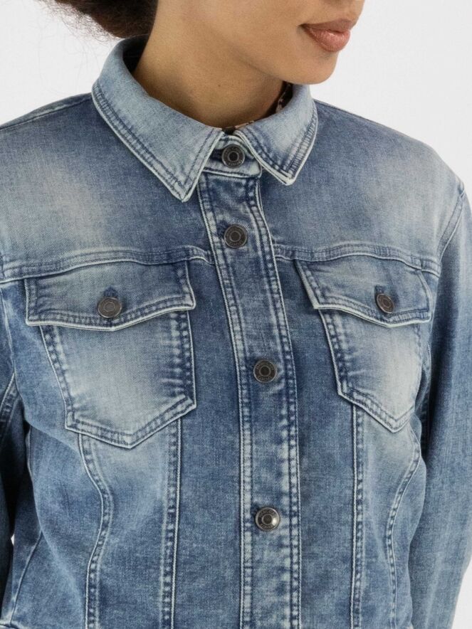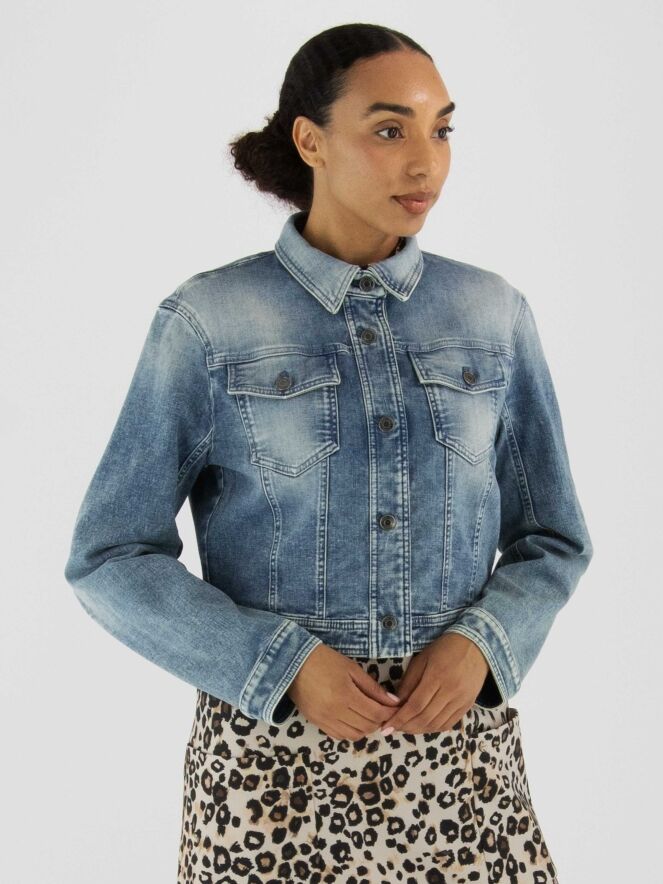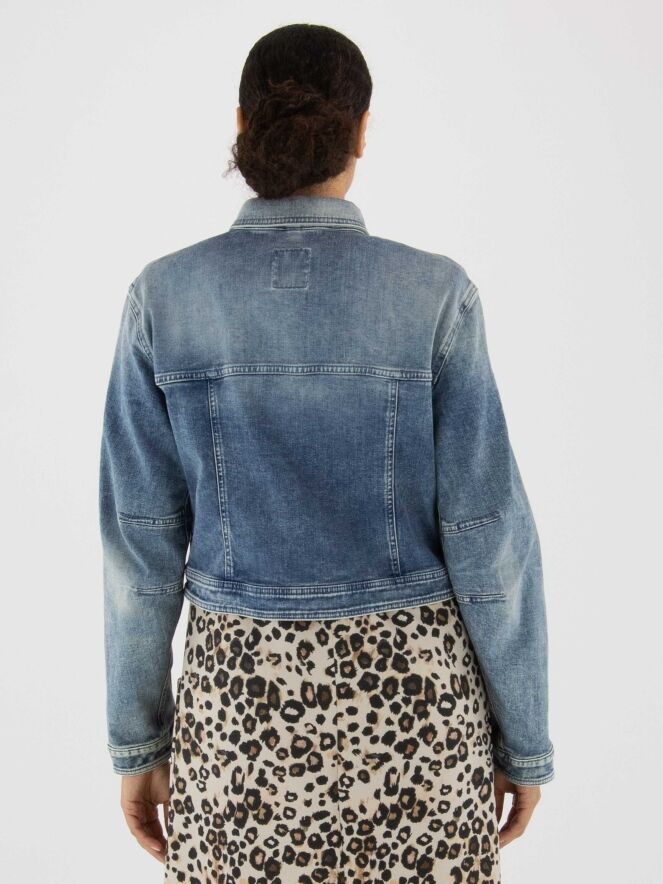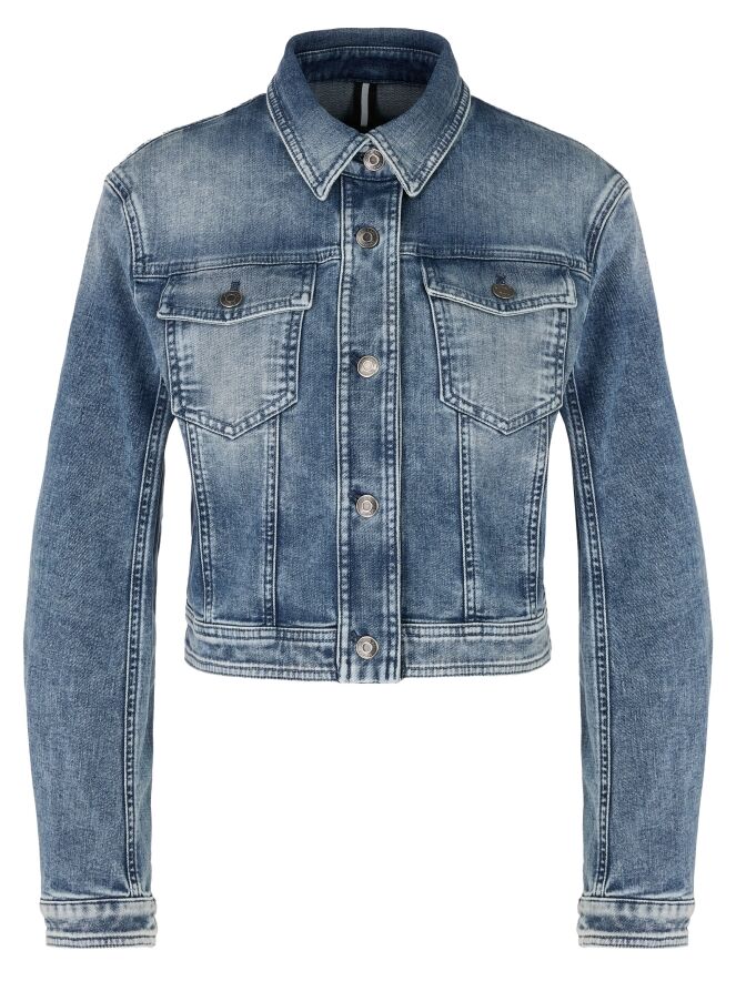 Veste en jean courte de Marc Cain dans un look denim usé. Elle se ferme par cinq boutons et peut être lavée à 30 degrés.