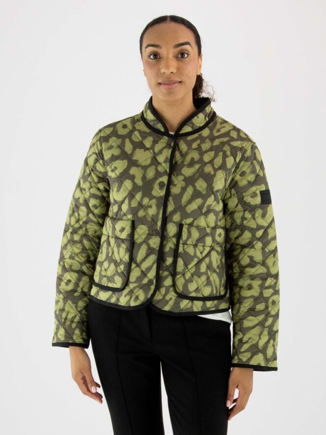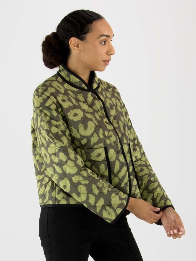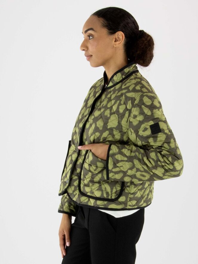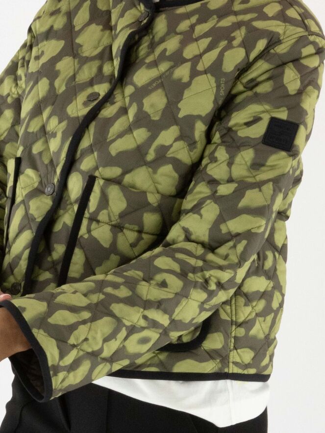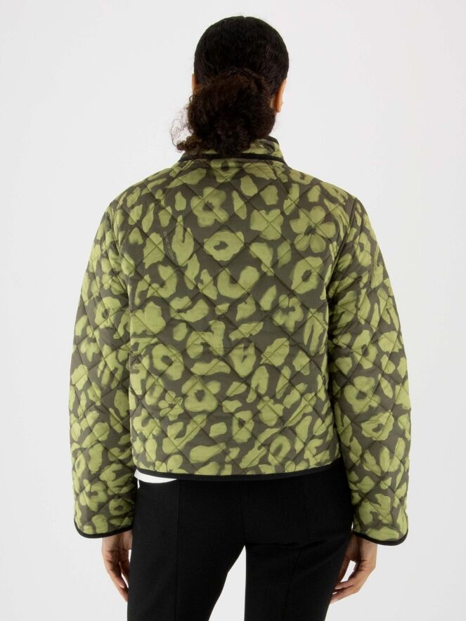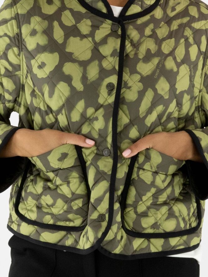Manteau matelassé réversible de Marc Cain avec un imprimé dans les tons vert pistache et vert olive. Un liseré noir longe l'encolure et le col, et se prolonge le long de la fermeture à boutons-pression. Le revers est uni en vert olive. Ce manteau peut être lavé à 30 degrés.