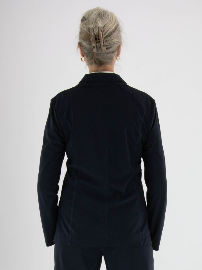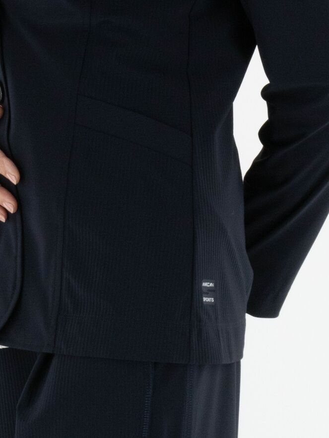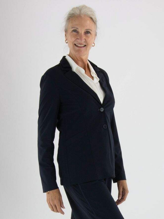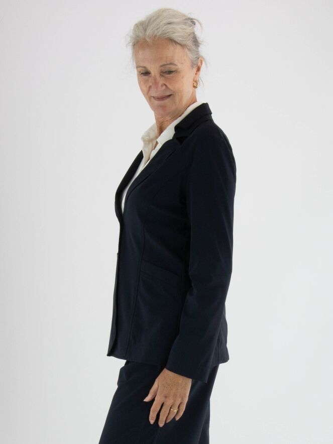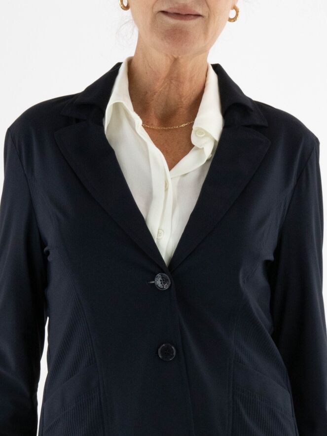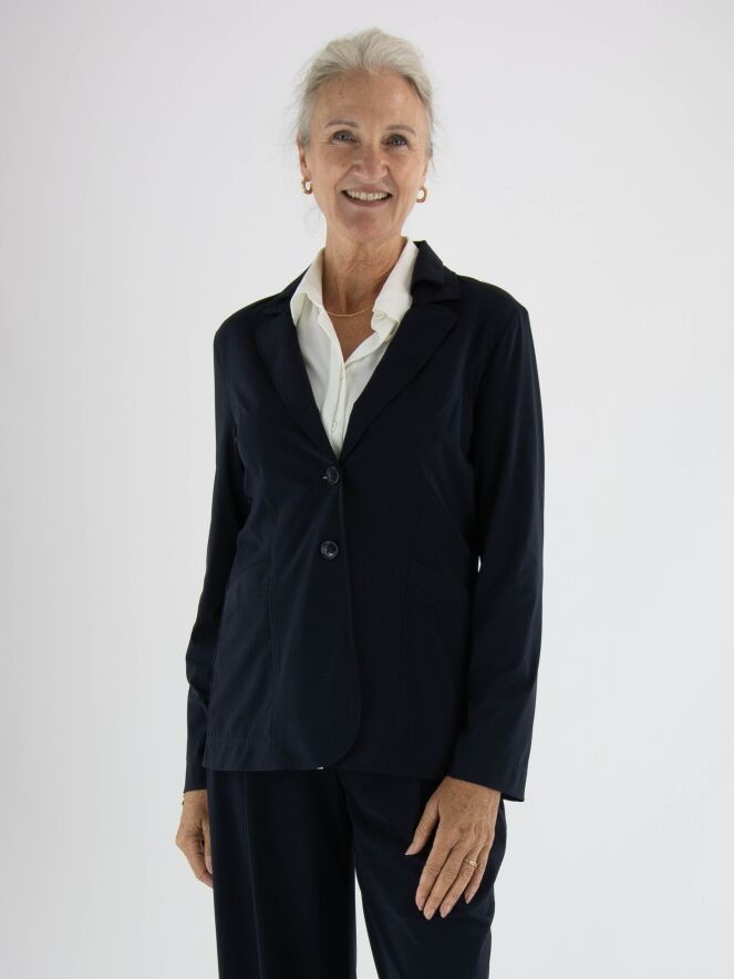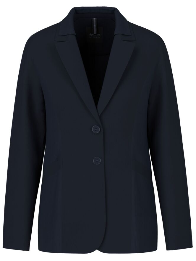 Blazer de Marc Cain en bleu marine. Les côtés à l'avant et à l'arrière présentent une texture à rayures fines. La couche supérieure du col double est également réalisée dans ce tissu côtelé. Le blazer se ferme par deux boutons et n'est pas doublé. Ce blazer peut être lavé à 30 degrés.