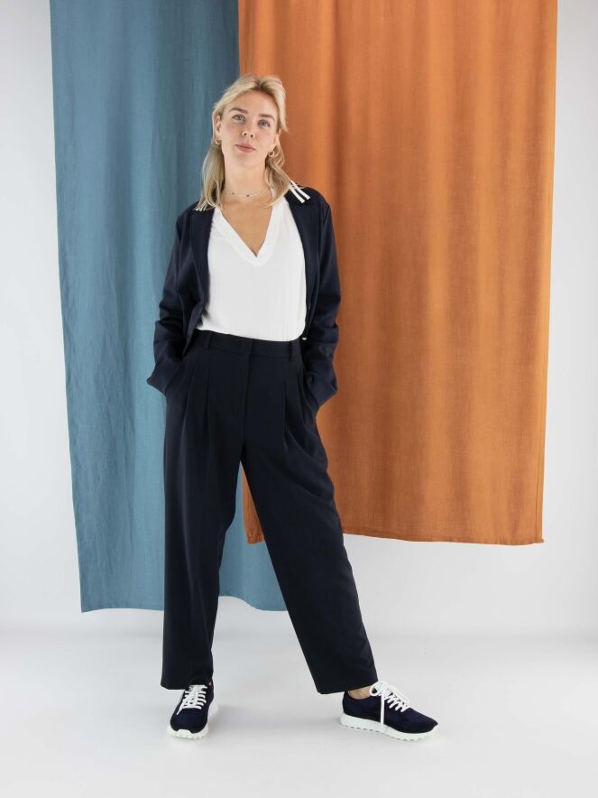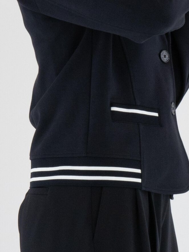 Blazer Marc Cain en bleu marine. Le col rayé et la base sont en maille côtelée fine. Les poches sont bordées d’un passepoil dans la même maille. Ce blazer est non doublé et se ferme par deux boutons. Il peut être lavé à 30 degrés.