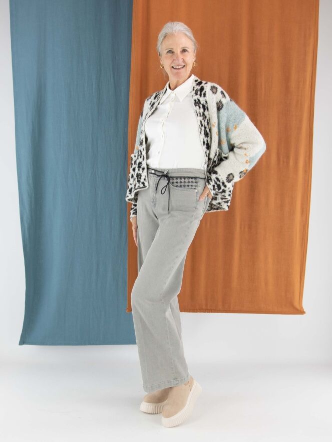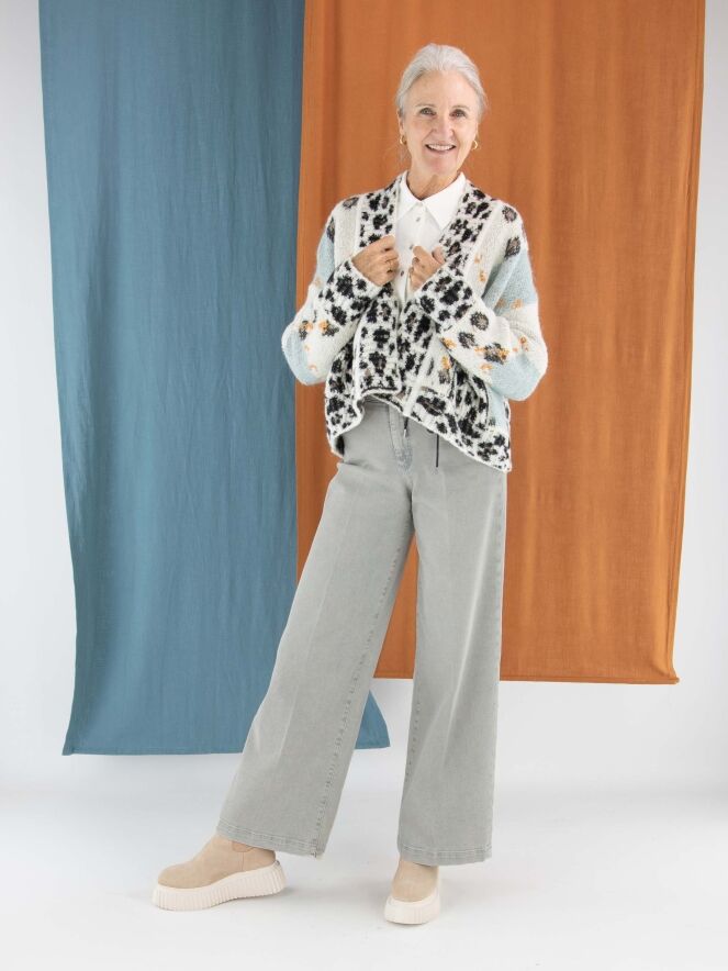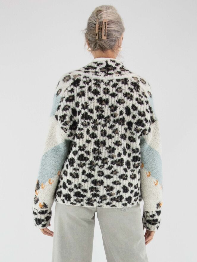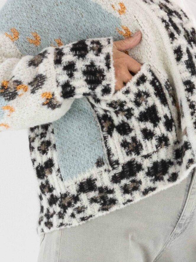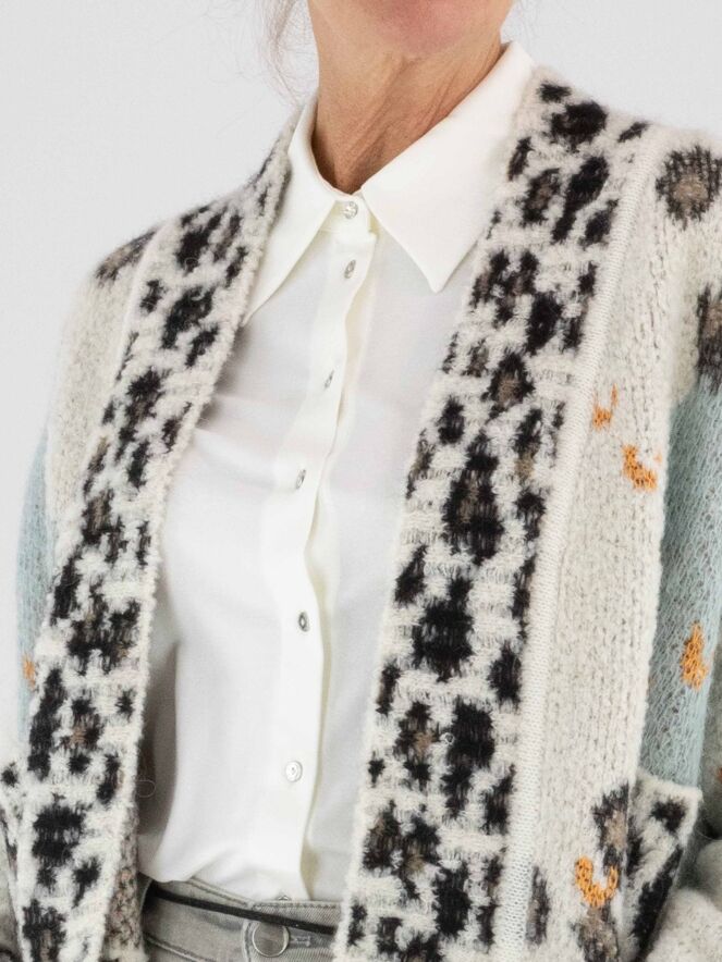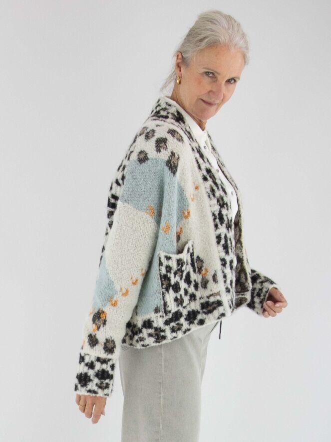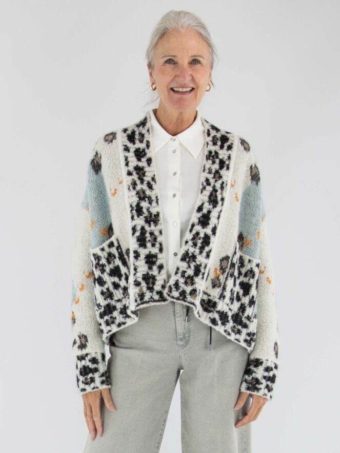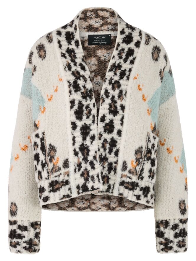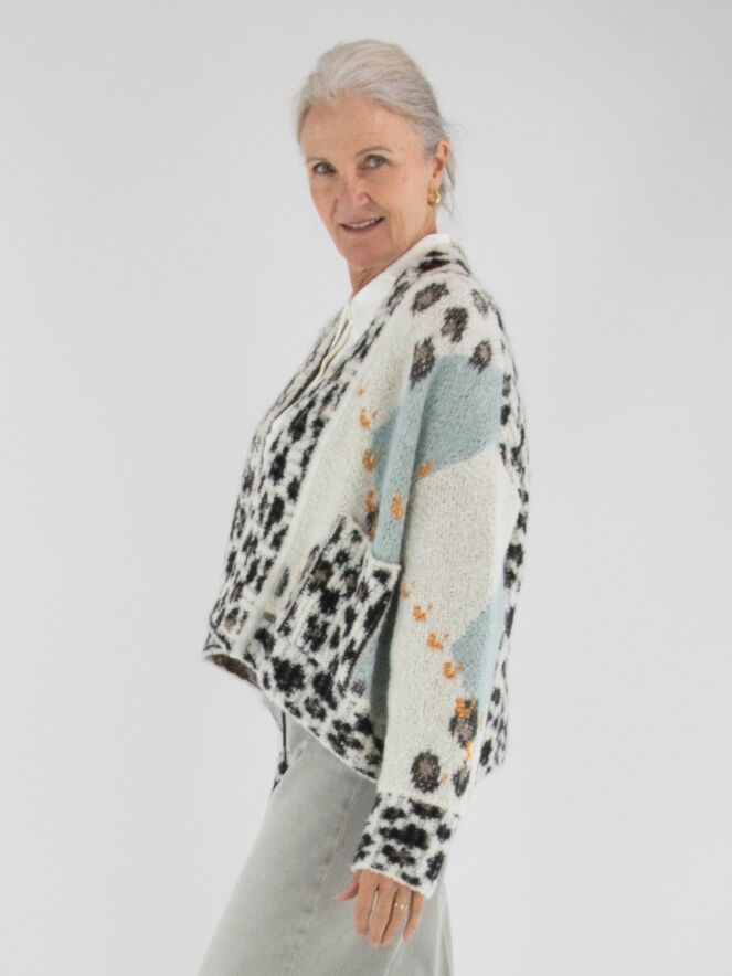 Un cardigan élégant de Marc Cain présentant sur le devant un motif argyle raffiné décliné dans des tons turquoise, brun, orange et blanc cassé. Le col est rehaussé d’un détail ludique à imprimé léopard. Le dos est entièrement tricoté dans un motif léopard, créant un contraste saisissant. Le cardigan ne comporte pas de fermeture et peut être lavé à la main.