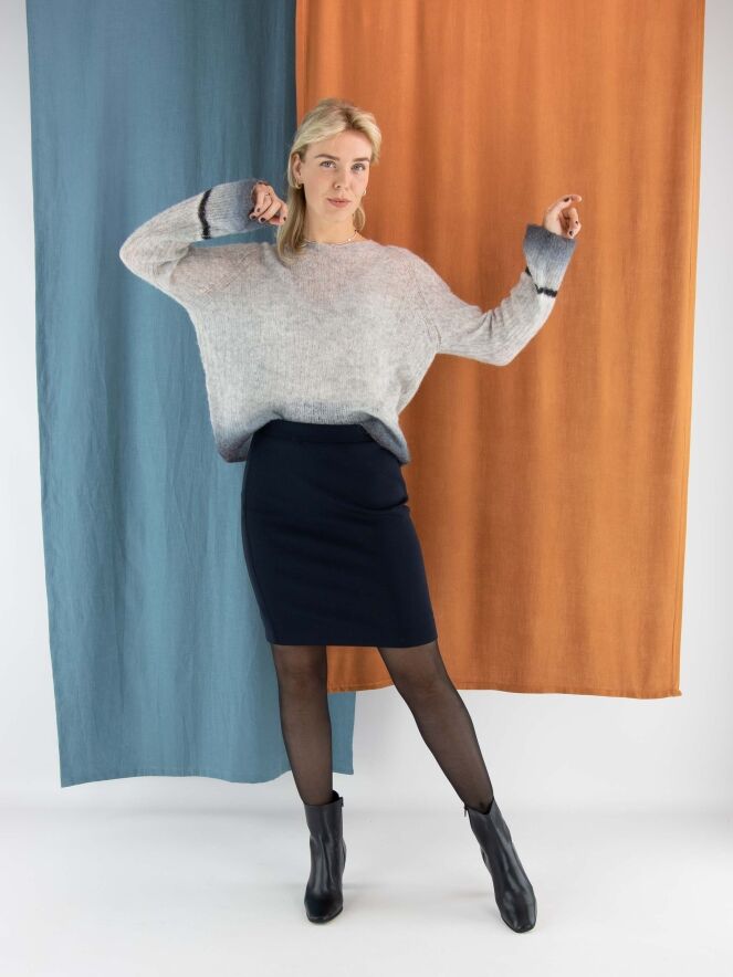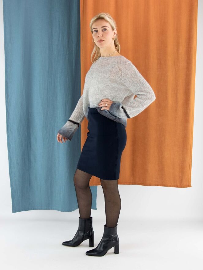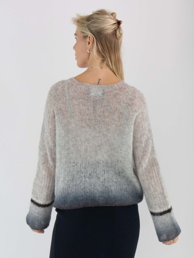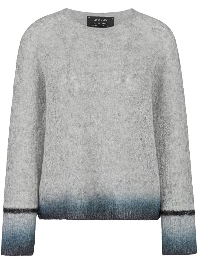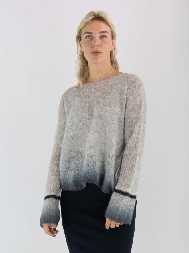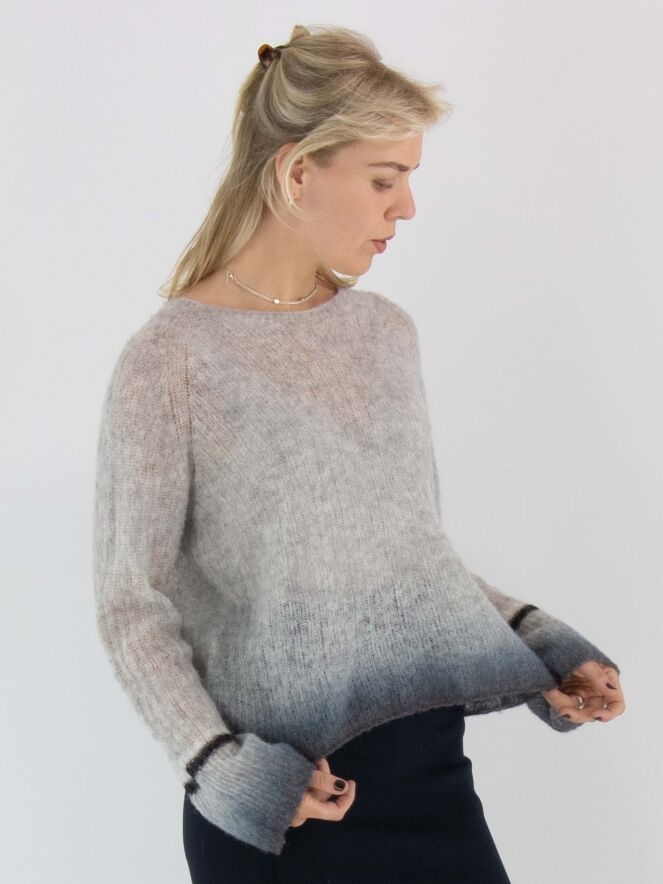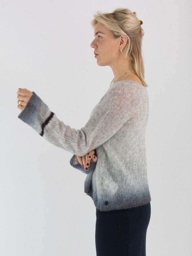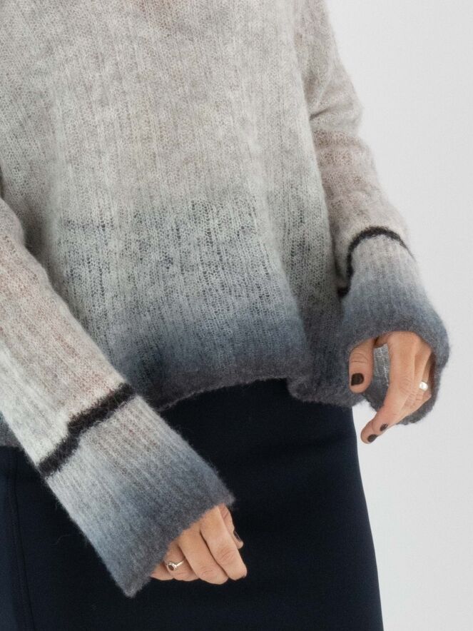 Pull chiné de Marc Cain dans plusieurs nuances de gris. Un dégradé vers le gris anthracite, agrémenté d’une rayure noire, est présent en bas du pull et aux extrémités des manches longues. Ce pull doit être lavé à la main.