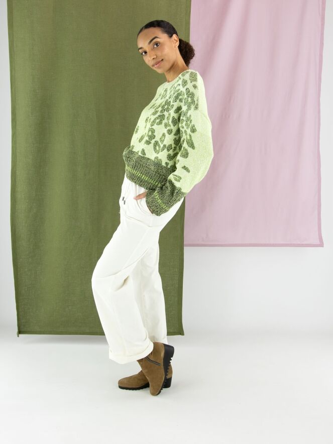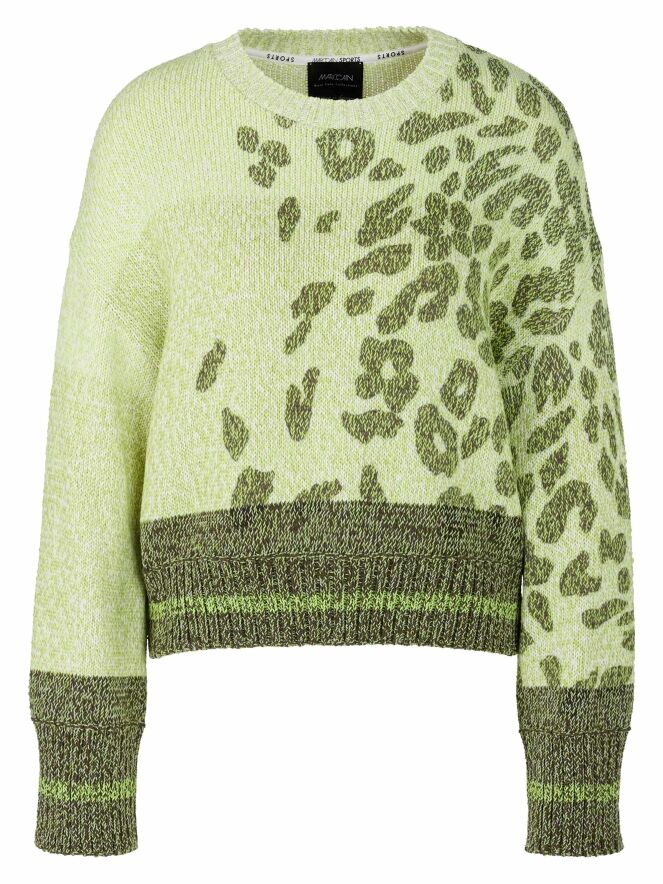 Un pull chiné de Marc Cain avec une partie en imprimé léopard dans les tons vert olive, blanc cassé et vert pistache. L'encolure ronde est bordée d’un col côtelé. Les extrémités des manches longues ainsi que le bas du pull sont finies par un bord chiné. Ce pull peut être lavé à 30 degrés.