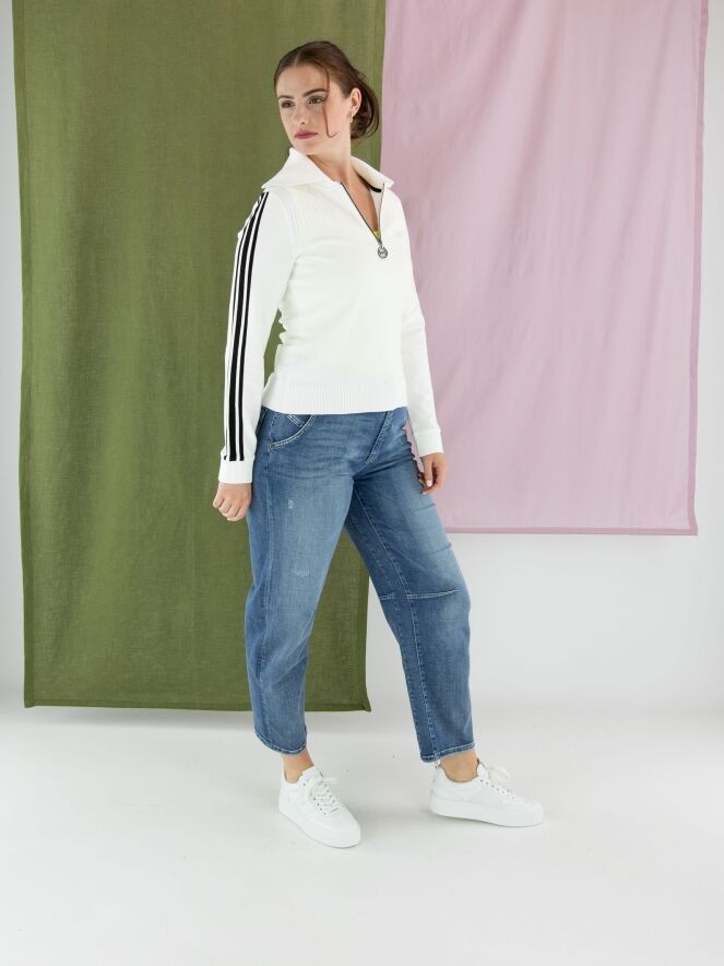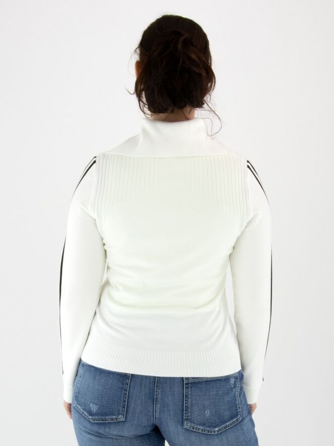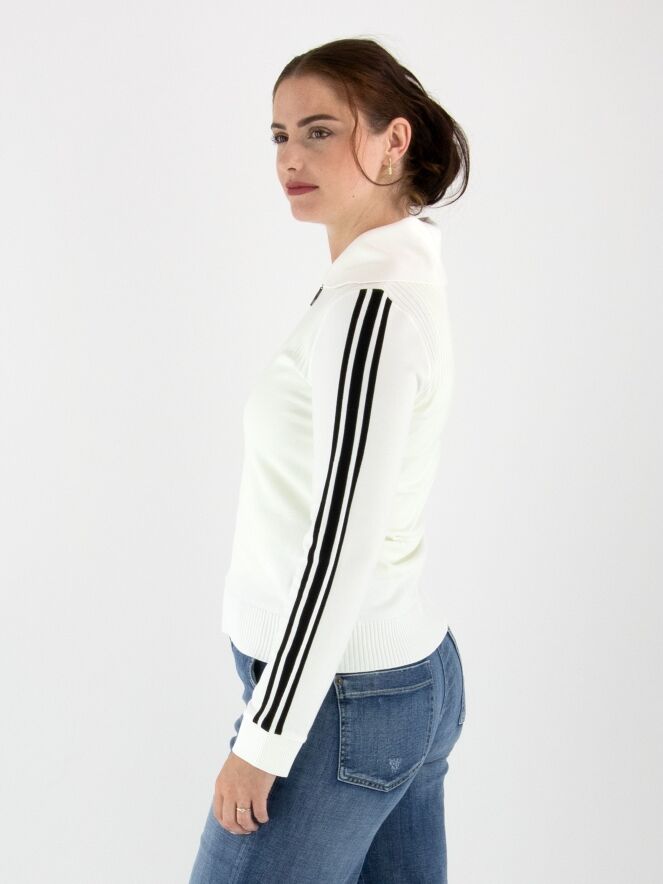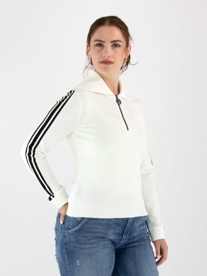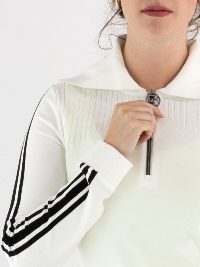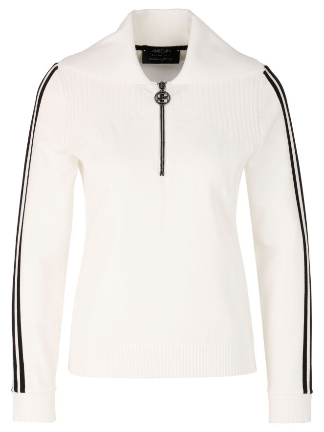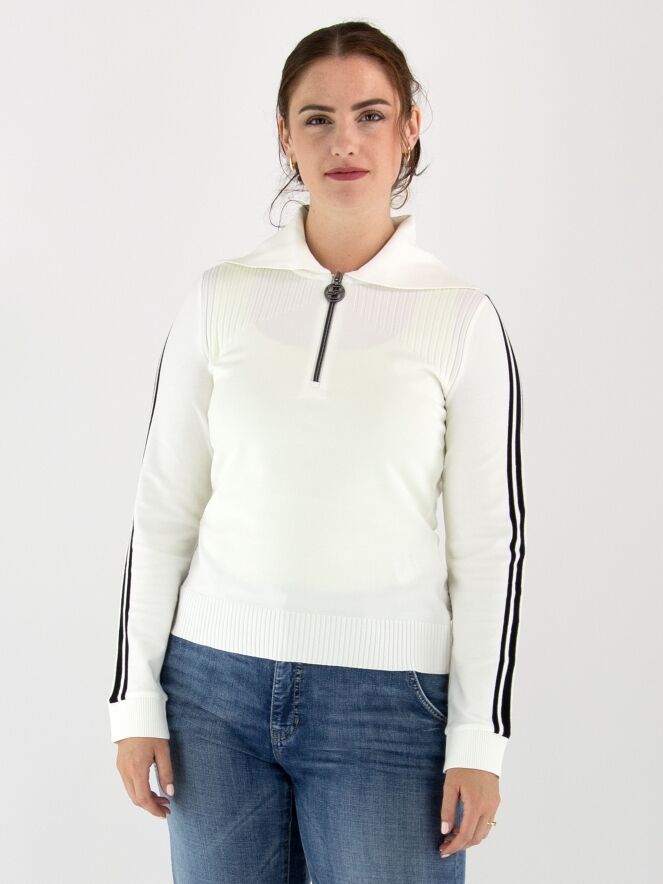 Pull de Marc Cain de style polo en blanc cassé. Le col est finement côtelé, et une fermeture éclair descend depuis le centre jusqu’à la poitrine. Au-dessus de la poitrine, un motif rayé est tricoté sur le devant. Deux bandes noires ornent le haut des manches longues. Les poignets et le bas du pull sont finis avec un bord en maille côtelée. Ce pull peut être lavé à 30 degrés.
