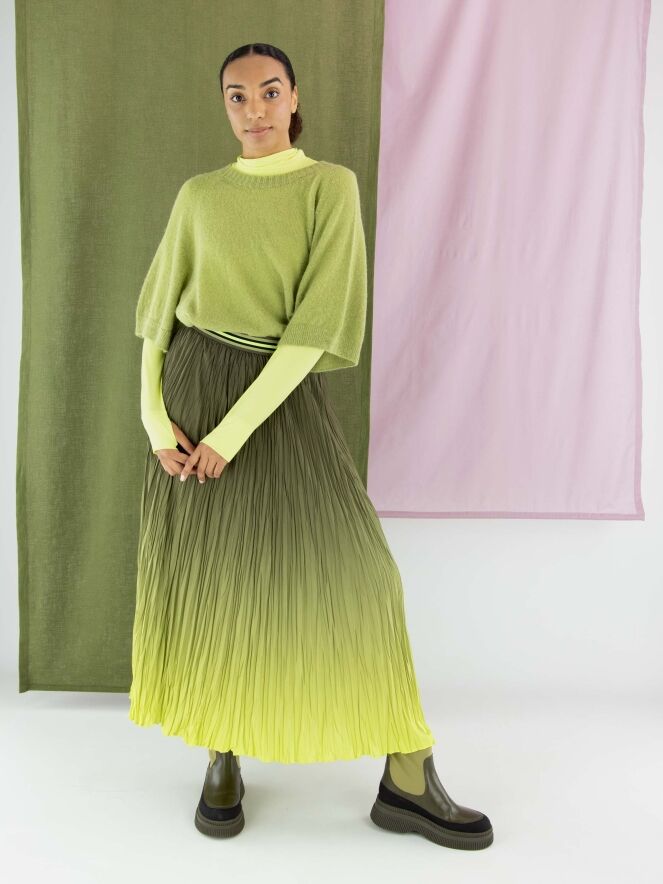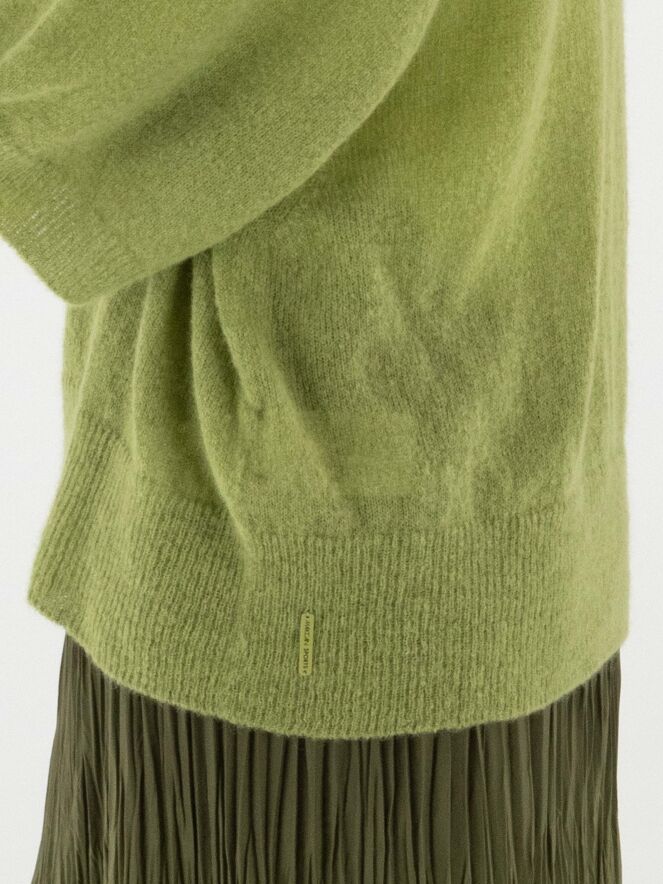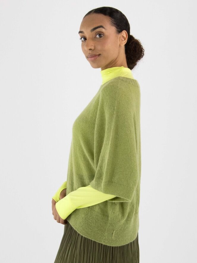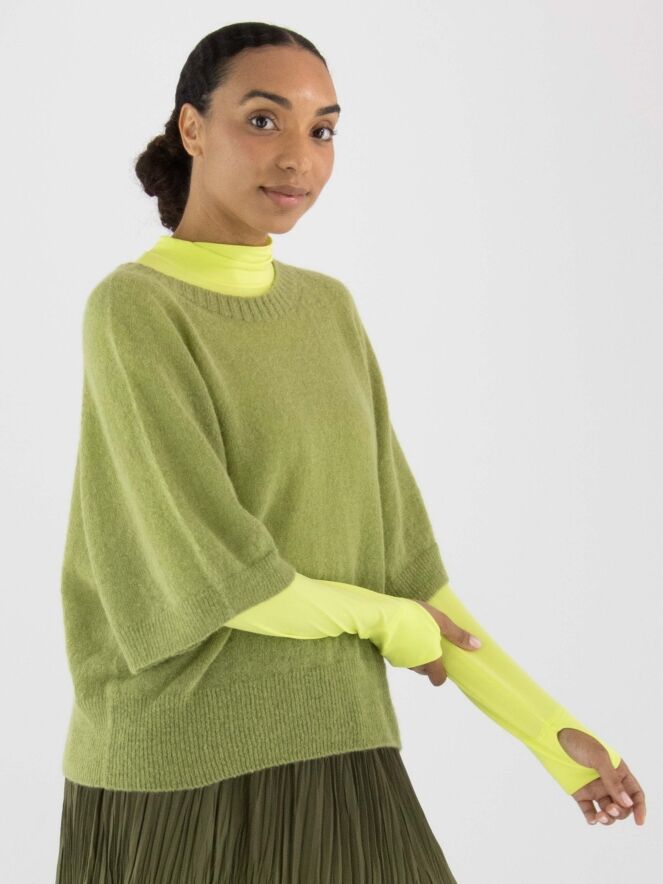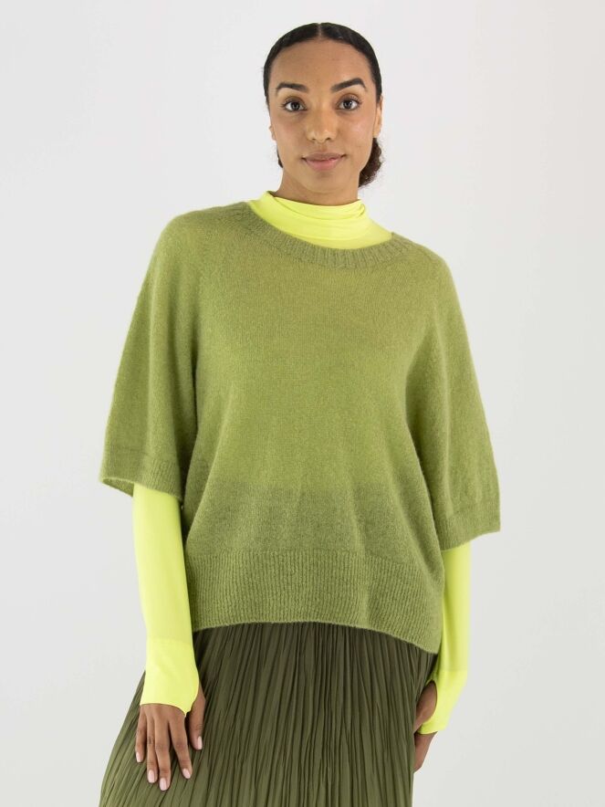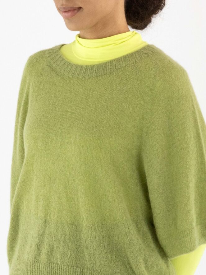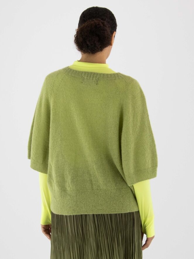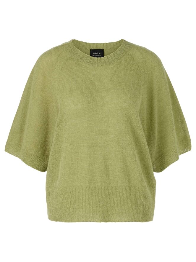 Pull chiné de Marc Cain en vert pistache. Ce pull a un col rond et des manches courtes. Ce pull doit être lavé à la main.