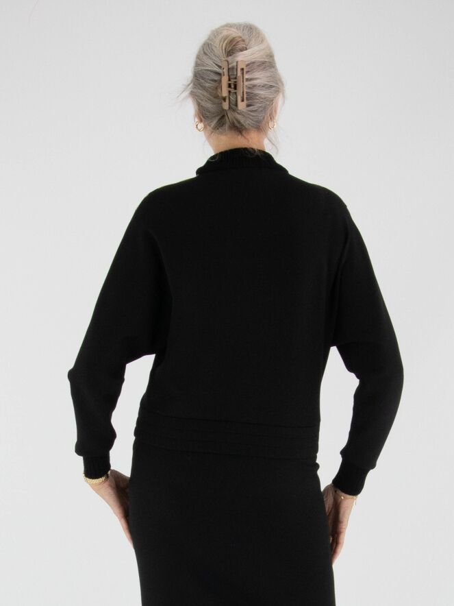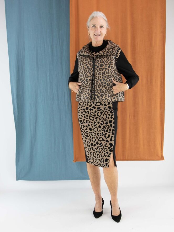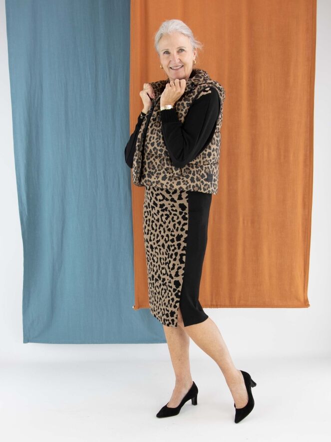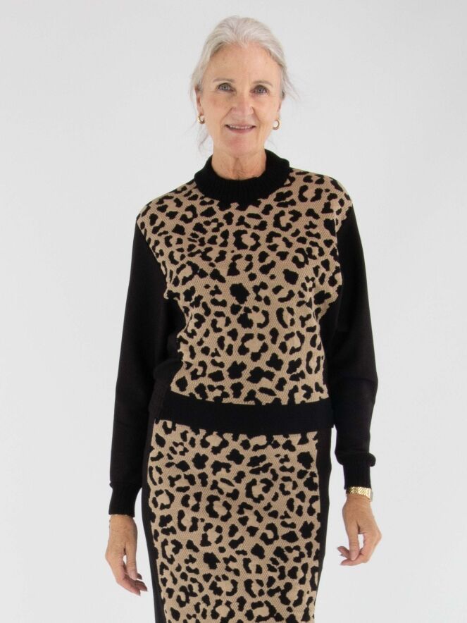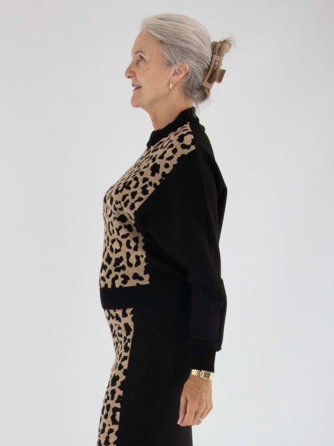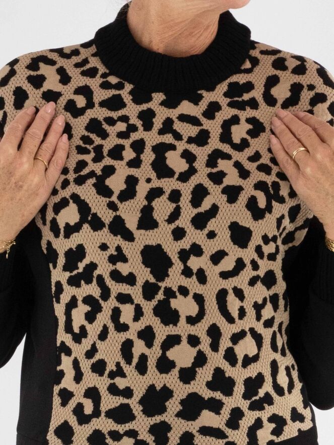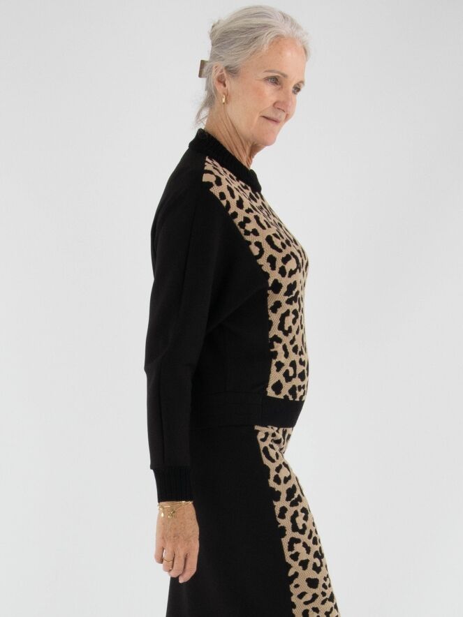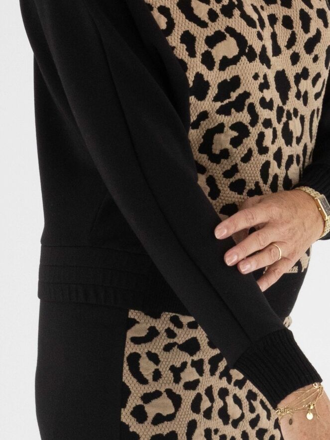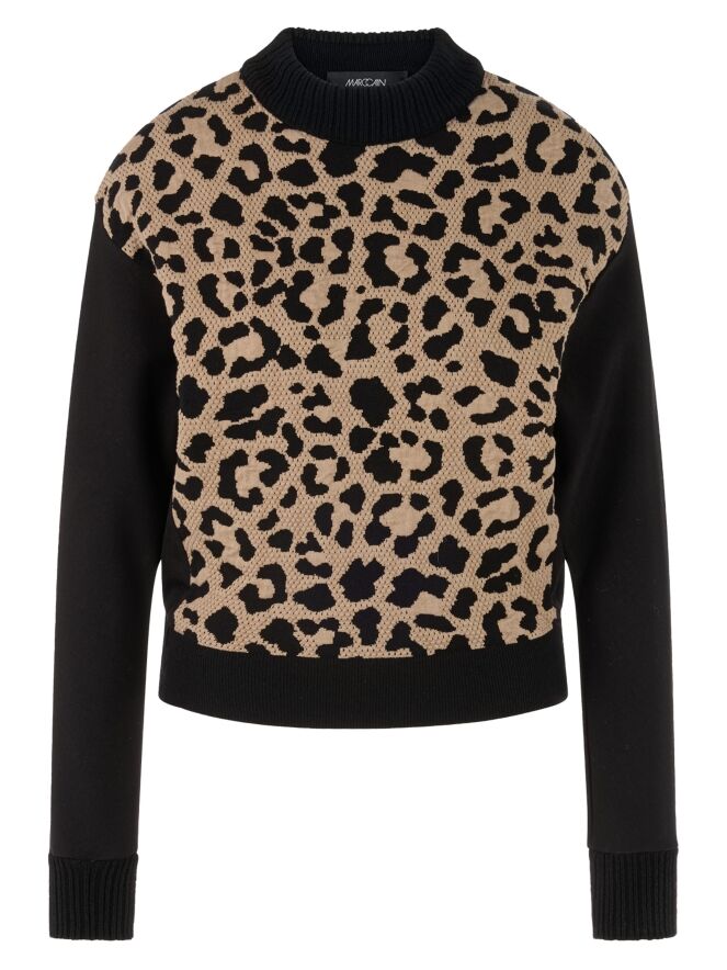 Un pull de Marc Cain avec un imprimé léopard en camel et noir sur un tissu finement perforé à l’avant, et un tissu scuba uni à l’arrière. L’encolure ronde et les extrémités des manches longues sont soulignées de bords-côtes en tricot. L’ourlet est doté d’une bande élastique plissée à l’arrière et d’un bord en tricot fin à l’avant. Ce pull peut être lavé à 30 degrés.