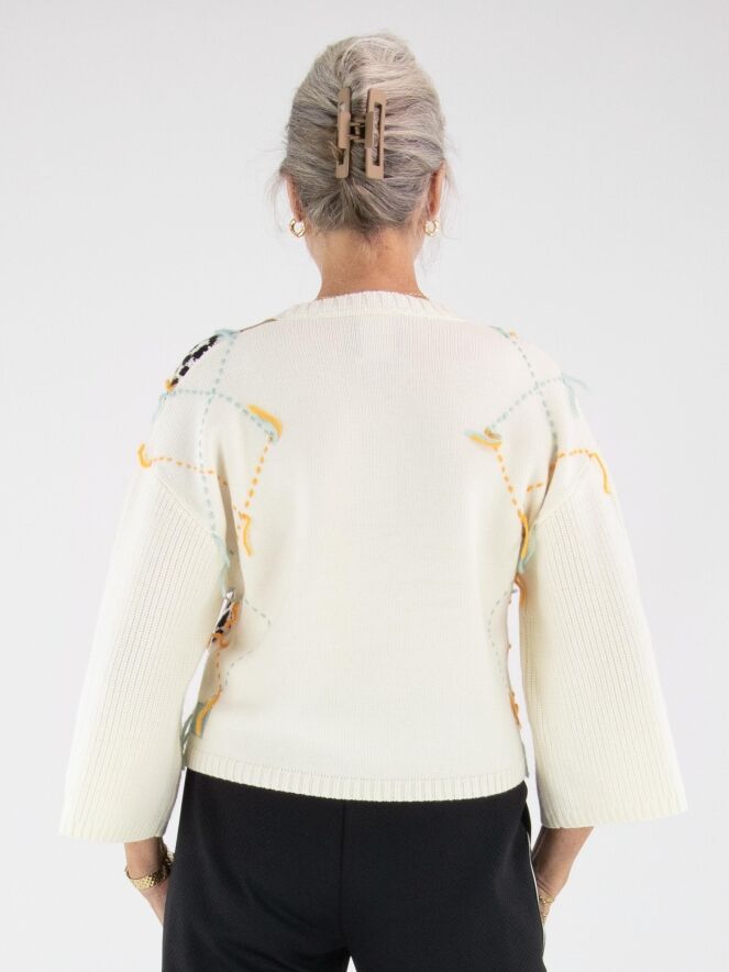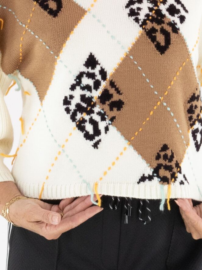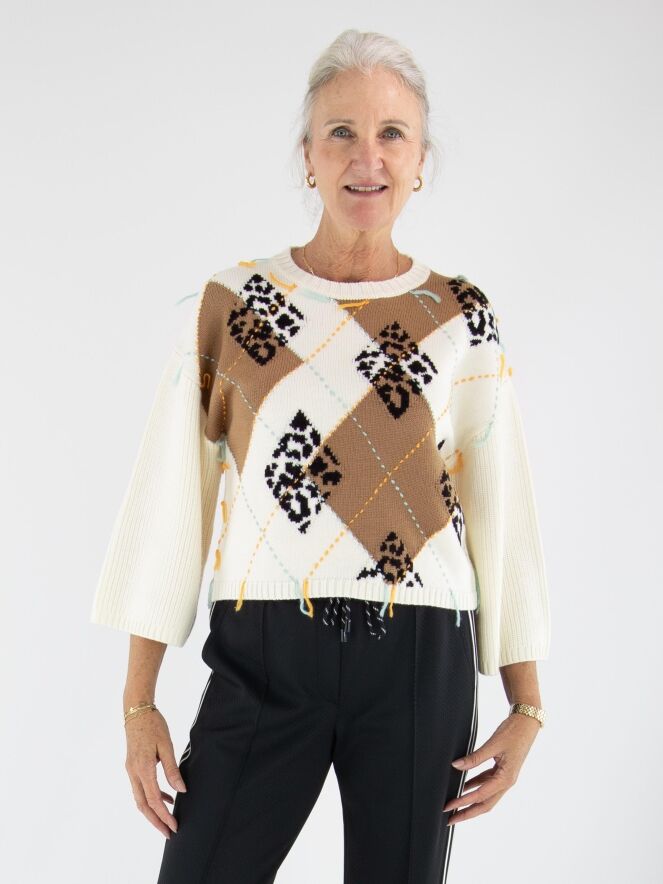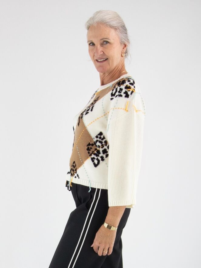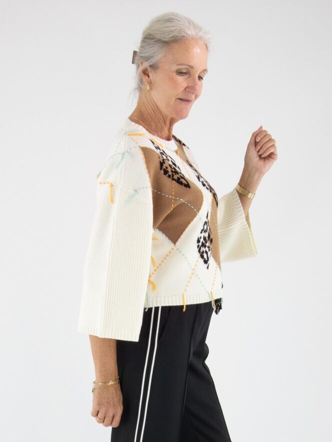 Ce pull Marc Cain présente sur le devant un motif argyle classique dans les tons camel, noir, turquoise et orange sur un fond blanc crème. Le dos est uni en blanc crème. Les manches mi-longues sont amples et apportent une touche moderne. Ce pull peut être lavé à la main.