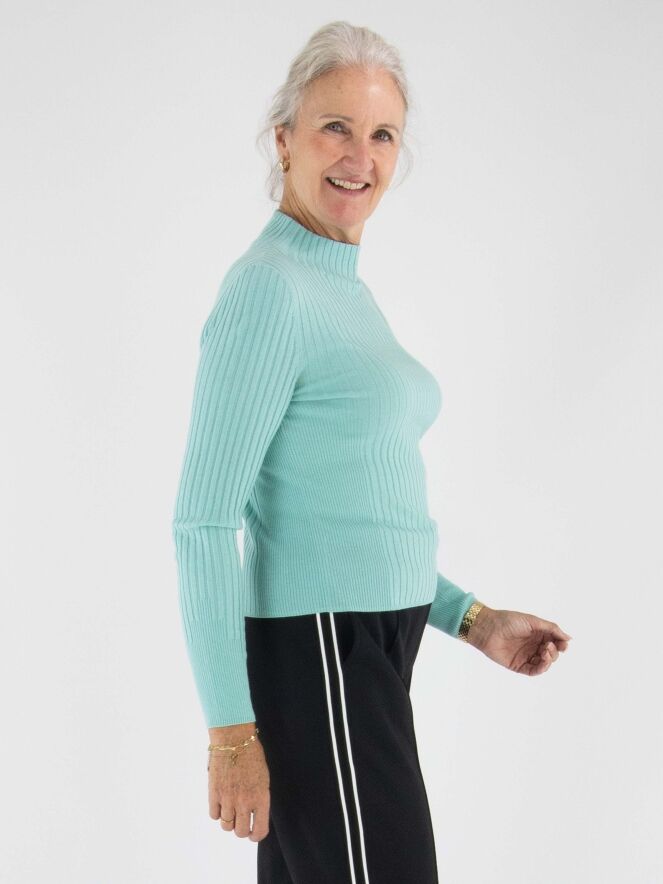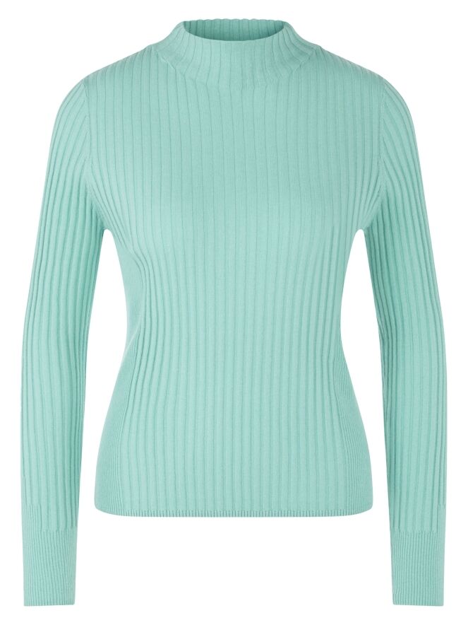 Un pull côtelé moderne de Marc Cain dans une teinte turquoise éclatante. Le modèle est doté d’un col montant élégant et de manches longues. Le tissu est délicatement côtelé sur les côtés, créant une silhouette élancée et féminine. Ce pull peut être lavé à la main.