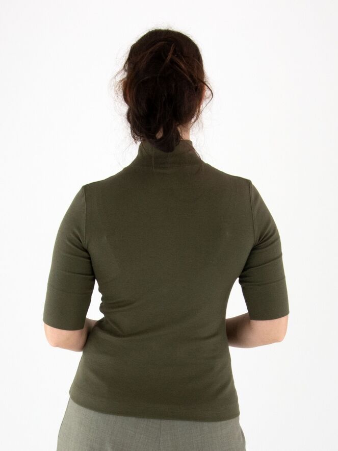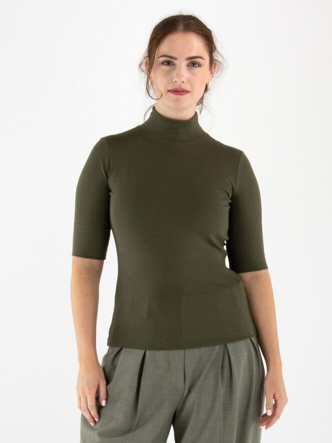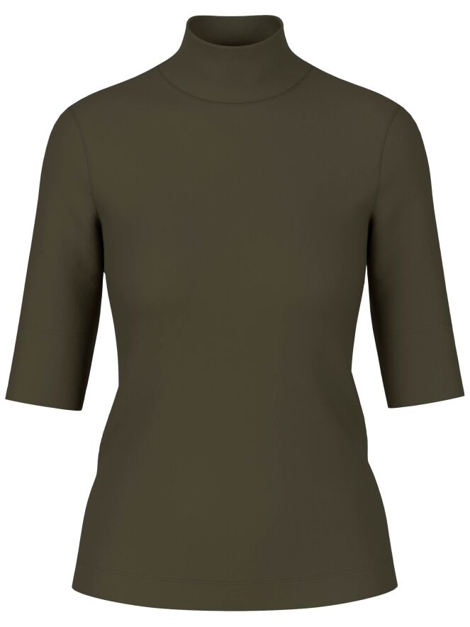 T-shirt Marc Cain en vert olive. Le tissu est finement côtelé. Le t-shirt a un col montant, des manches courtes et peut être lavé à 30 degrés.