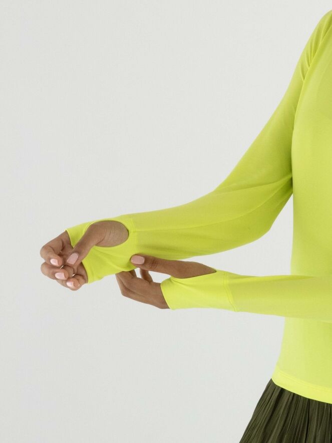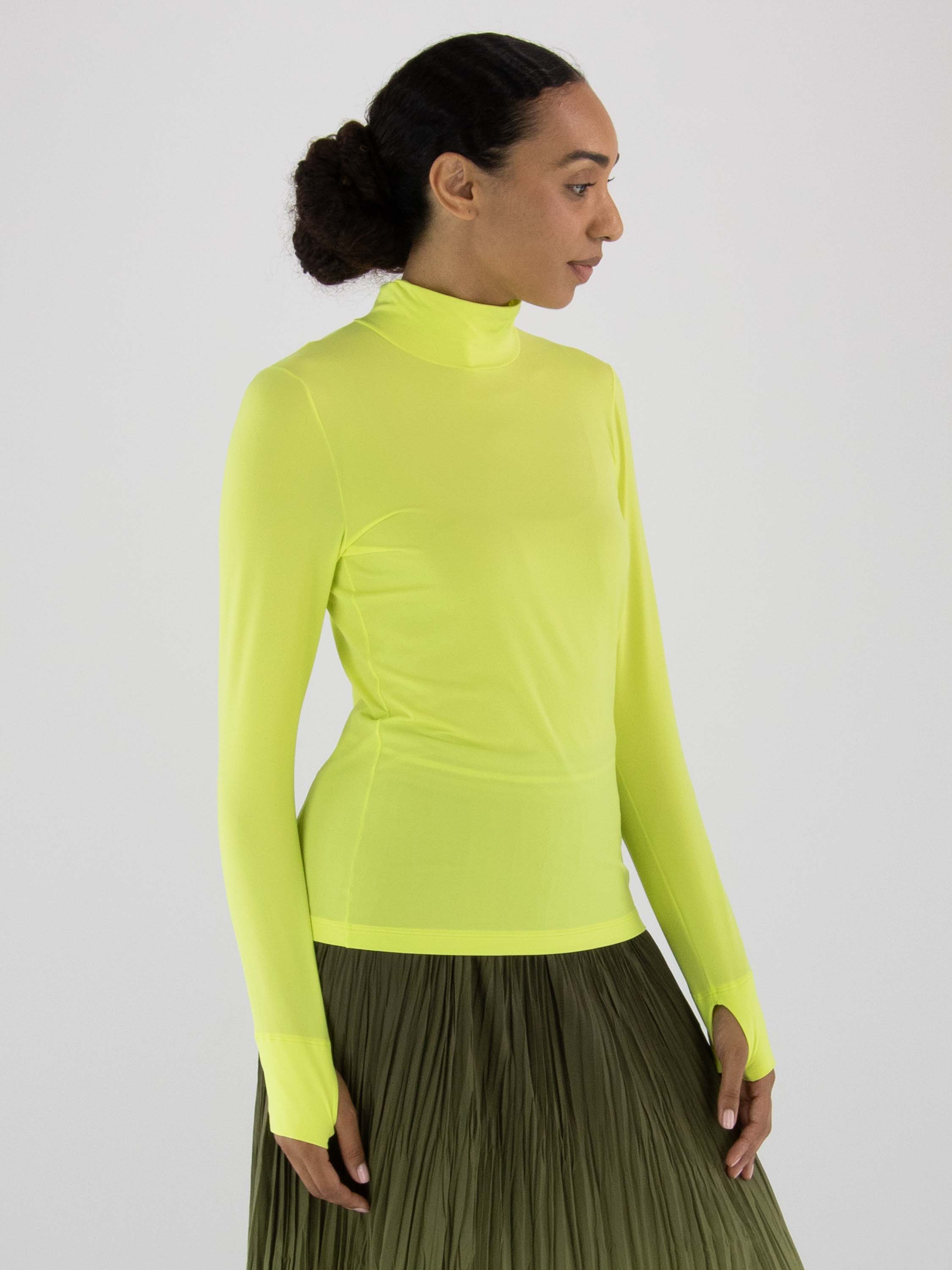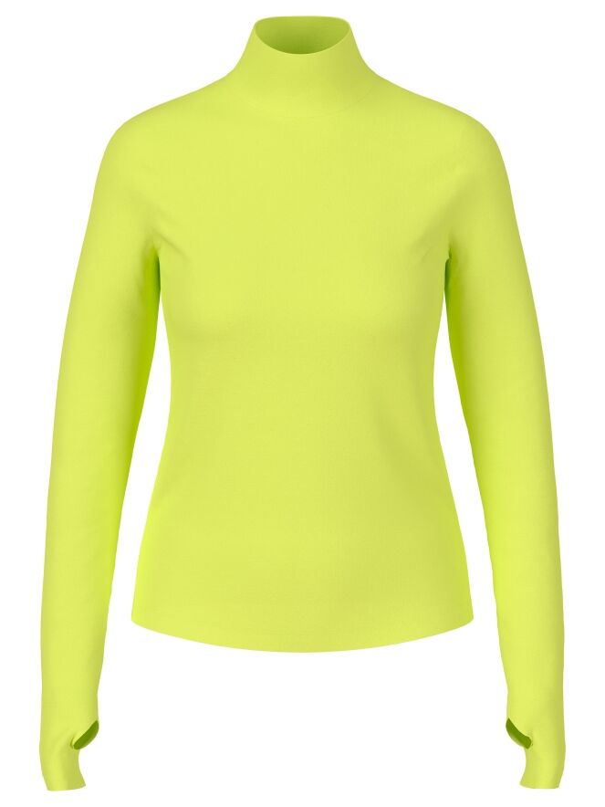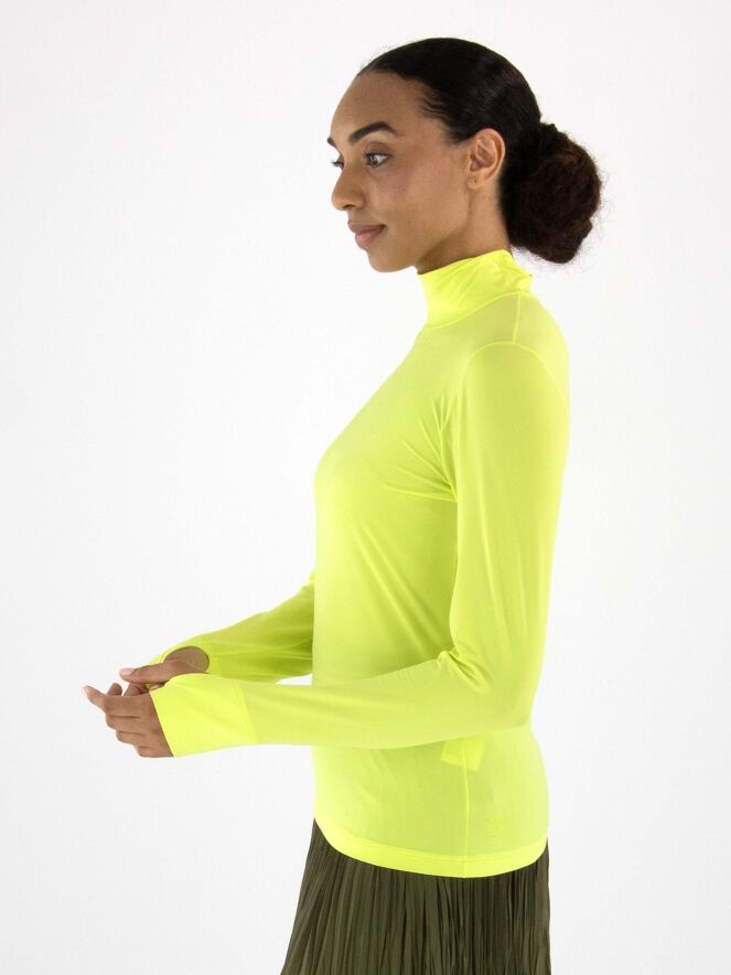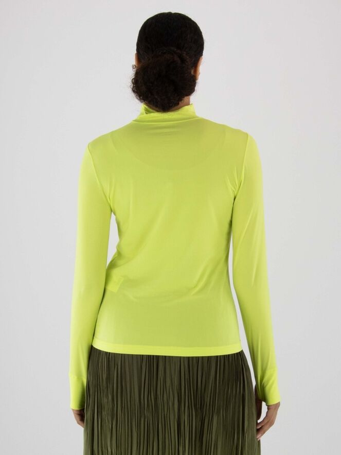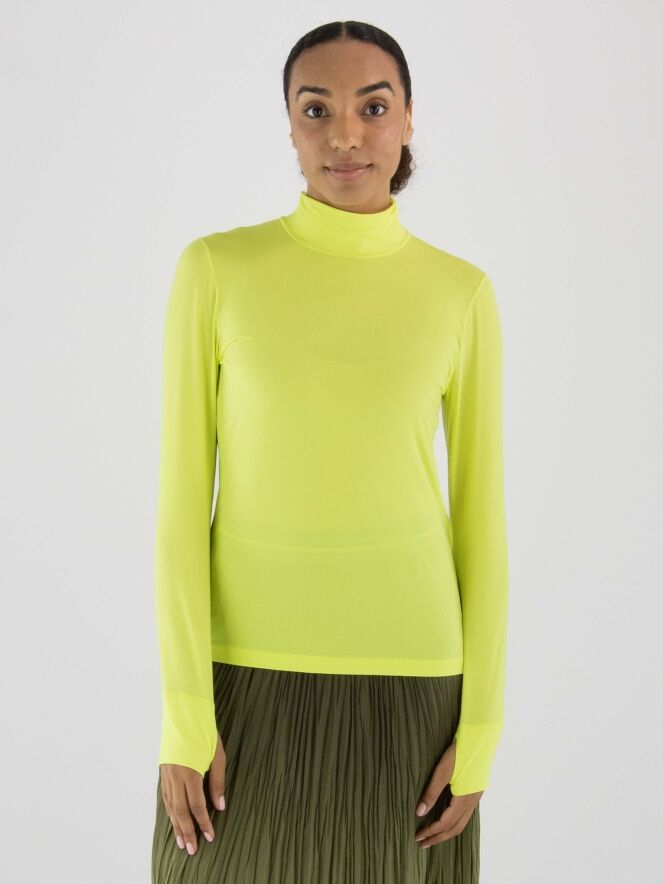 T-shirt seconde peau de la marque Marc Cain en vert citron. Ce modèle épouse parfaitement les formes et présente une coupe légèrement cintrée. Il est doté d’un col roulé et de manches longues. Ce t-shirt peut être lavé à 30 degrés.