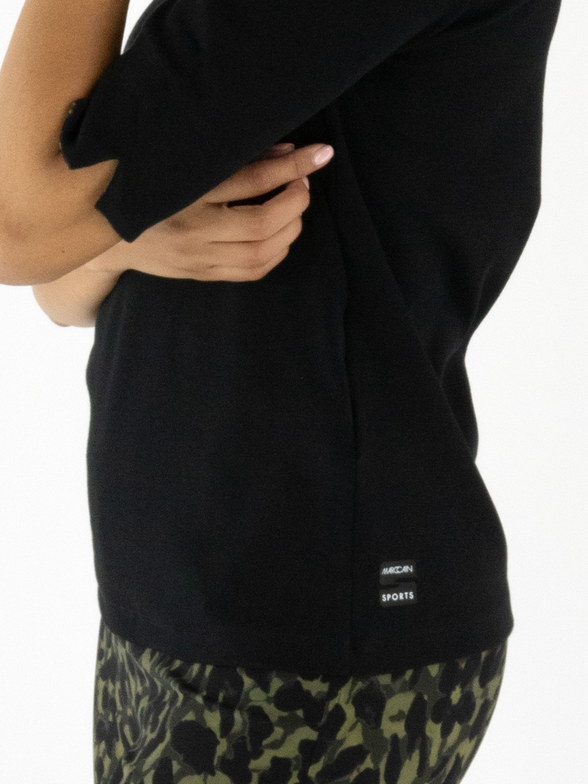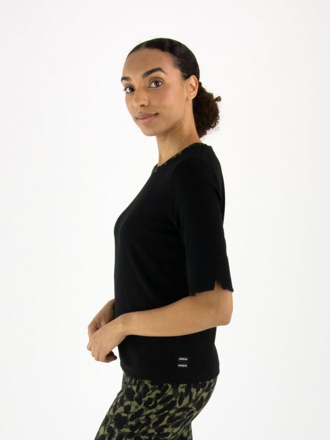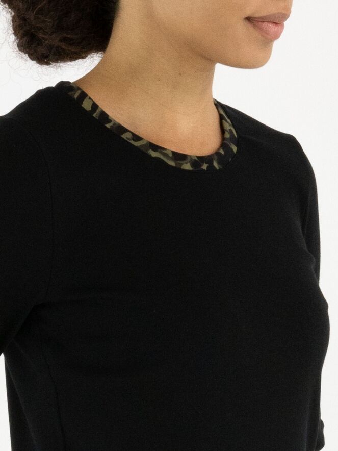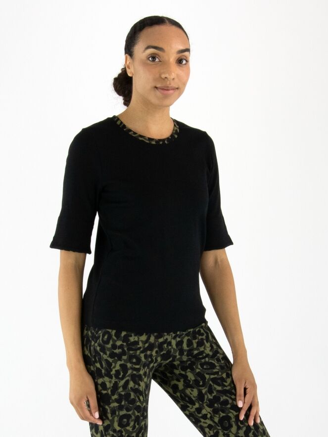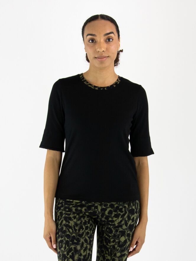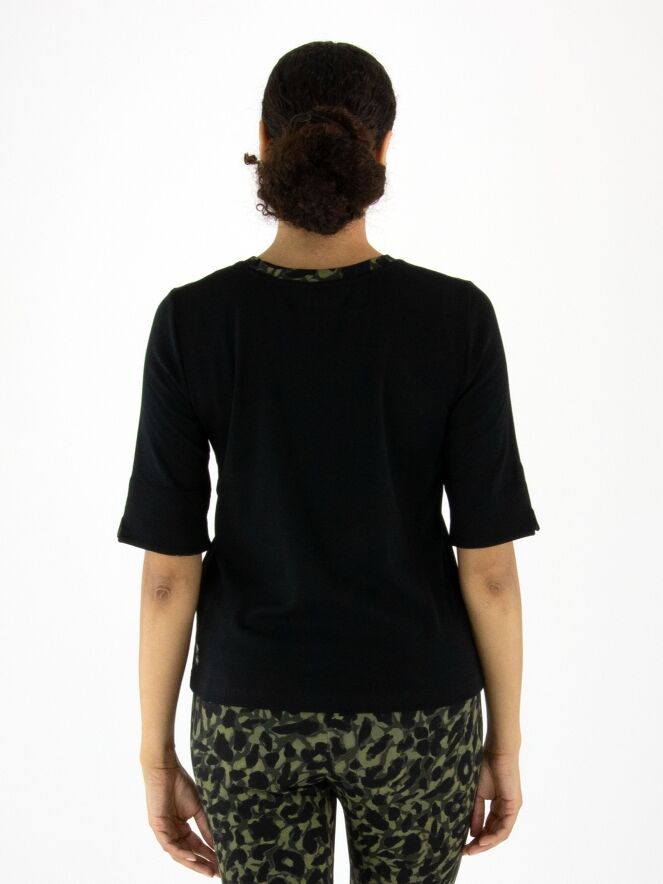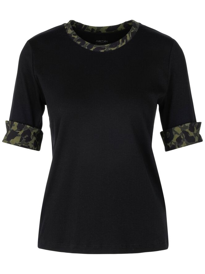 T-shirt noir de Marc Cain. L’encolure ronde et les bords des manches courtes sont soulignés par un imprimé camouflage dans différentes nuances de vert olive et de noir. Ce t-shirt peut être lavé à 30 degrés.