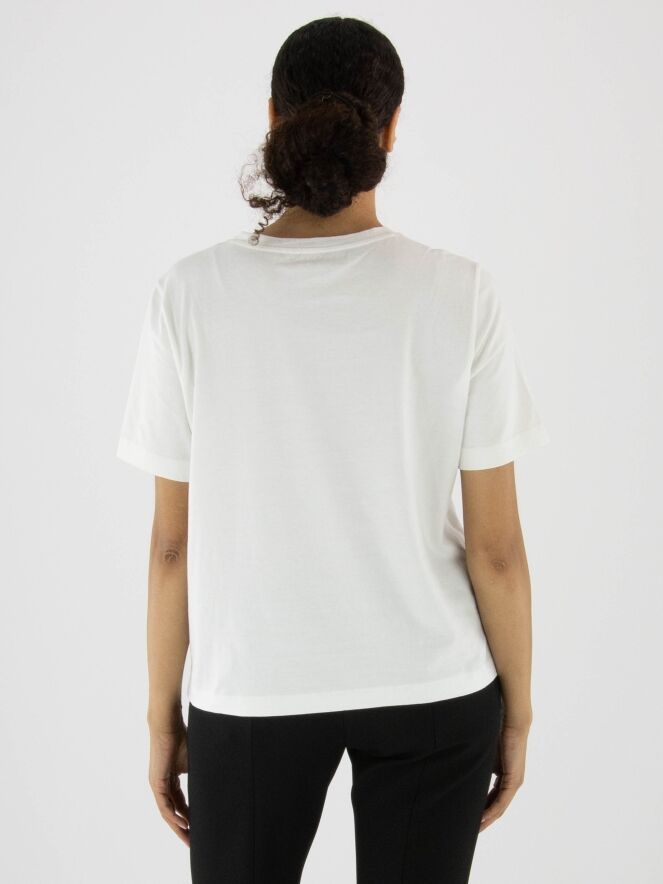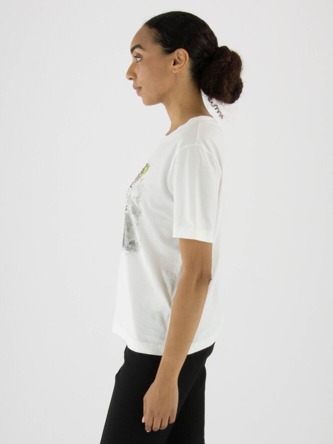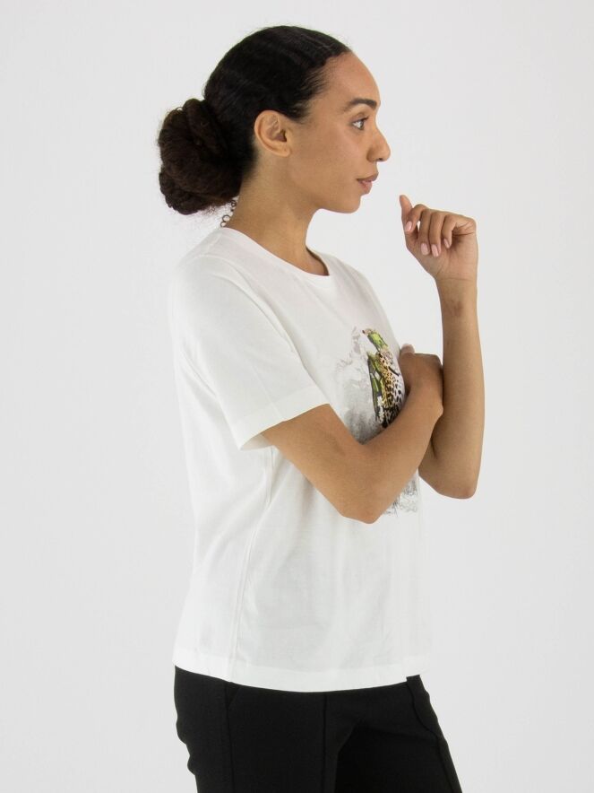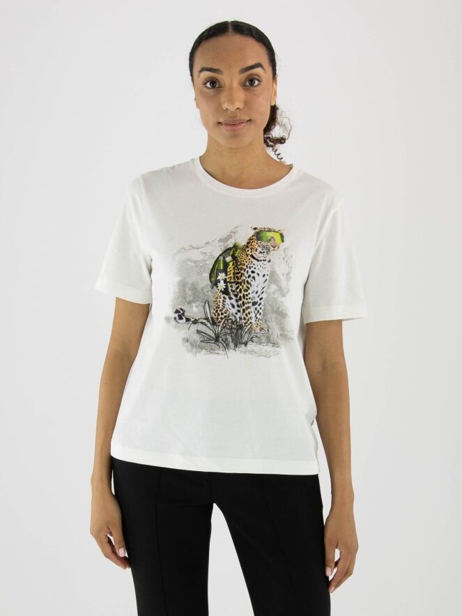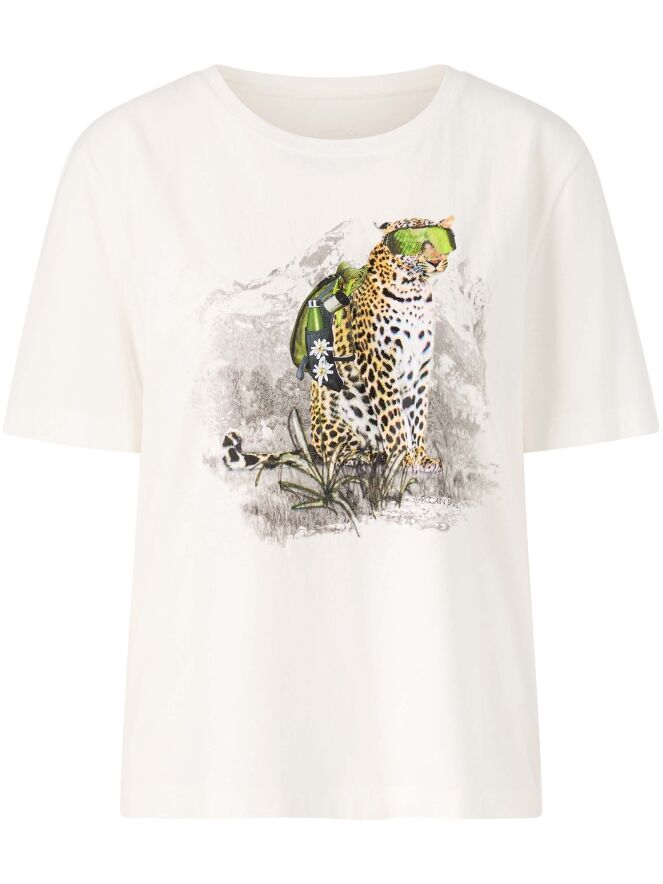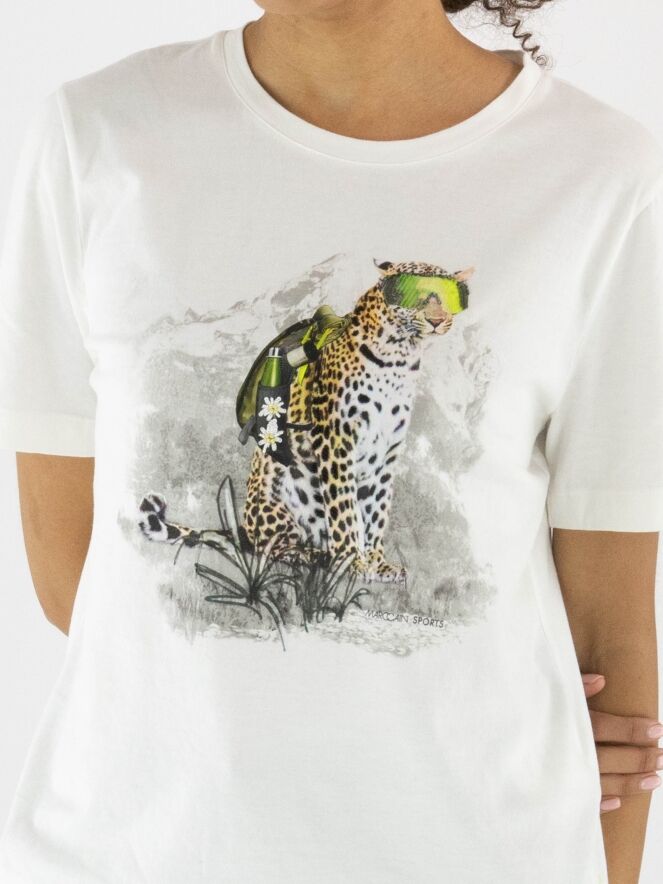 T-shirt Marc Cain en blanc cassé avec un imprimé sur le devant représentant un léopard portant des lunettes de soleil. Le t-shirt a des manches courtes et un col rond. Ce t-shirt peut être lavé à 30 degrés.
