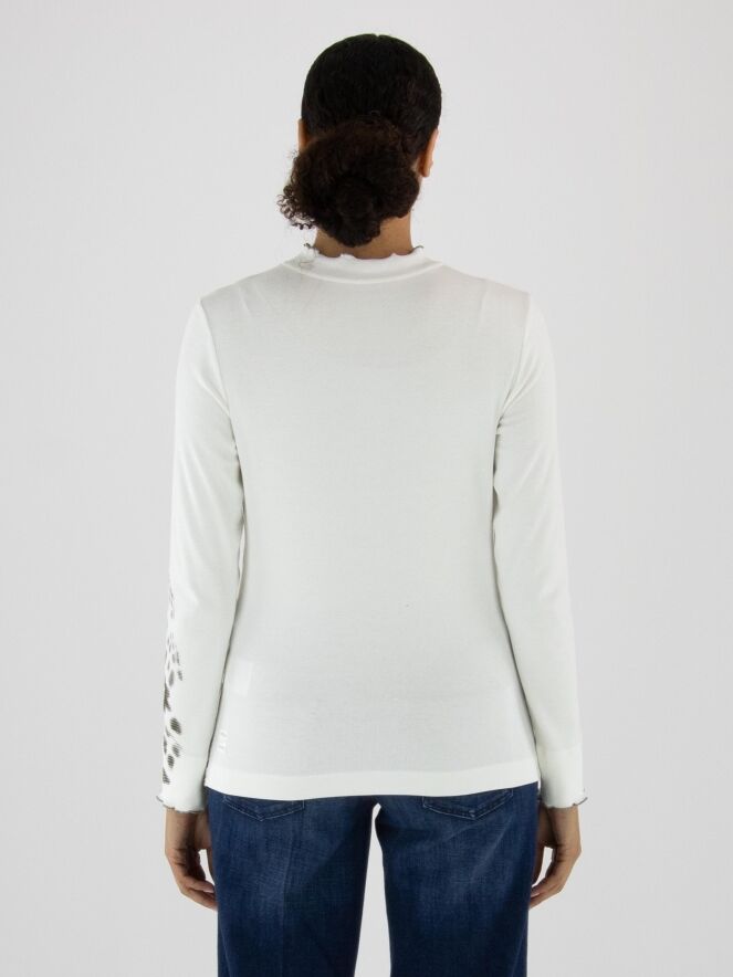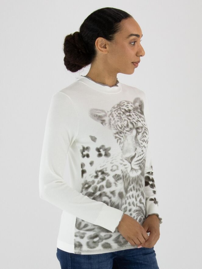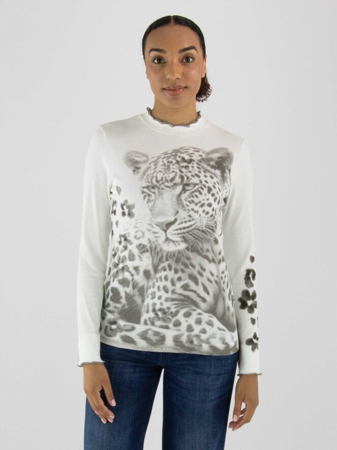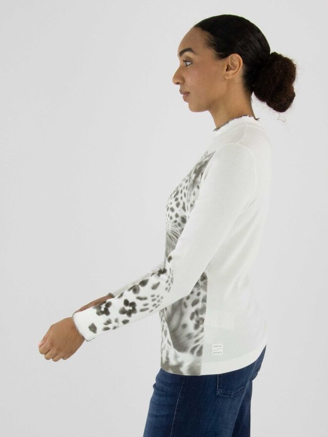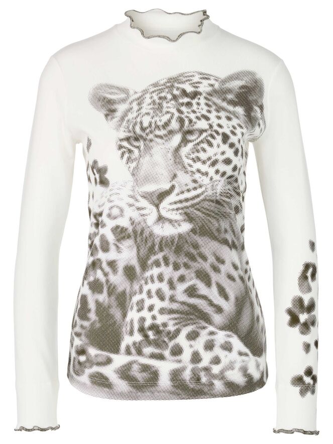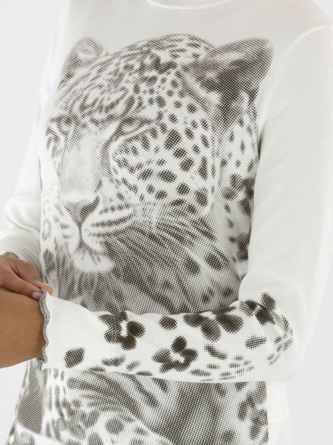 T-shirt Marc Cain avec un imprimé léopard graphique dans des tons de vert olive sur un fond blanc cassé. L'encolure ronde est soulignée par un double bord ondulé et côtelé avec une finition vert olive. Les poignets sont dotés d’un bord finement côtelé à l’effet ondulé. Ce t-shirt peut être lavé à 30 degrés.