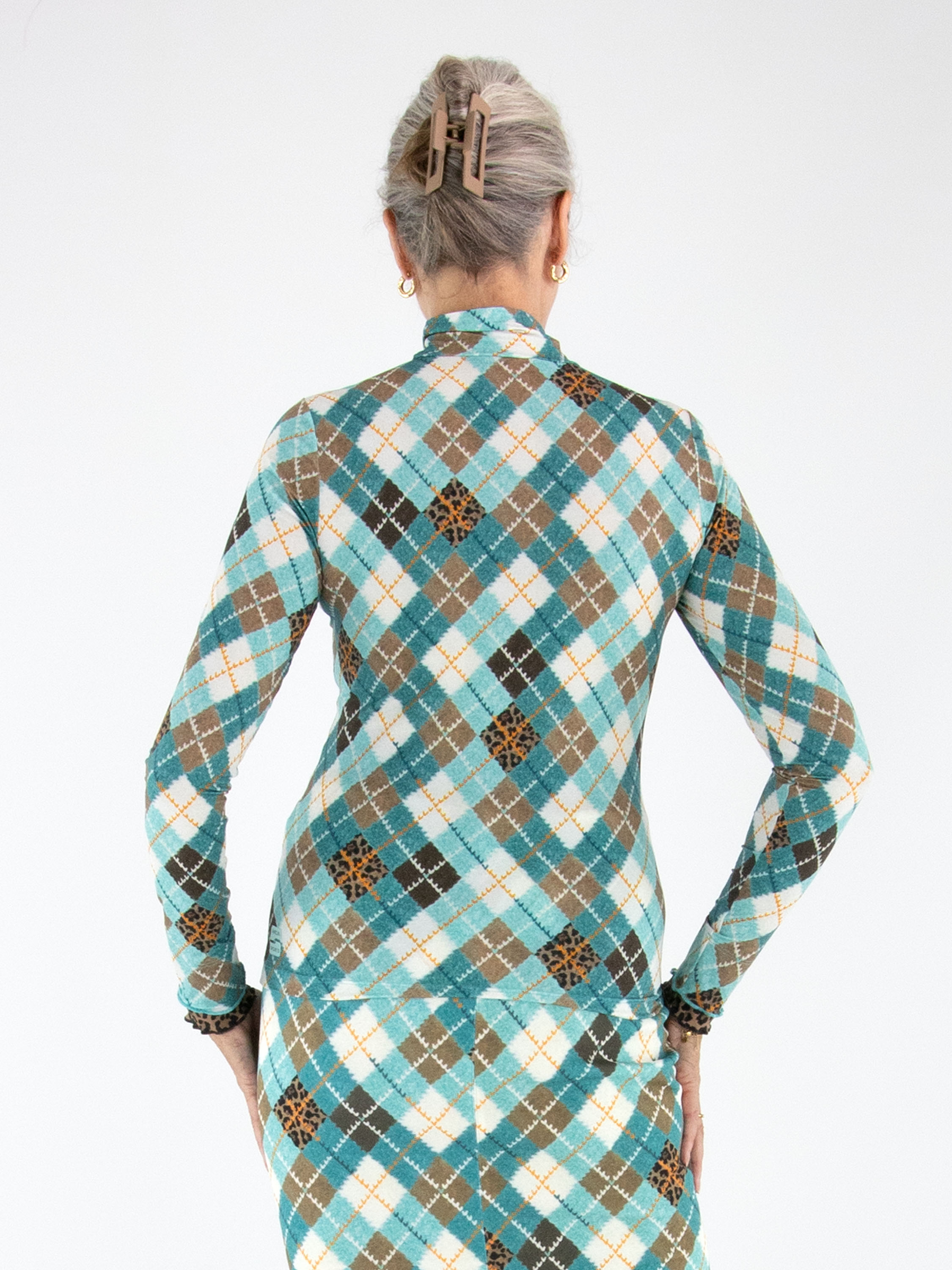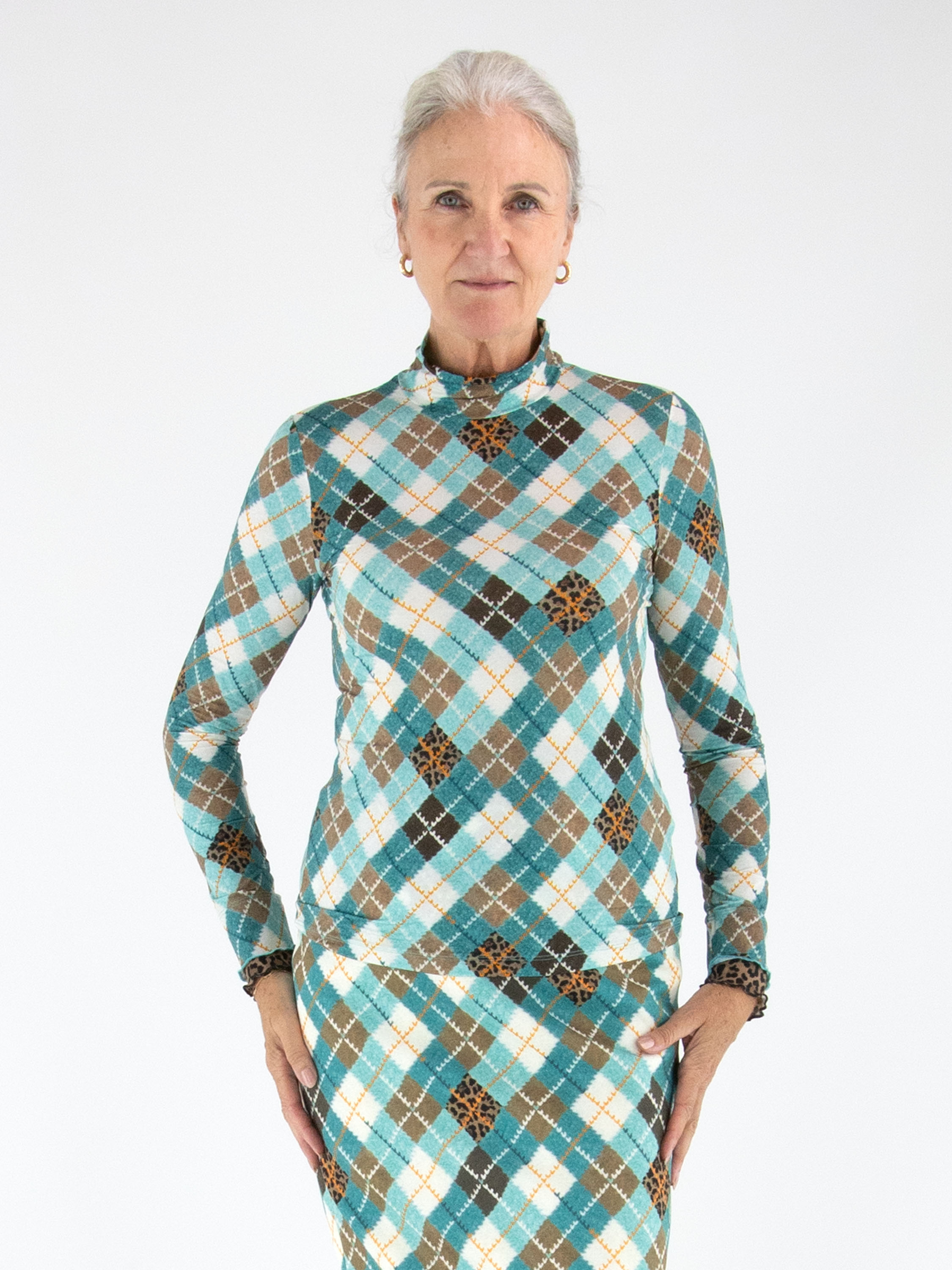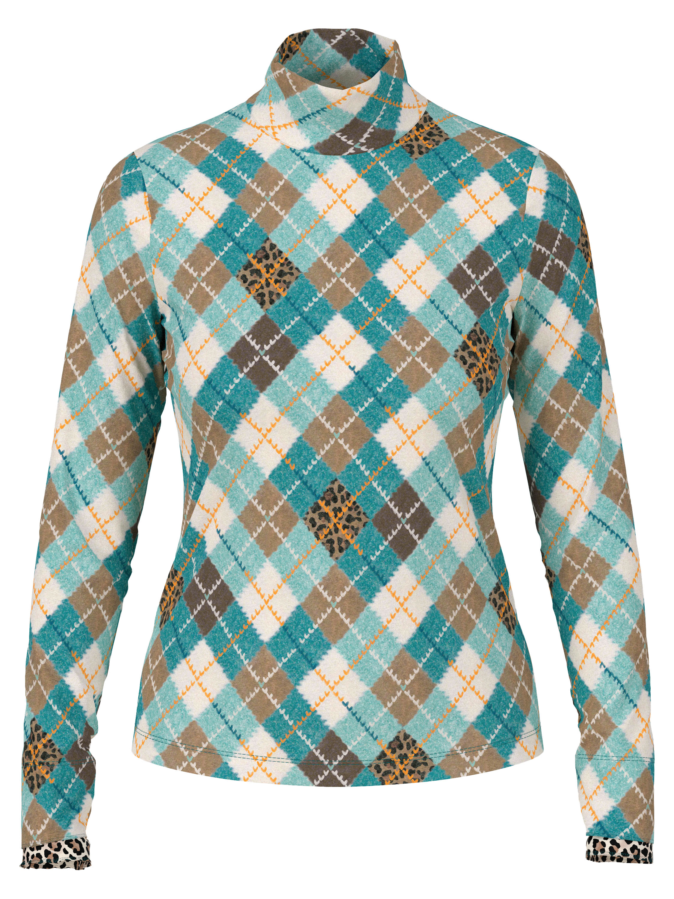 Un haut élégant de Marc Cain en matière scuba confortable. Le modèle présente un motif argyle audacieux décliné dans des tons turquoise, brun, orange et blanc cassé. Il est doté d’un col montant moderne et de manches longues. Les poignets sont rehaussés d’un tissu double en tricot finement côtelé à imprimé léopard dans des nuances de noir et de brun, créant un contraste ludique. Ce haut peut être lavé à 30 degrés.