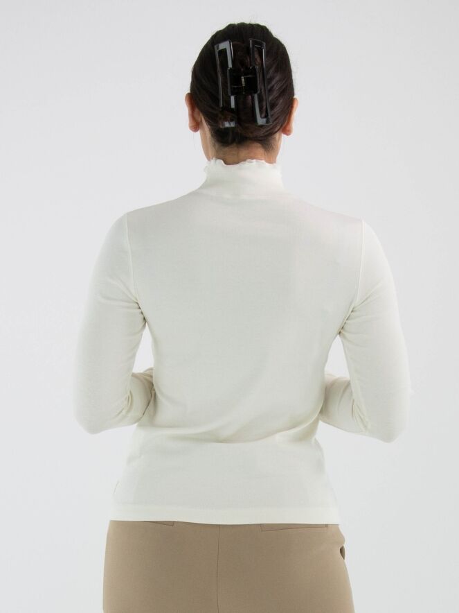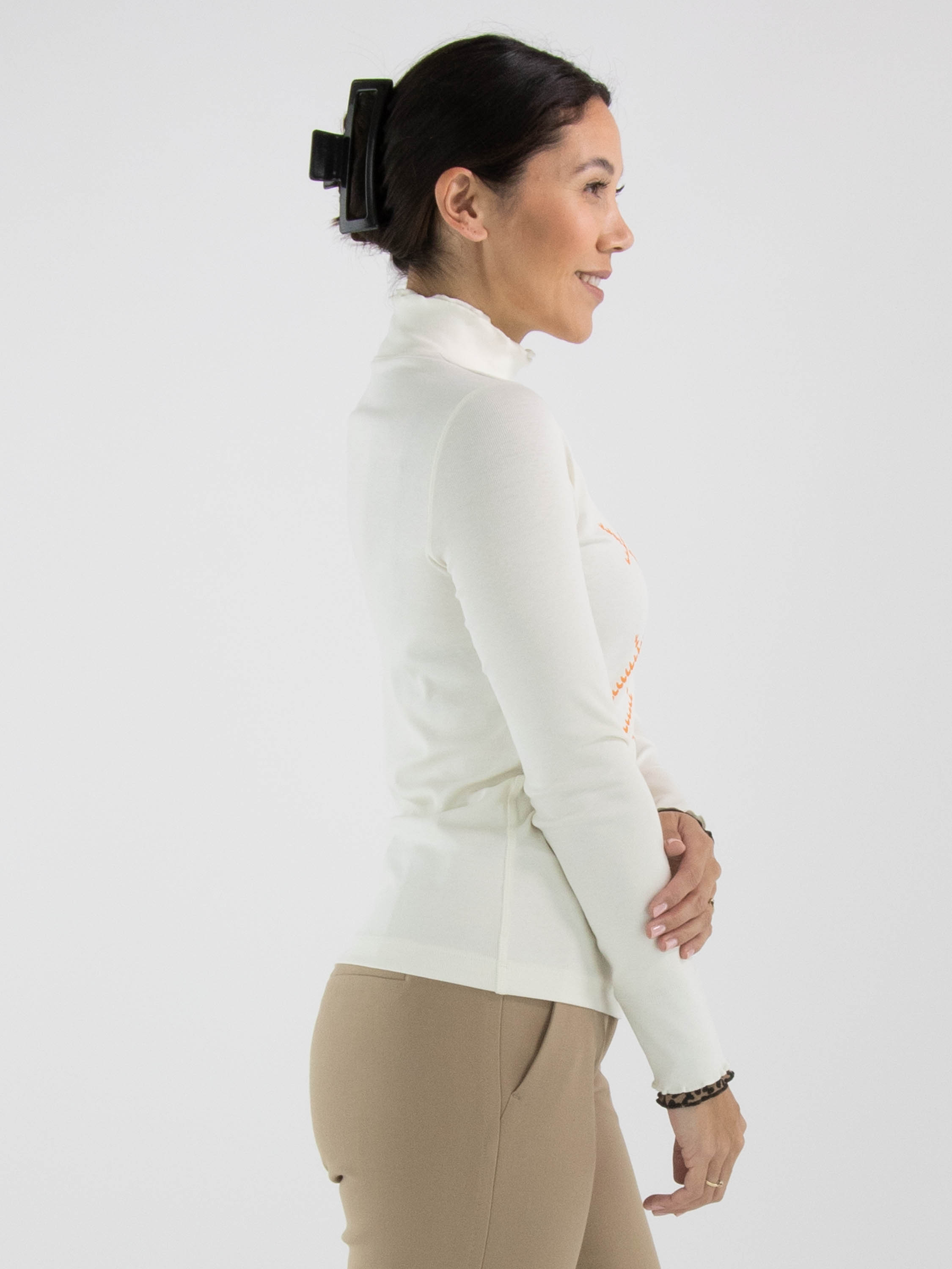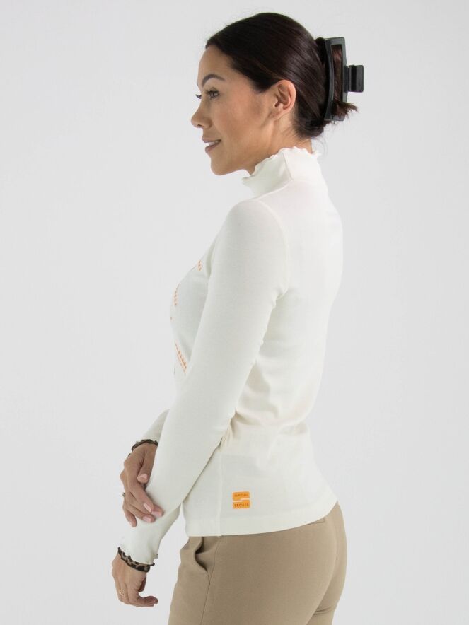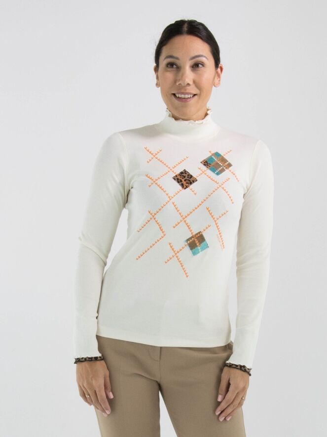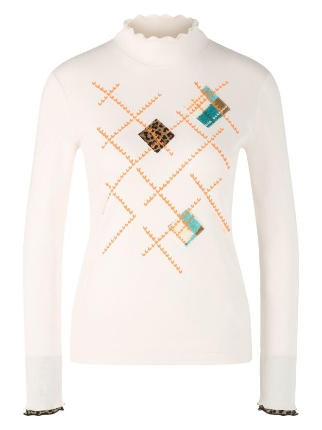 Un pull finement côtelé de Marc Cain en blanc cassé, orné sur le devant d’un élégant motif argyle décliné dans des tons turquoise, brun et orange. Le modèle est doté d’un col montant délicatement côtelé et de manches longues. Les poignets sont agrémentés d’un détail en double tricot finement côtelé à imprimé léopard dans des nuances de noir et de brun, apportant un contraste ludique. Ce pull peut être lavé à 30 degrés.