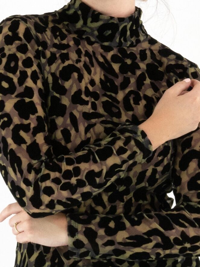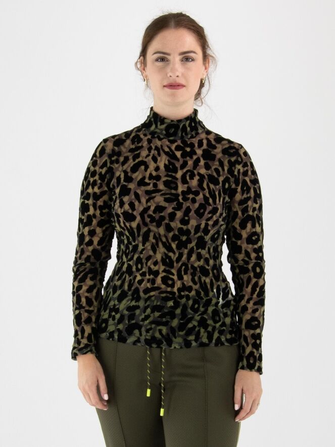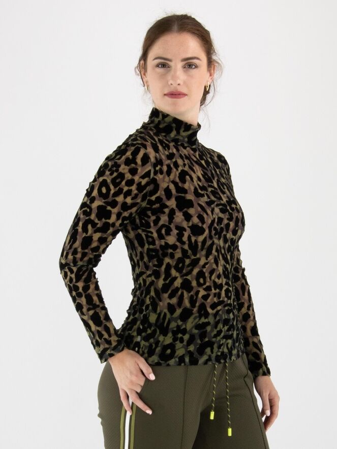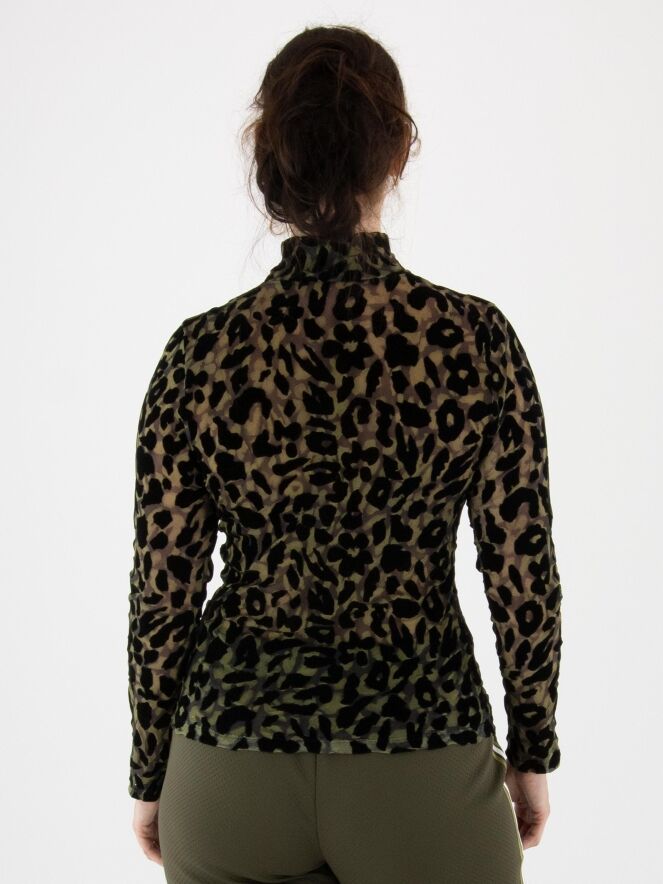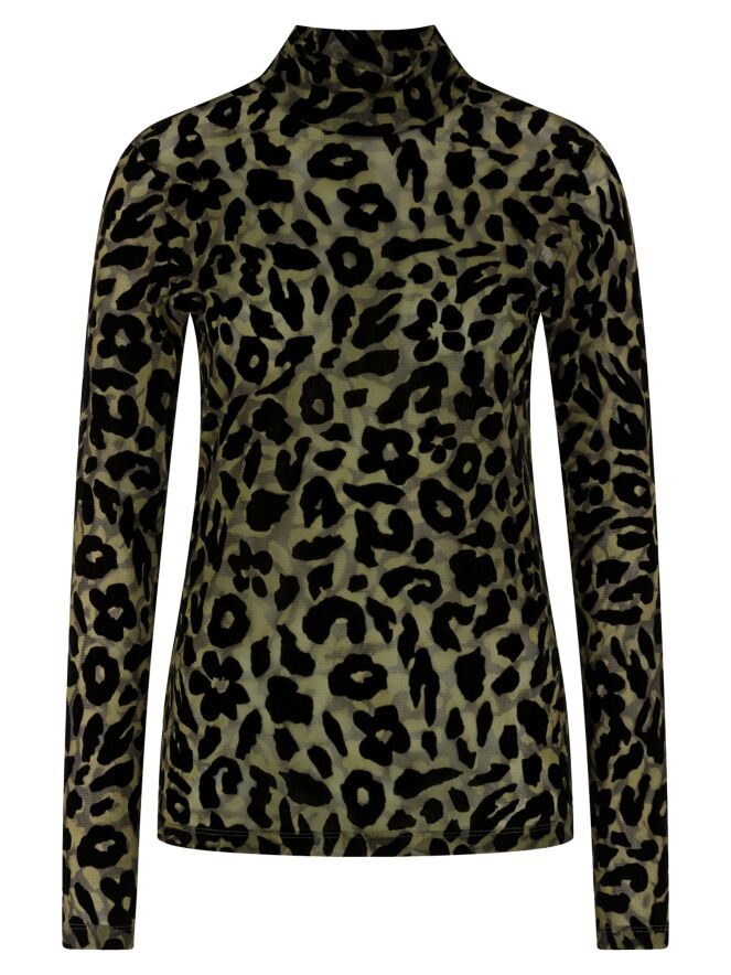 T-shirt semi-transparent Marc Cain avec un imprimé léopard dans plusieurs nuances de vert olive et de noir. Le t-shirt a un col roulé et des manches longues. Ce t-shirt peut être lavé à 30 degrés.
