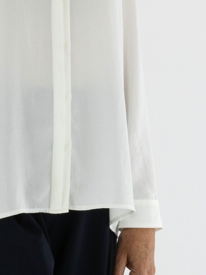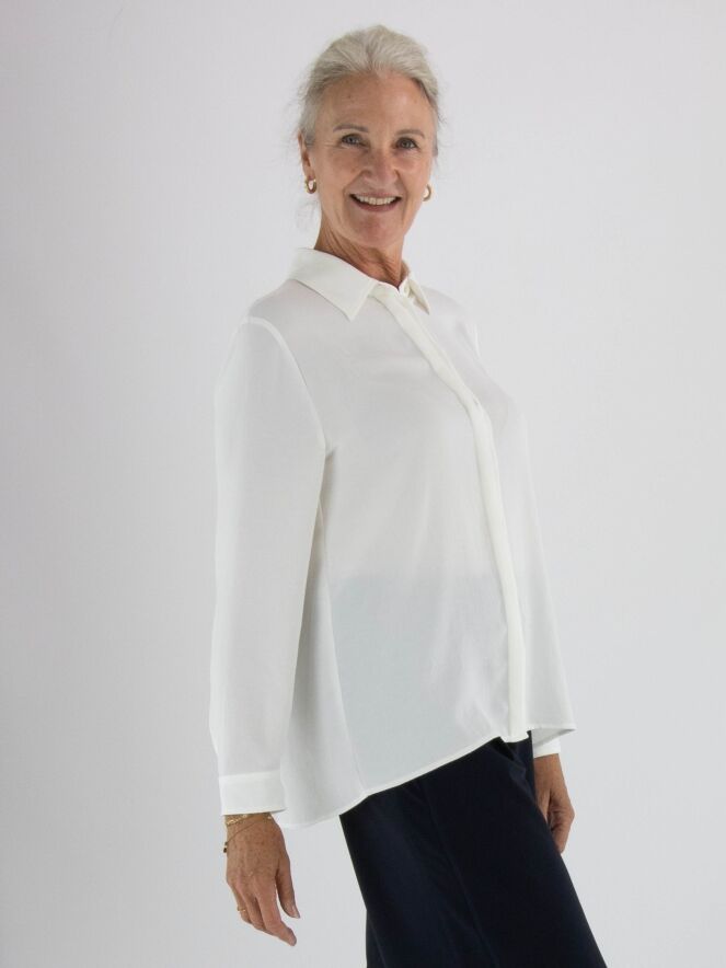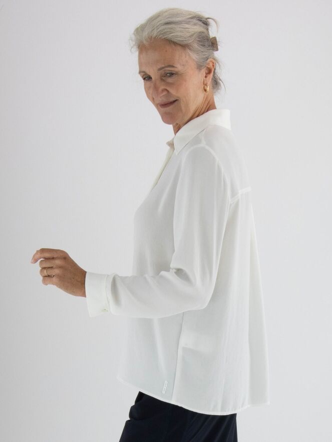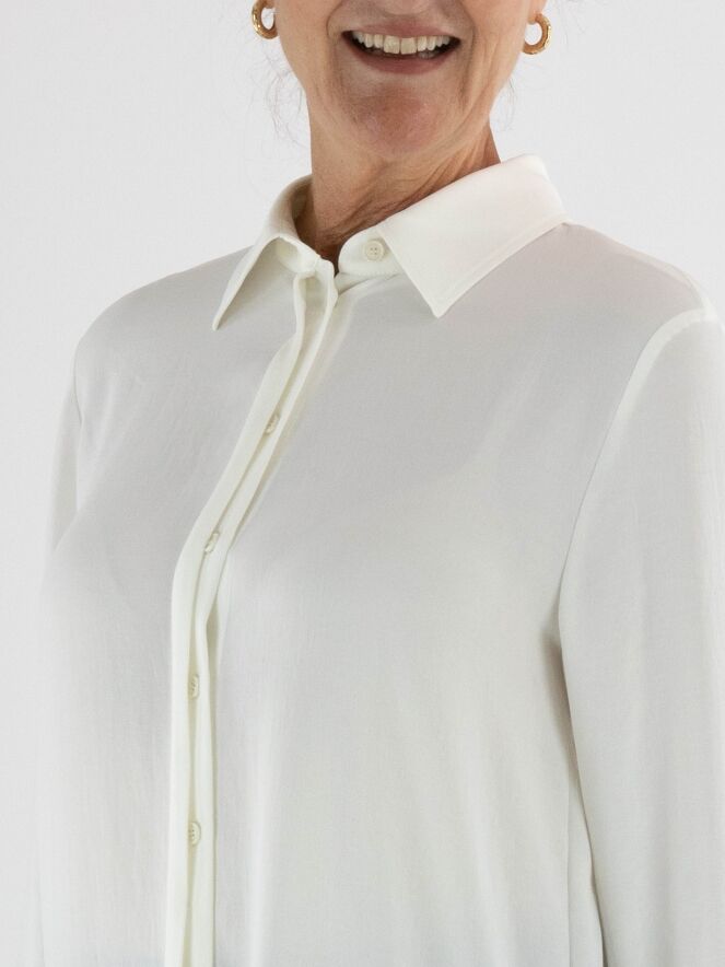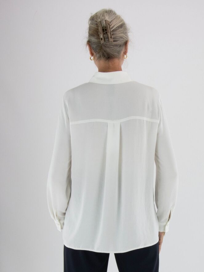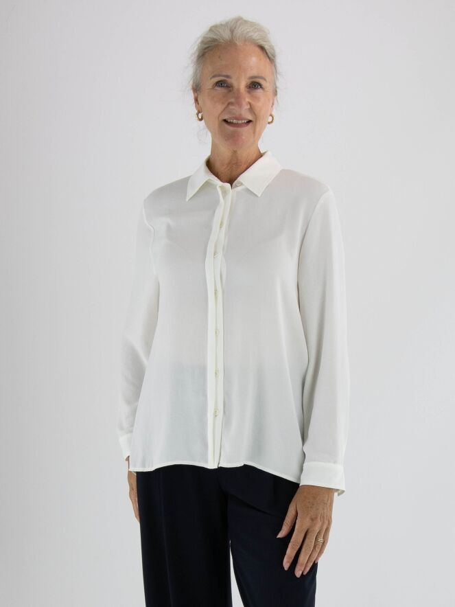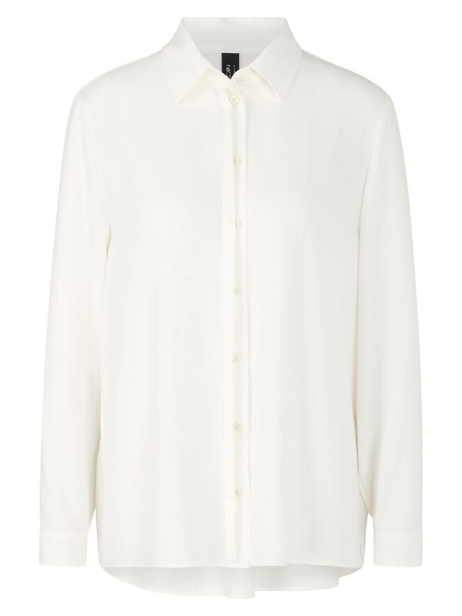 Blouse Marc Cain en blanc cassé. Elle est dotée d’une patte de boutonnage invisible et peut être lavée à 30 degrés.
