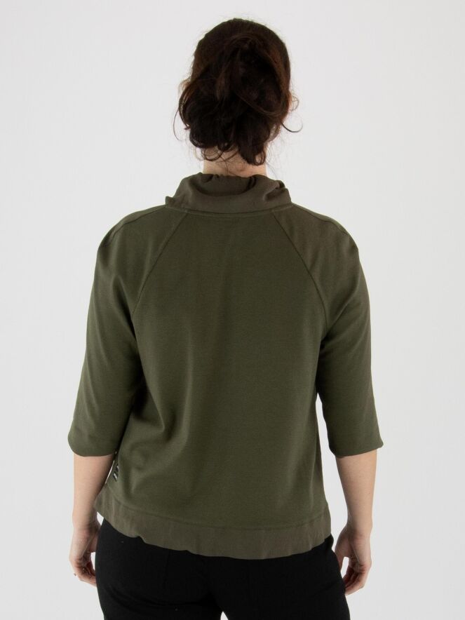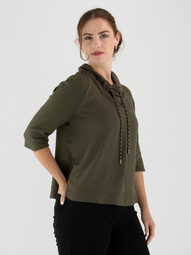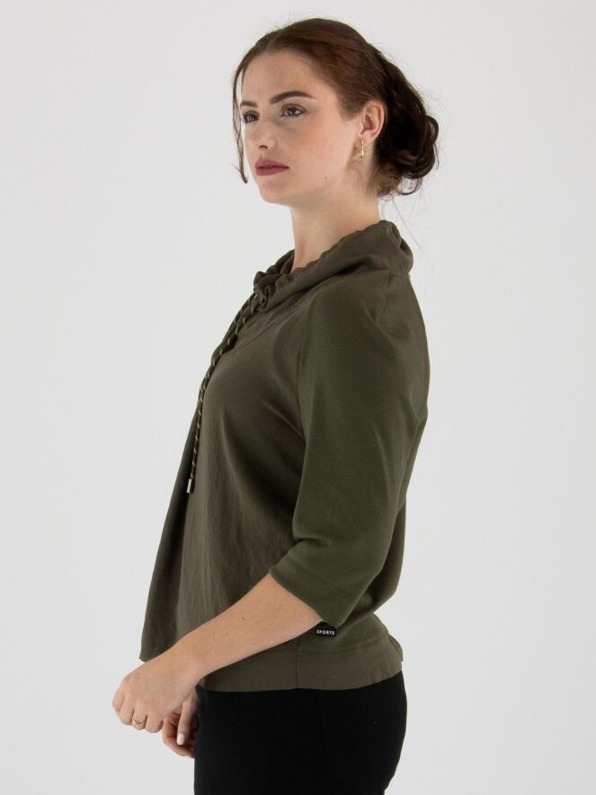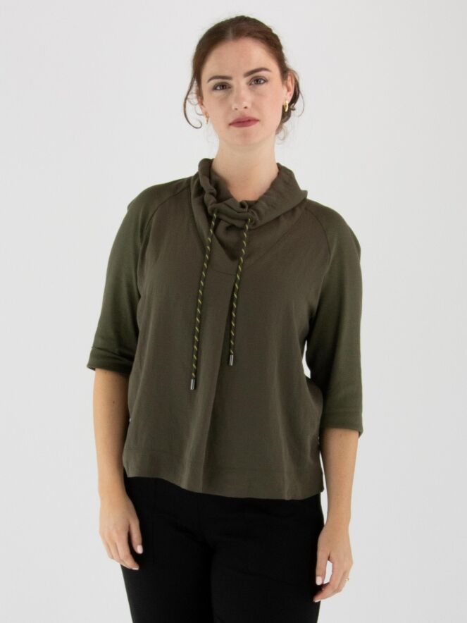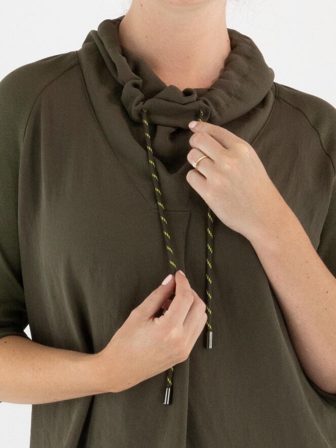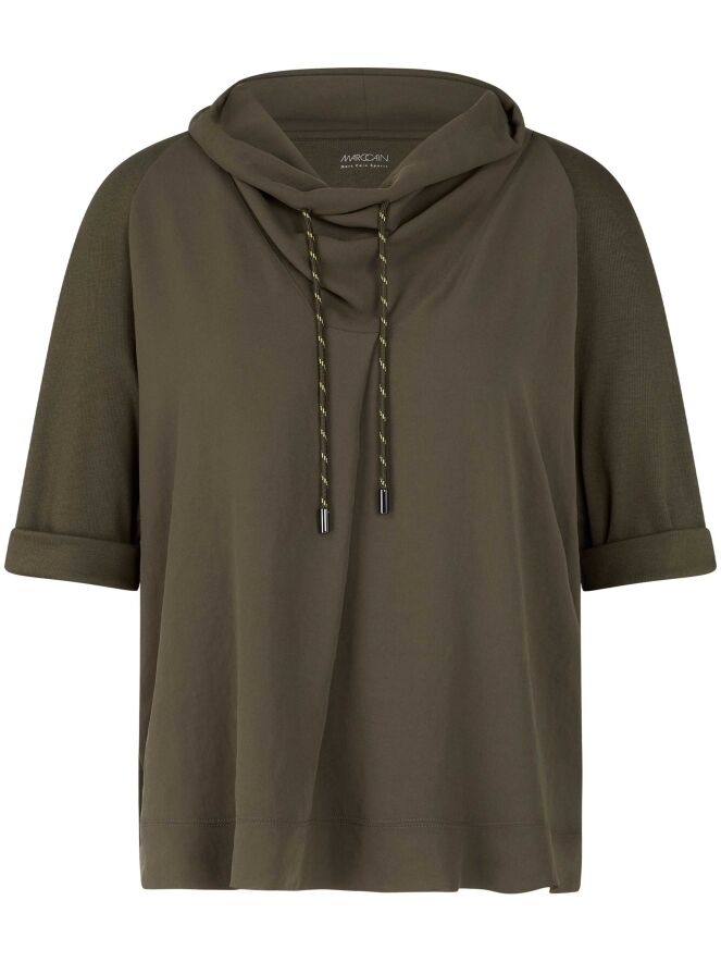 T-shirt Marc Cain en vert olive. Un cordon est inséré dans la bordure de l'encolure drapée. Les manches courtes sont dotées d’un revers. Ce t-shirt peut être lavé à 30 degrés.
