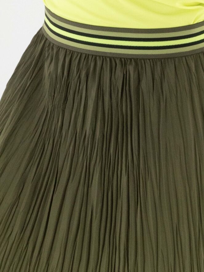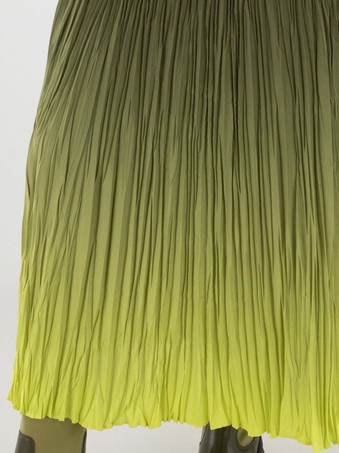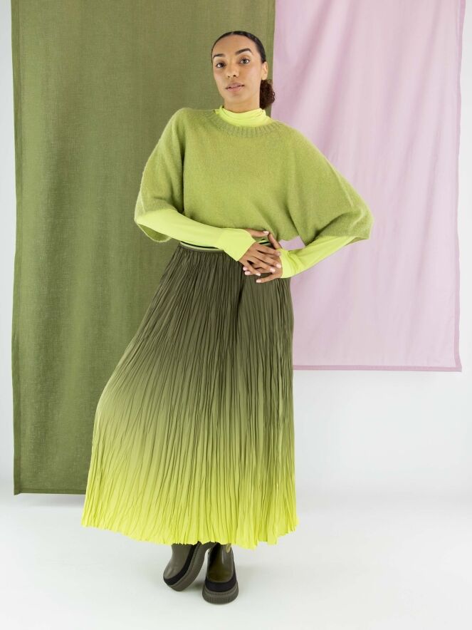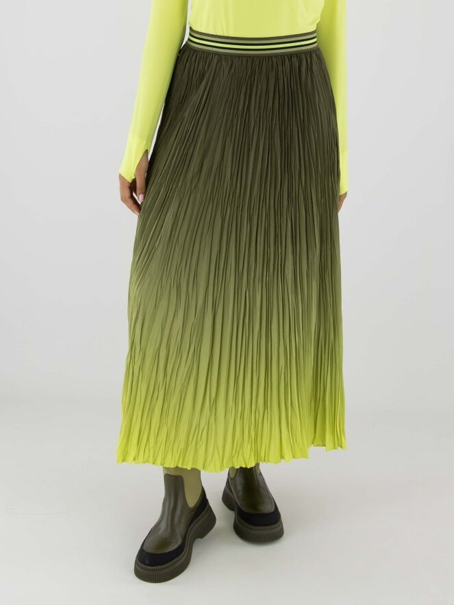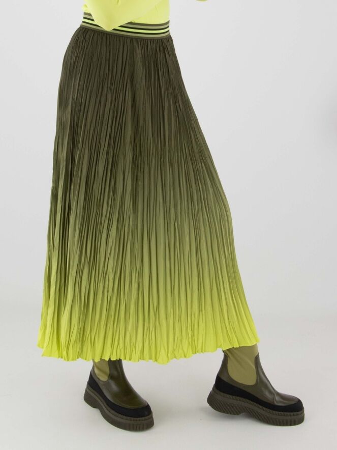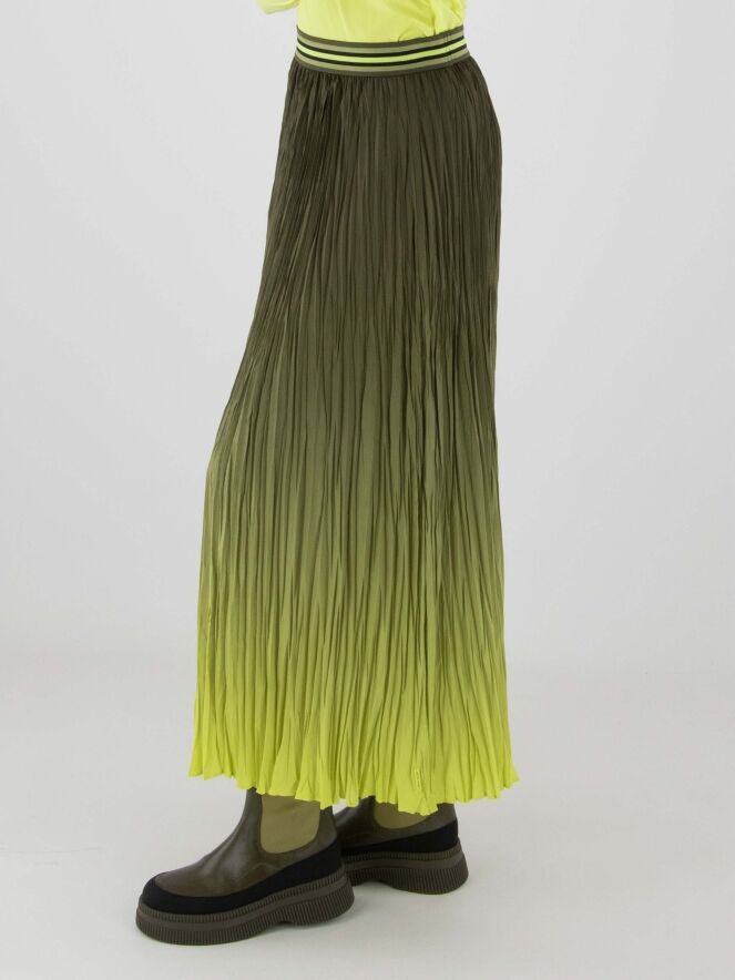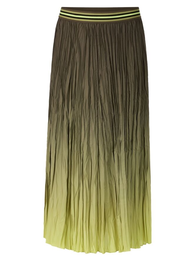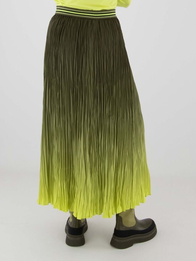 Jupe plissée de Marc Cain avec un dégradé d’olive à vert citron. La taille est dotée d’une ceinture élastique à motif rayé. Cette jupe peut être lavée à 30 degrés.